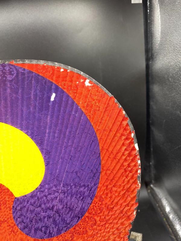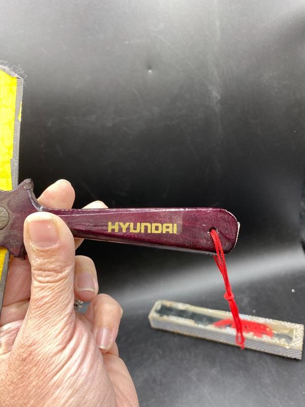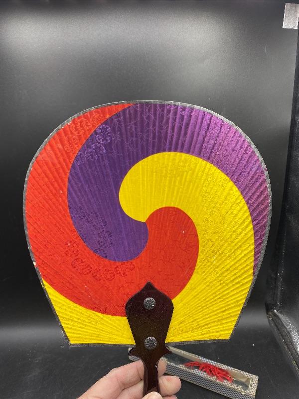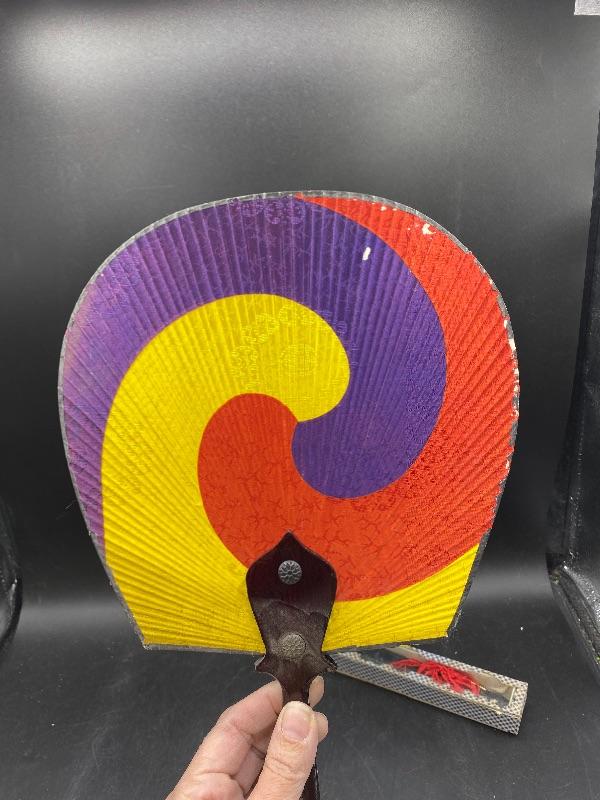 Pair of vintage handheld fans. The colorful one is from Hyundai, made in Korea. It does not fold up, and does have signs of age/wear. The fold up black fan is made of plastic, from Hong Kong. The box it is in is falling apart, but is interesting as the lid is made of glass not plastic. Great for display.