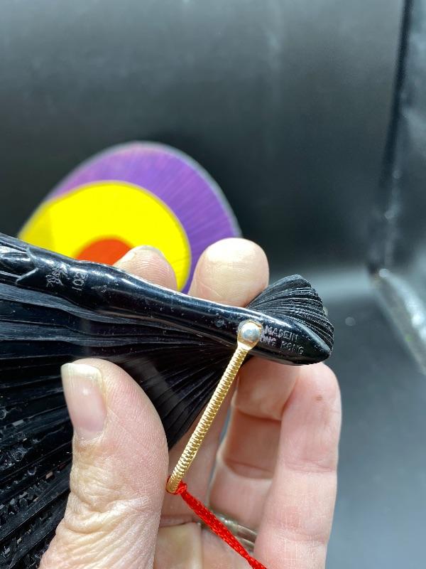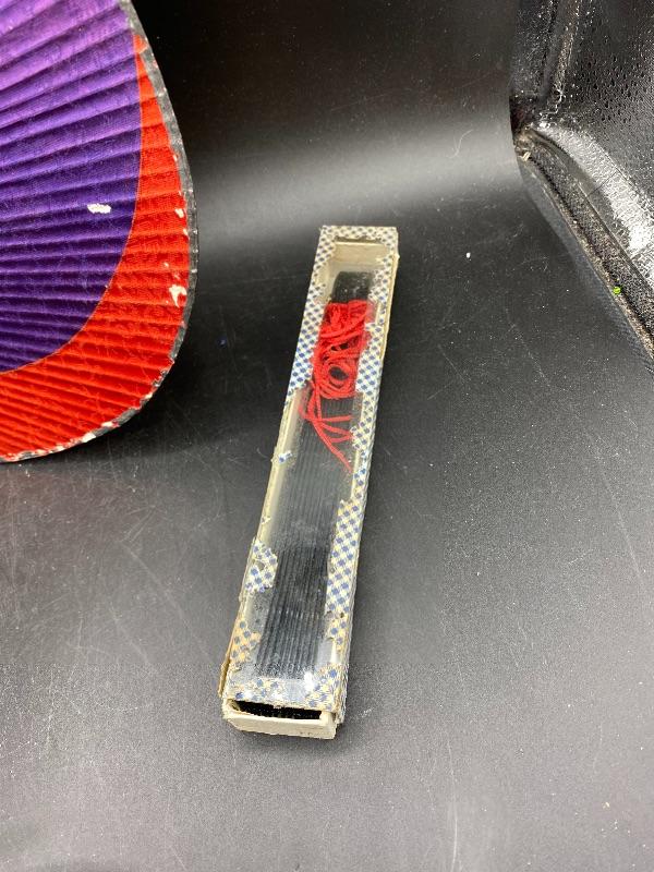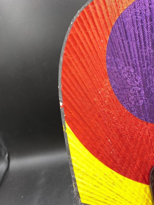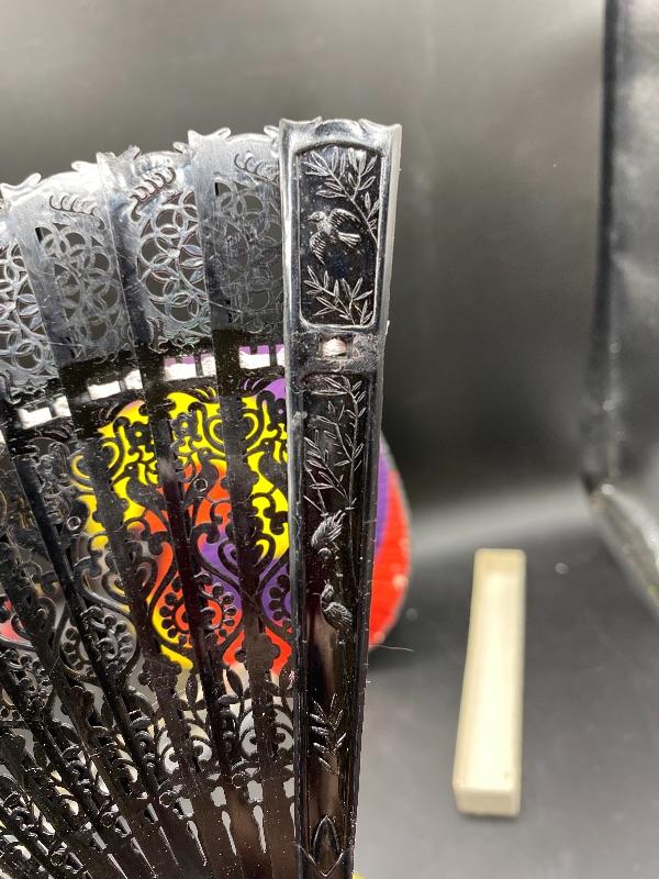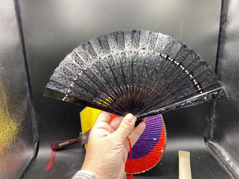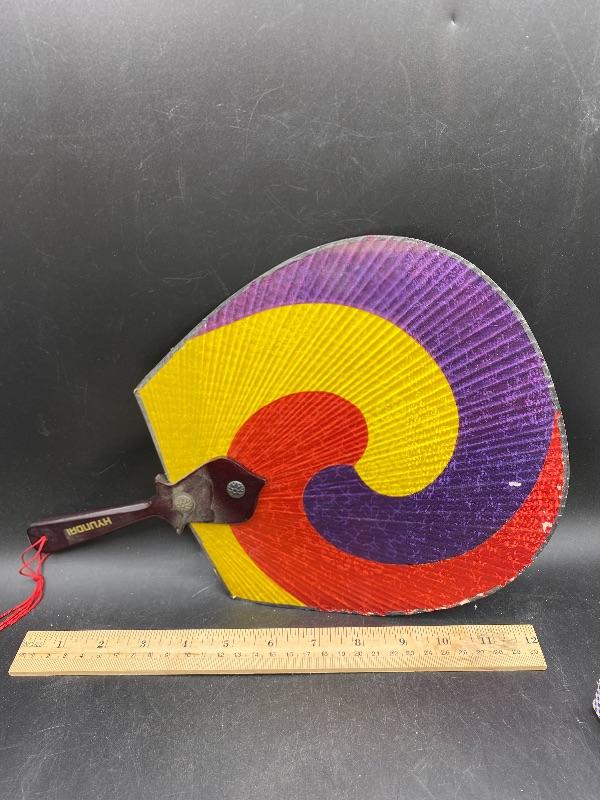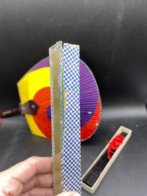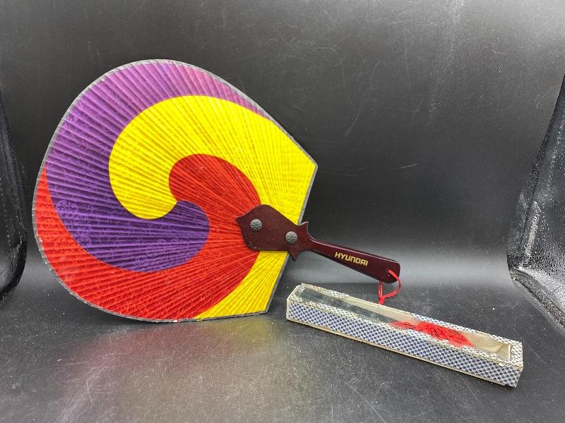 Pair of vintage handheld fans. The colorful one is from Hyundai, made in Korea. It does not fold up, and does have signs of age/wear. The fold up black fan is made of plastic, from Hong Kong. The box it is in is falling apart, but is interesting as the lid is made of glass not plastic. Great for display.