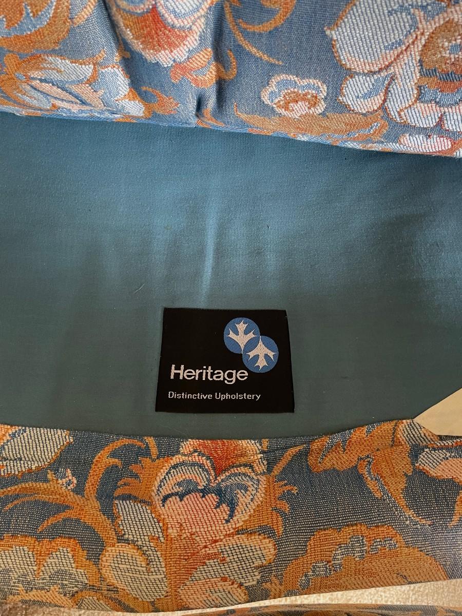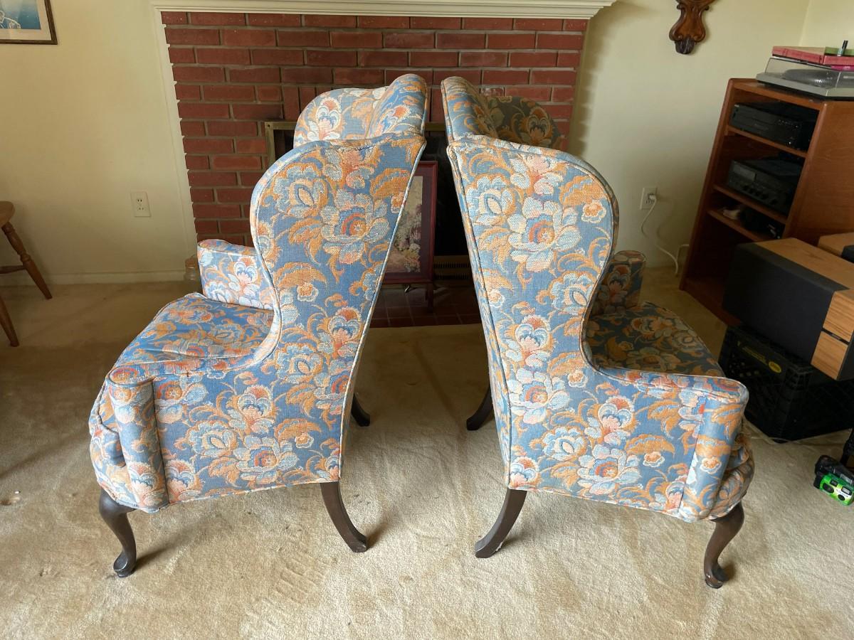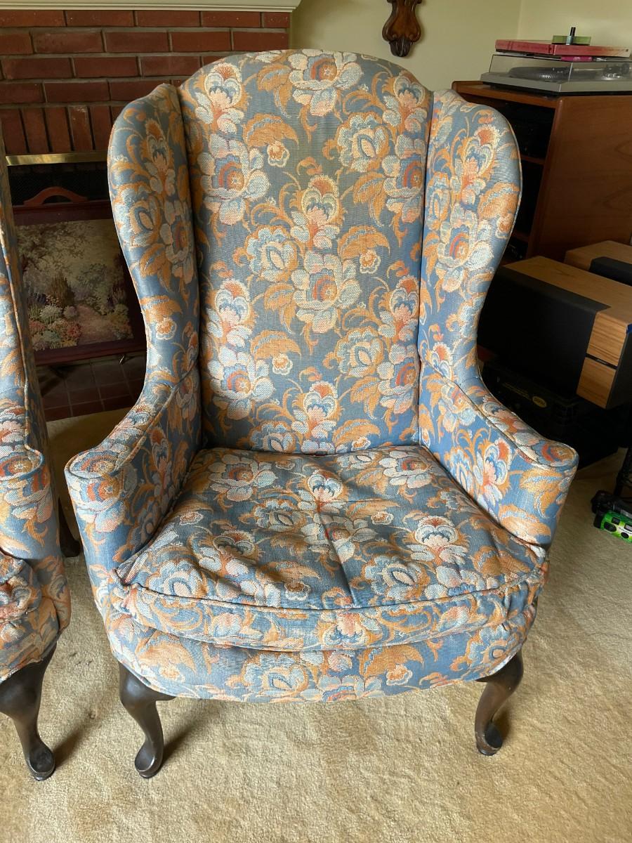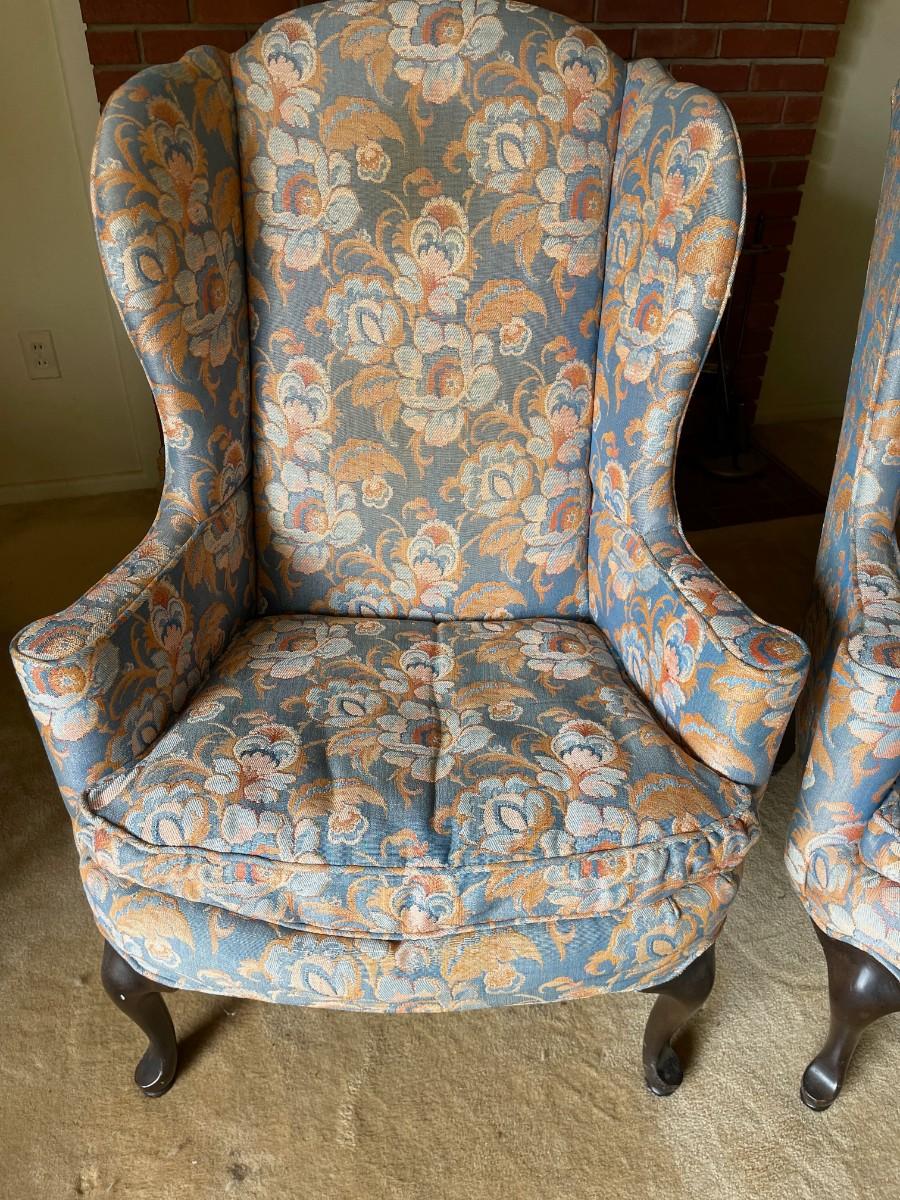 Floral Print Blue and Peach. Sturdy chairs. Clean upholstery. 32L x 24w x 44H. Heritage Distinctive Upholstery.