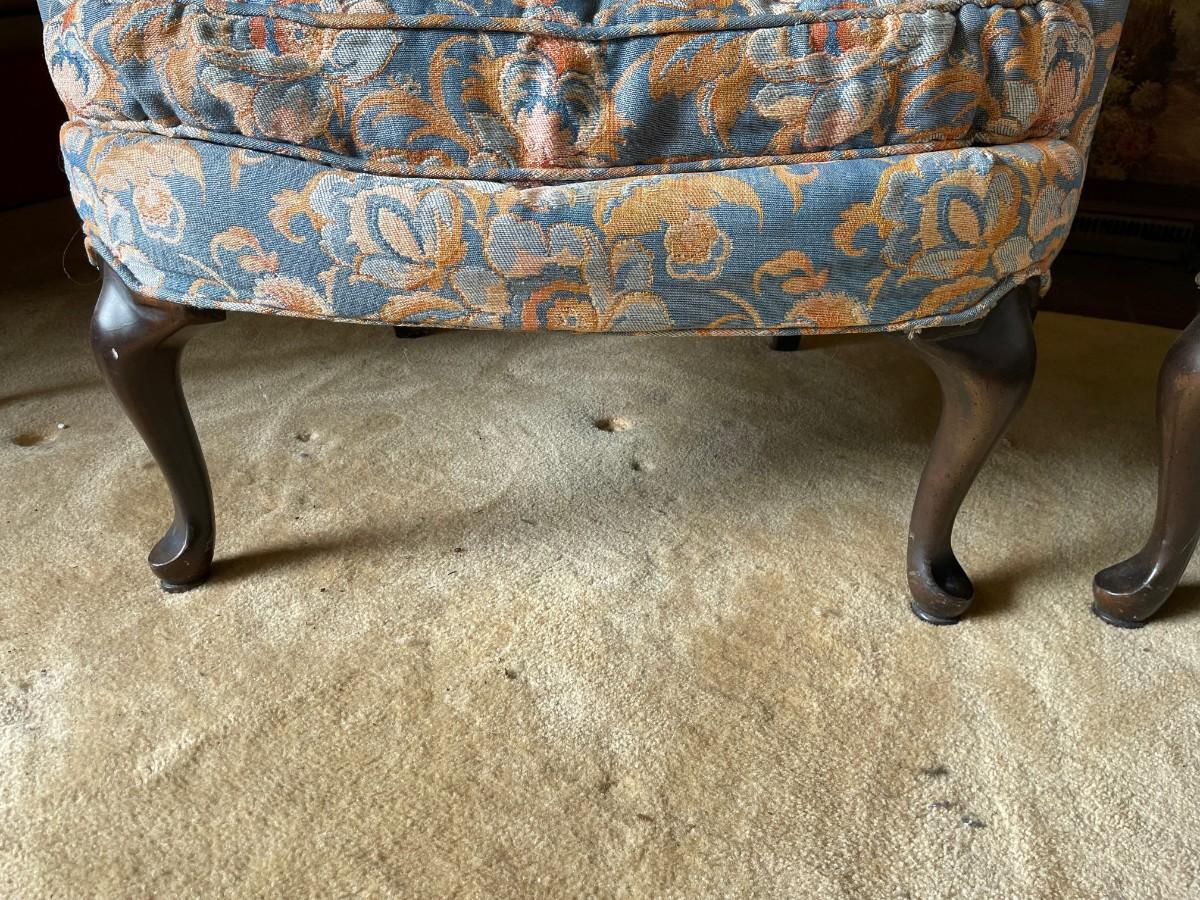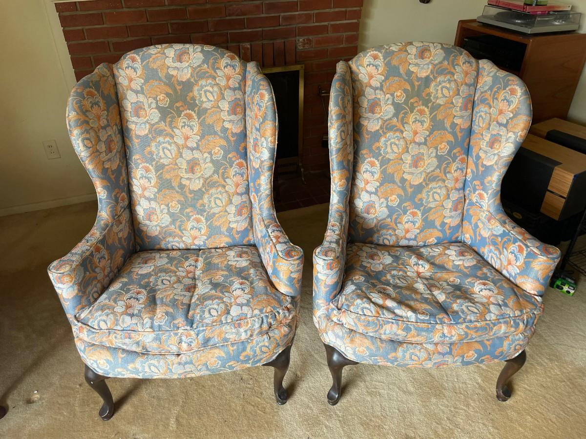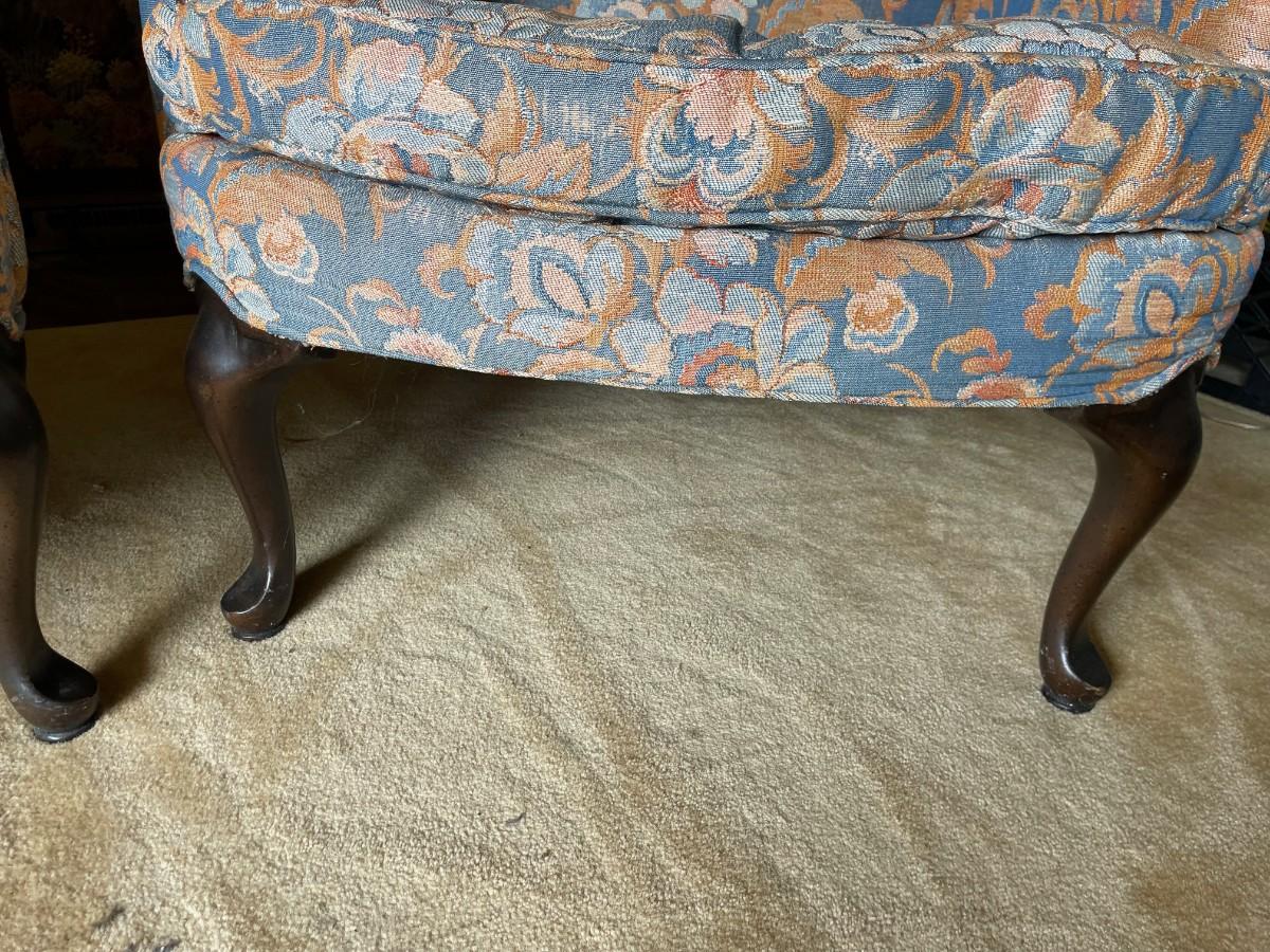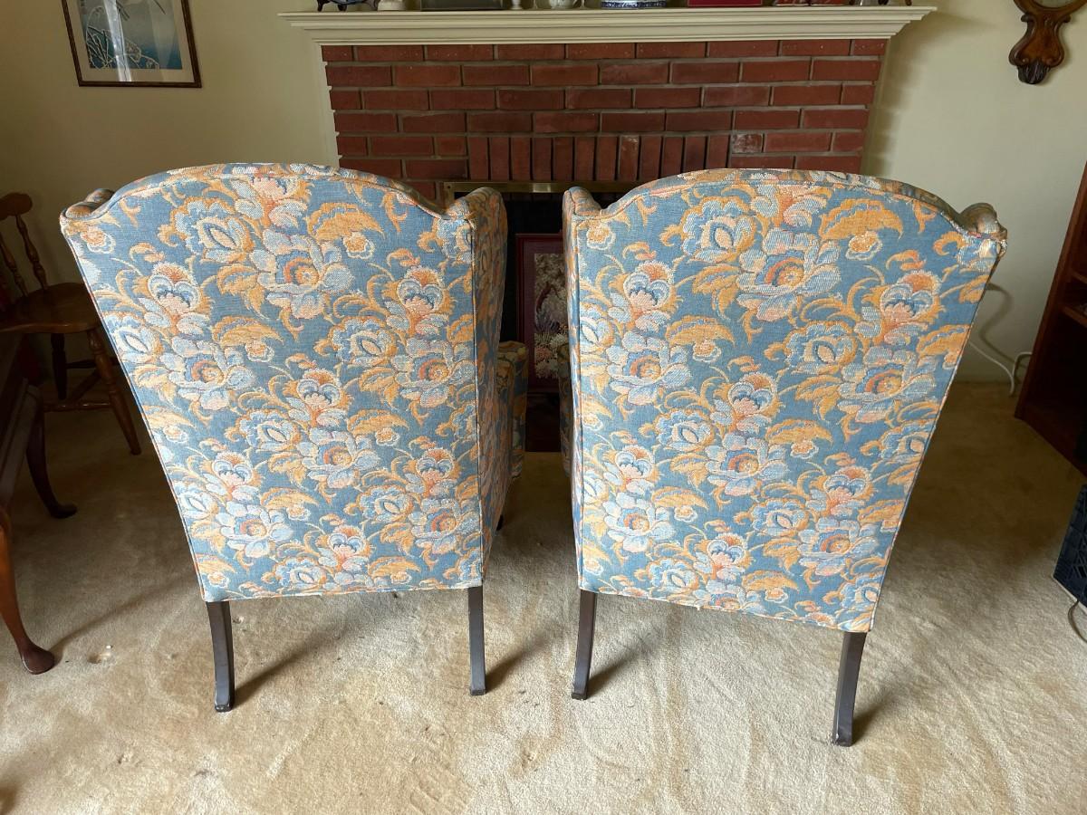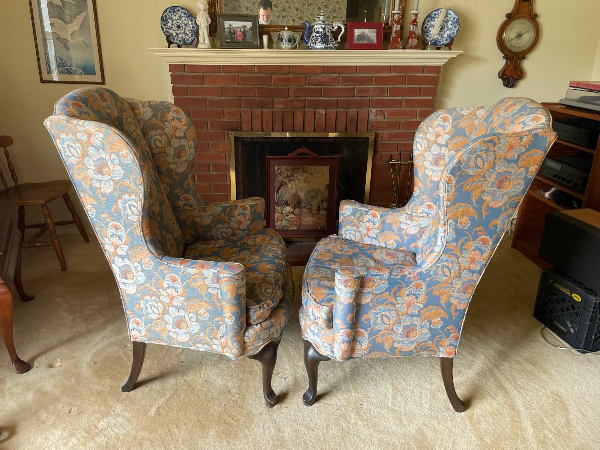 Vintage Pair of Heritage Floral Queen Anne Style Wing Back Chairs
