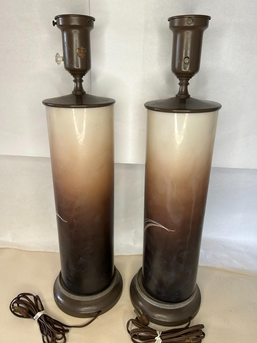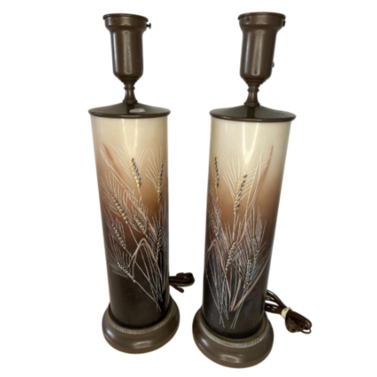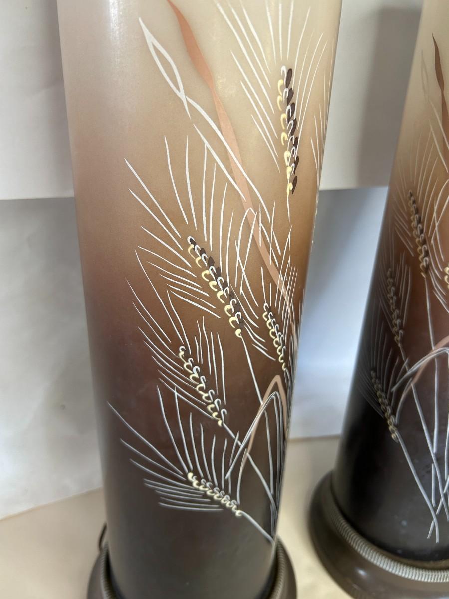 Vintage Elegant La Rochere glass cameo lamps. The beautiful cylindrical body depicts delicate natural design in gorgeous tones. These lamps are in exceptional structural condition but will benefit from new electric wiring.