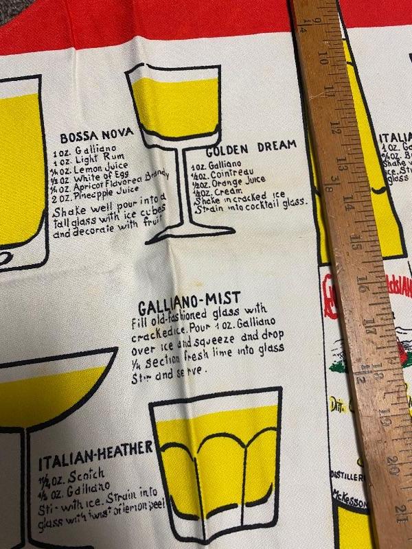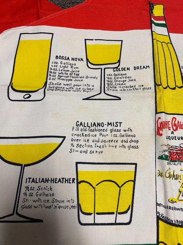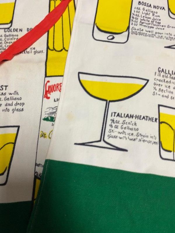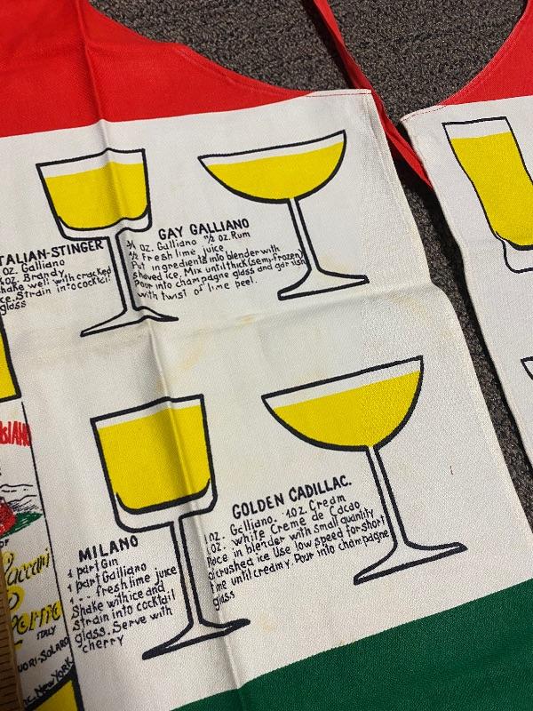 Pair of MidCentury Galliano Liquore Aprons. Red, white, and green representing the Italian flag. Different drink recipes using Galliano on the front. Some spots and discoloration on both. About 31" length, neck loop, ties at the waist in the back.