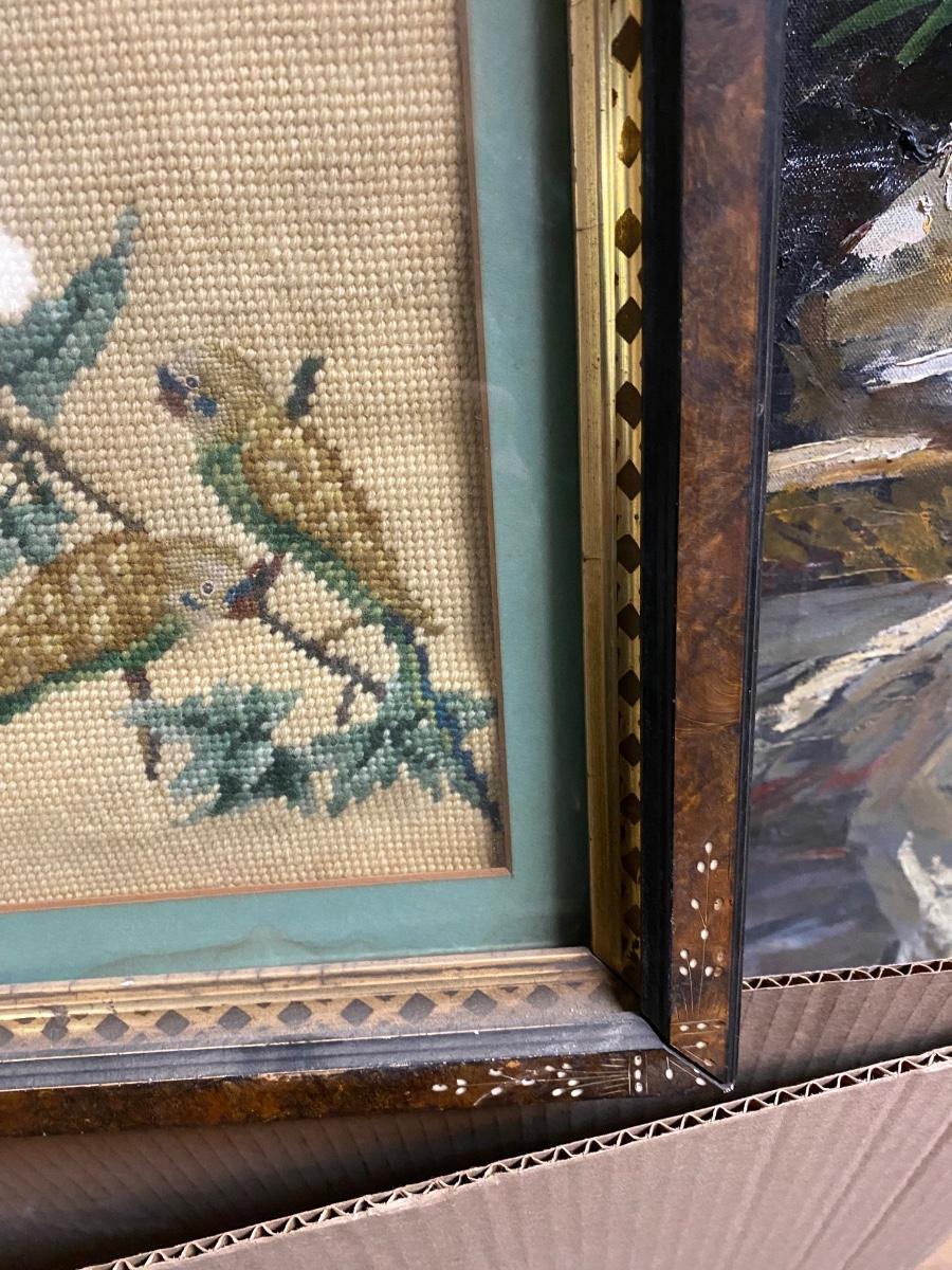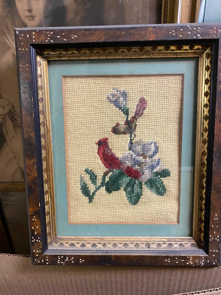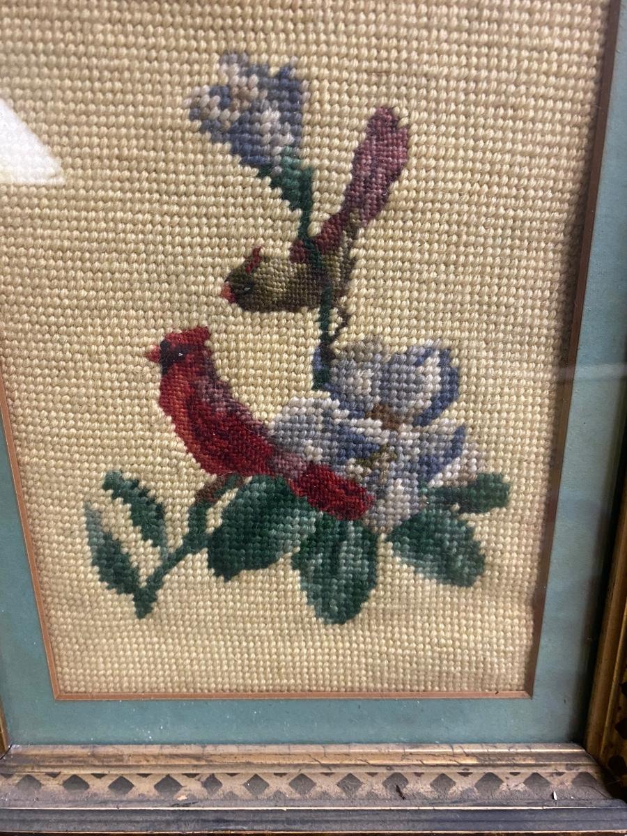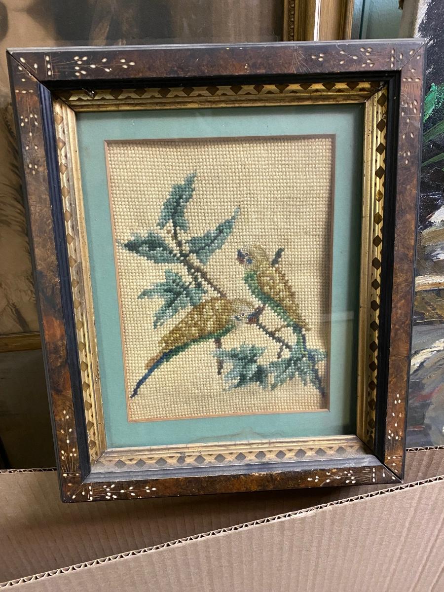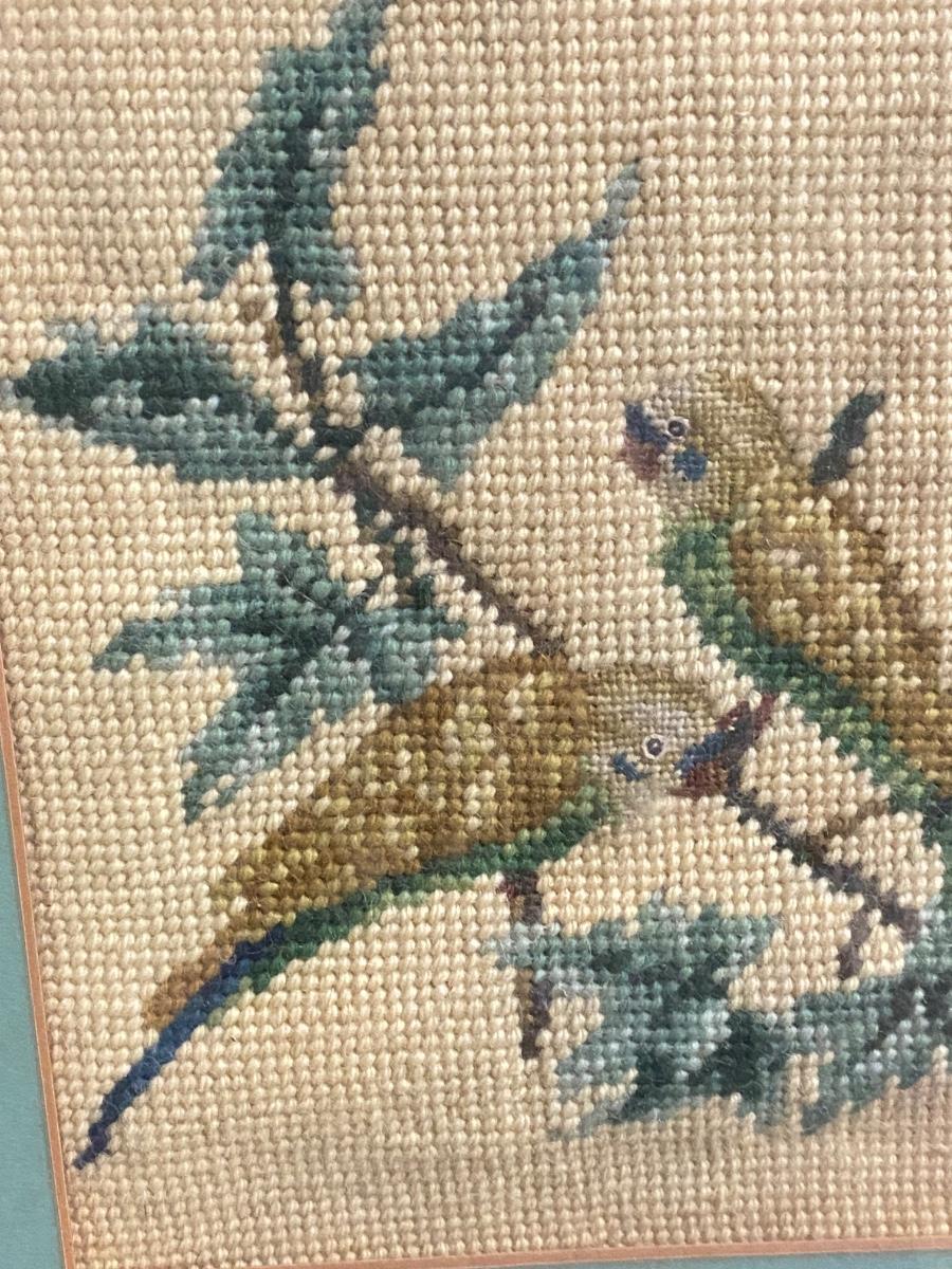 Sweet framed set of needlepoint birds. Inlay pattern on frame. Yellow birds need to be remounted into frame. 12x10