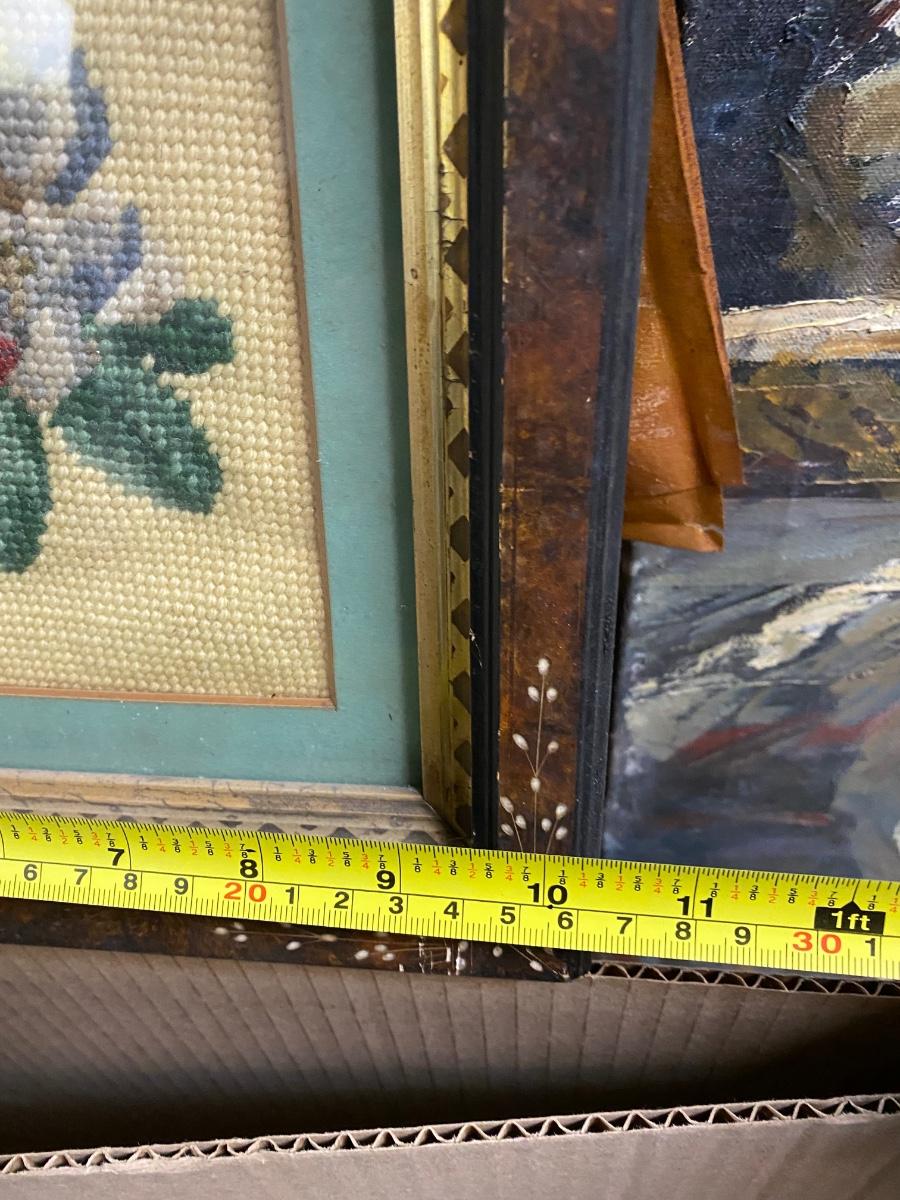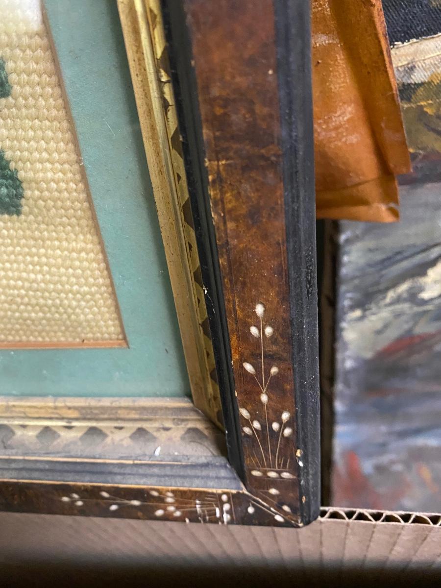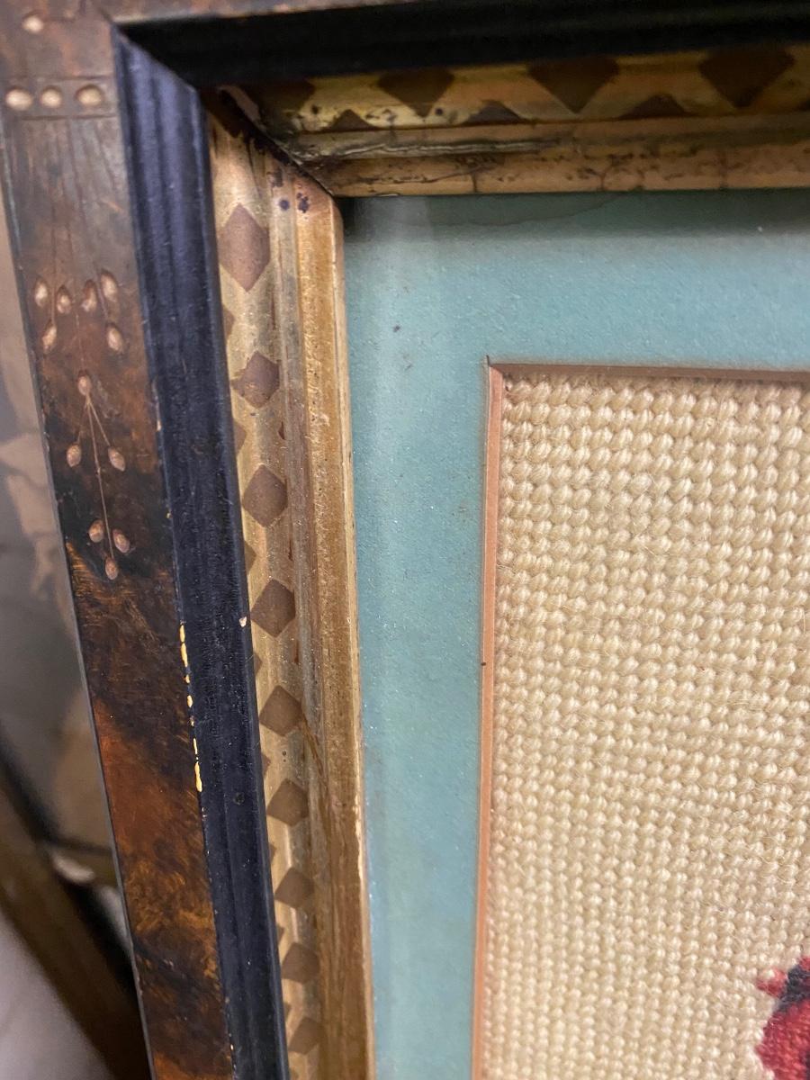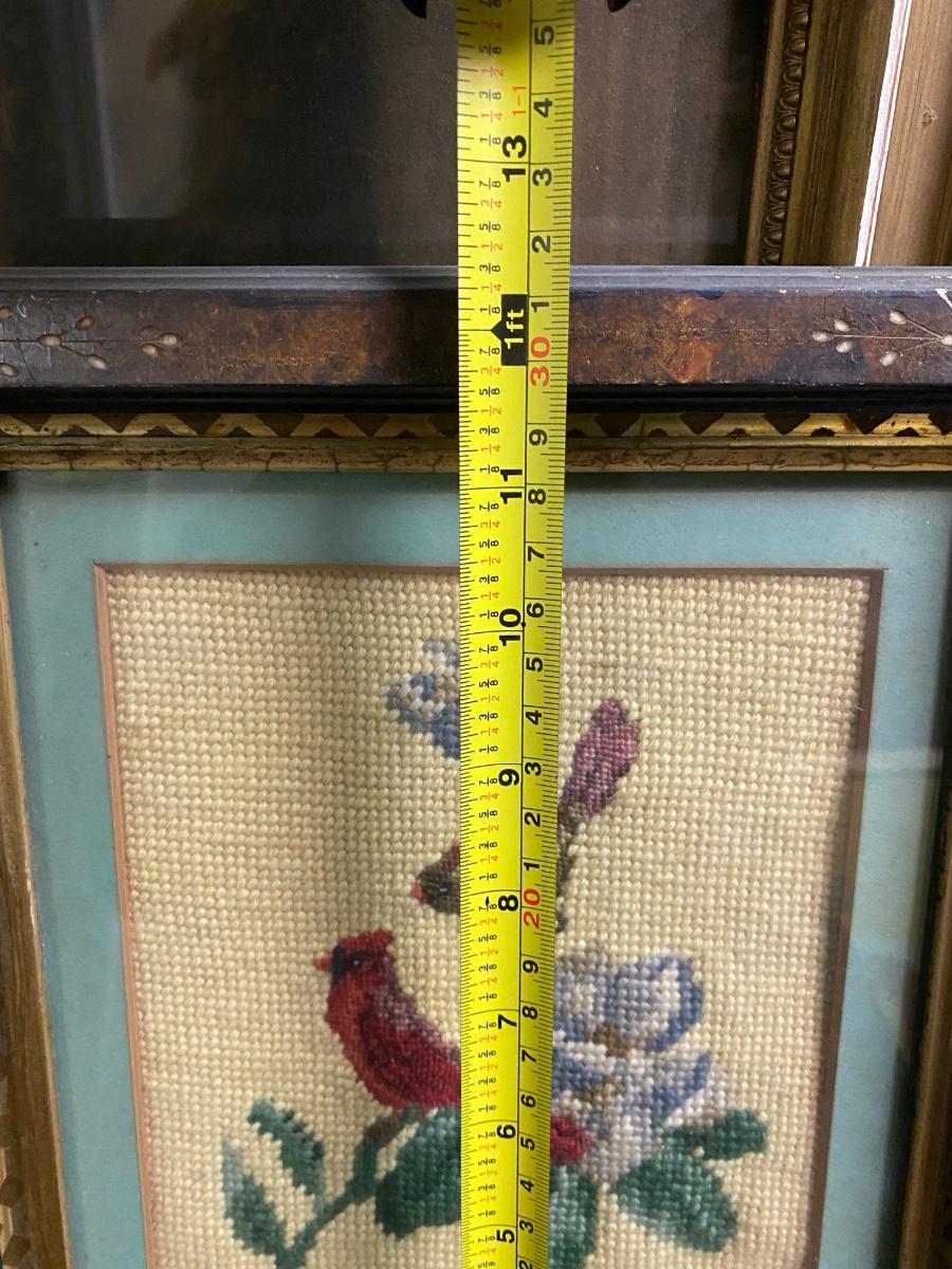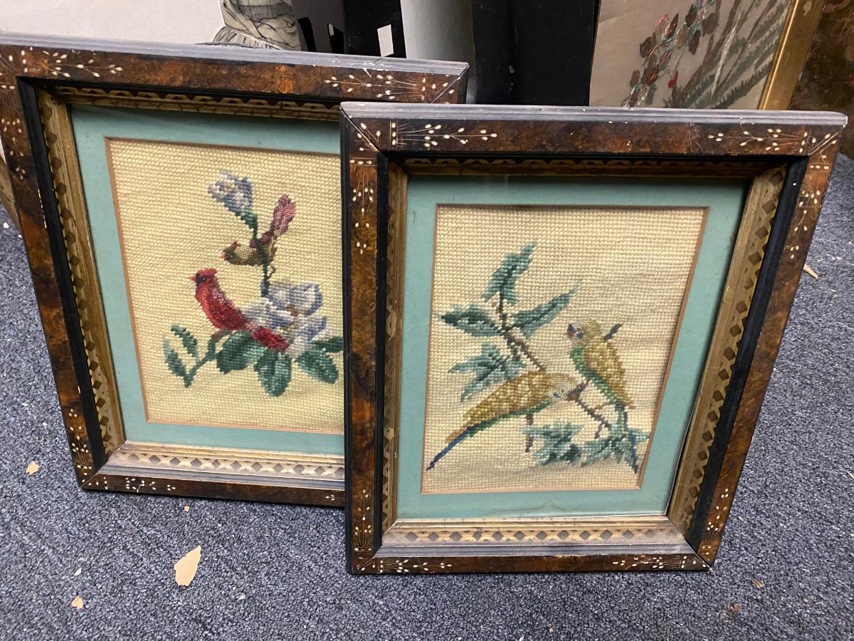 Sweet framed set of needlepoint birds. Inlay pattern on frame. Yellow birds need to be remounted into frame. 12x10