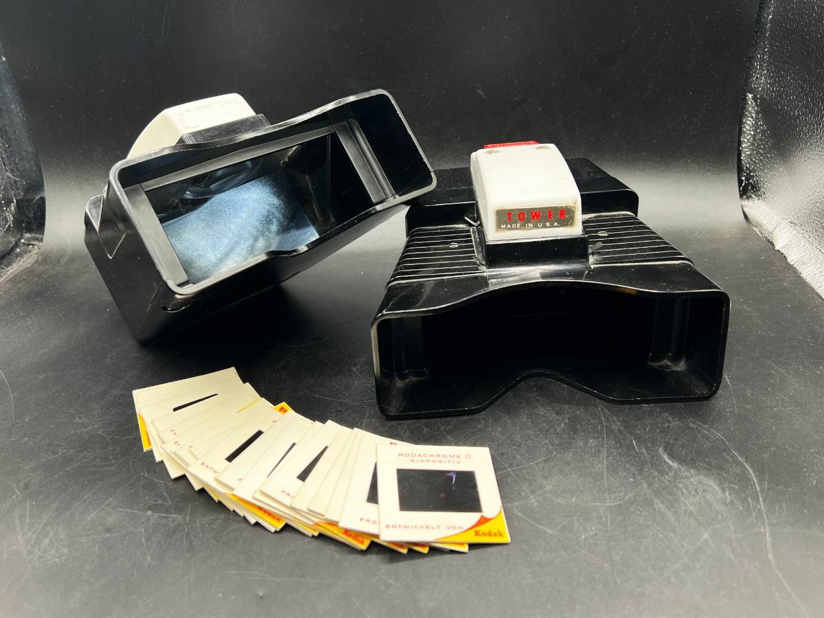 Vintage Pair of Pan Ram Tower Backlight 35mm Portable Photo Slide Viewer & Kodak 35mm Photo Slides, there is no significant damage to the bodies of the photography viewers and is in good vintage condition. One of the viewers does not function and might need new batteries or a light bulb. The other one works perfectly, check pictures for more details and for sizing.