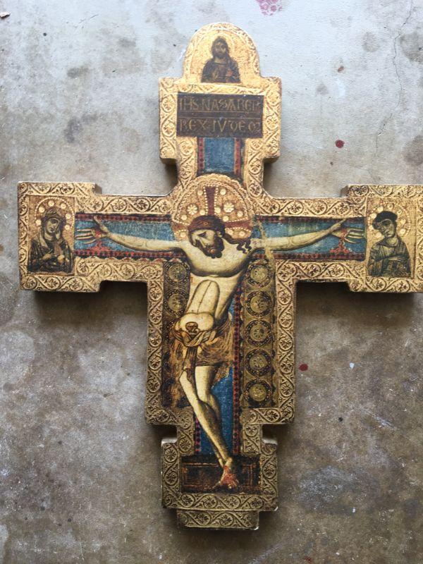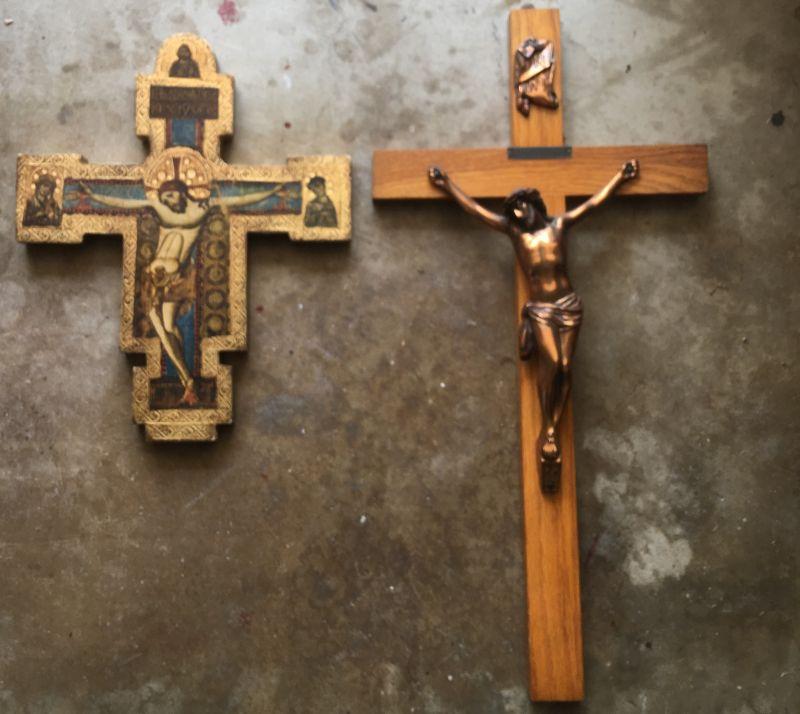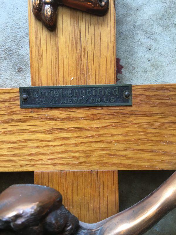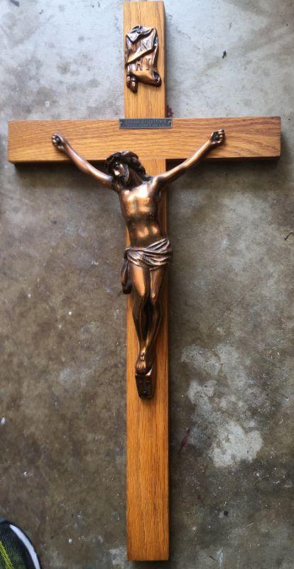Tall crucifix cooper and wood Measuring 24" in height X 12" , Smaller Orthodox Cross measuring 14.5" X 12". Both in VG conditions. The crucifix is signed on the back and dated 1942 but it looks much closer to the current date.