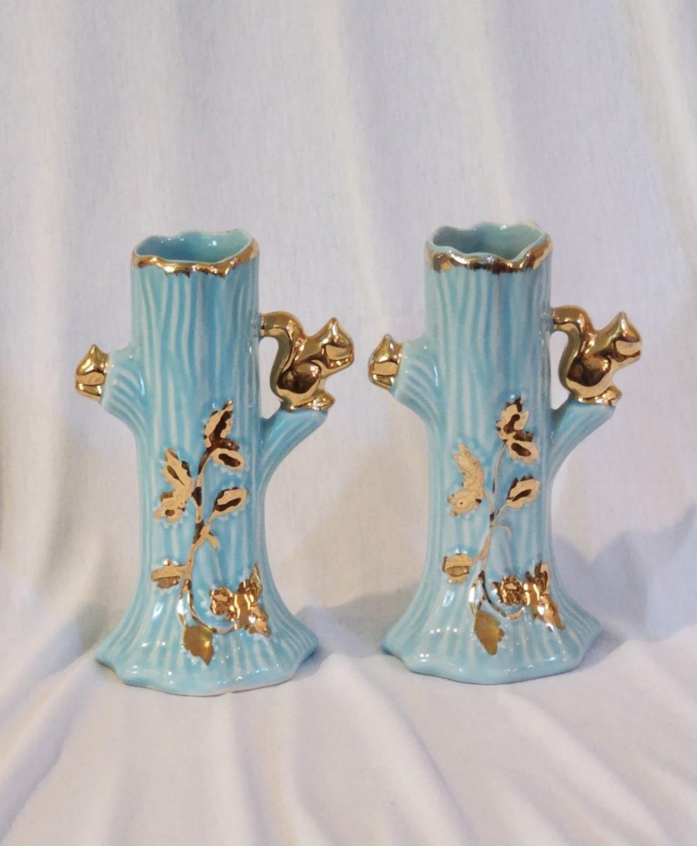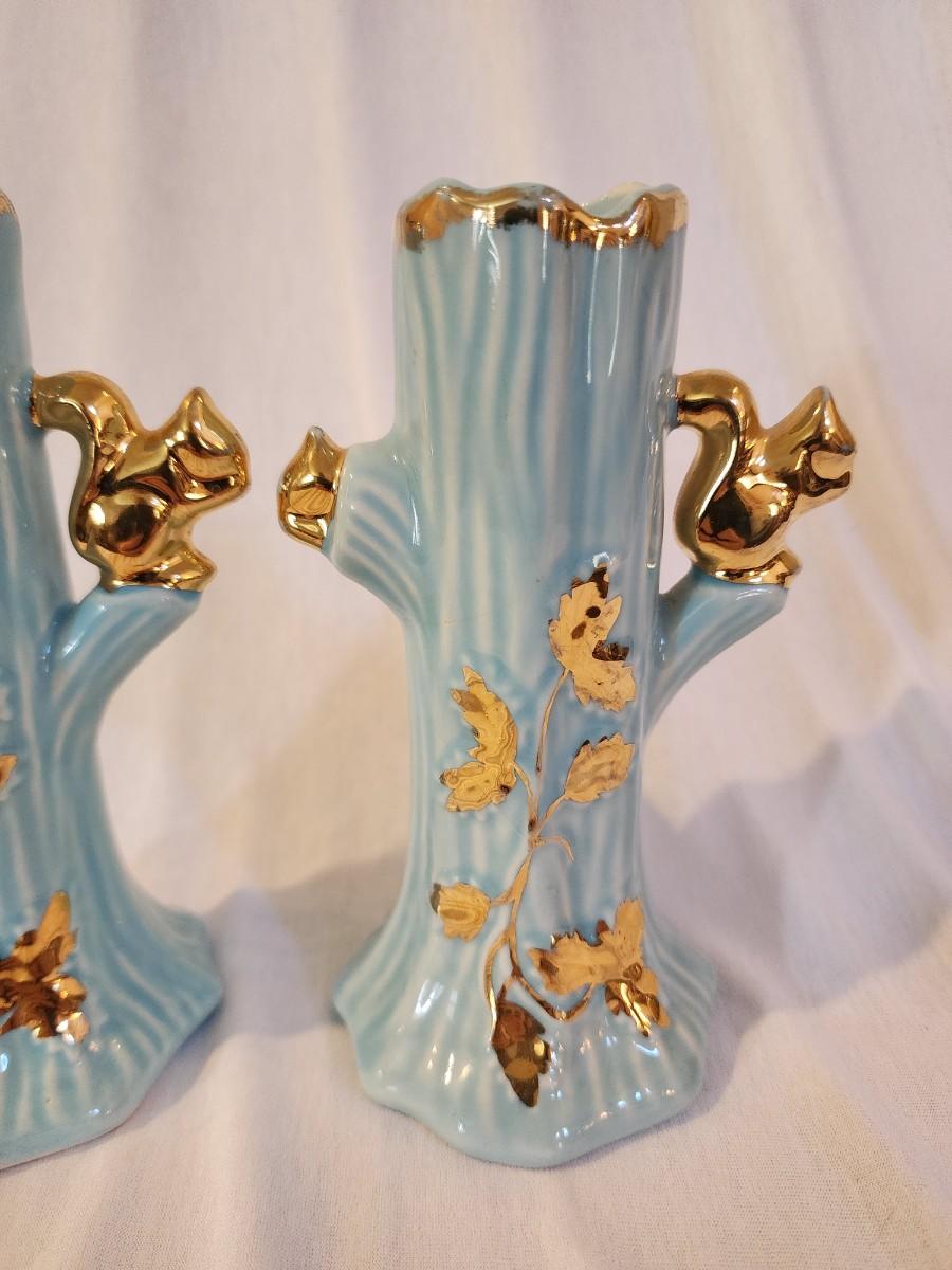 Very cute mid-century porcelain tree-trunk shaped matching vases. Leaves and squirrels are painted with 22k gold. Perfect, like new condition. 6" tall