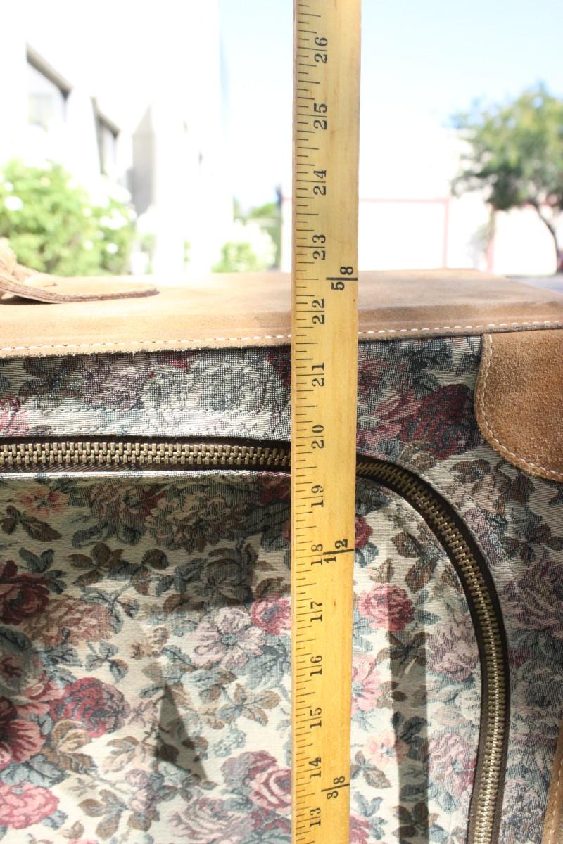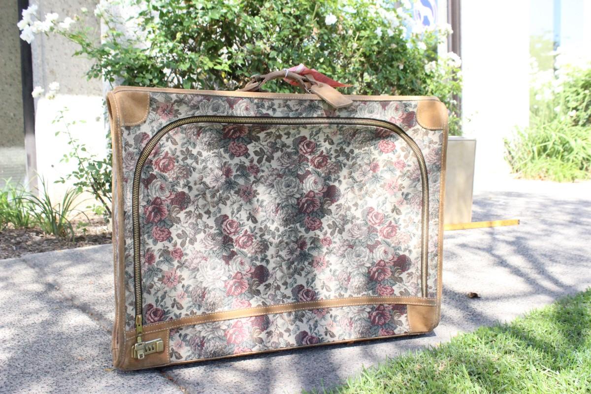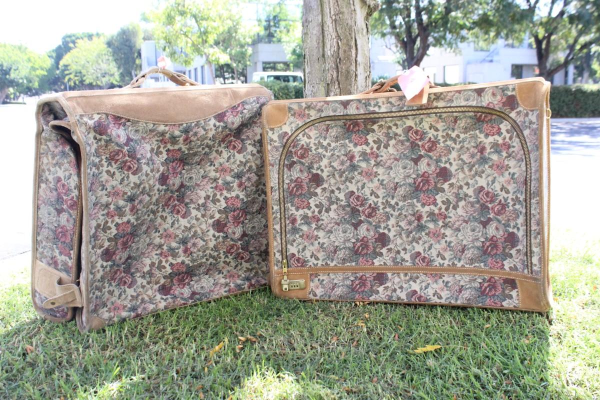 Vintage Pair of Rose Pattern Tapestry Folding Travel Luggage, there's no significant rips or tears to either of the luggages and is in good vintage condition. See pictures for more information and for sizing.