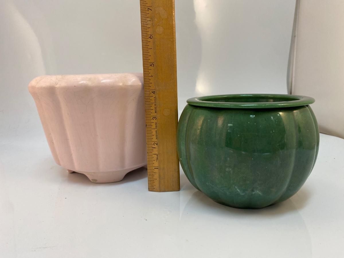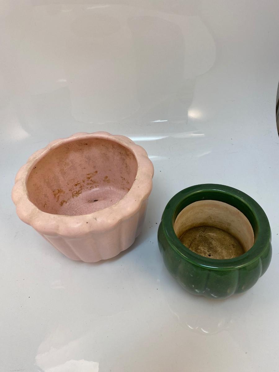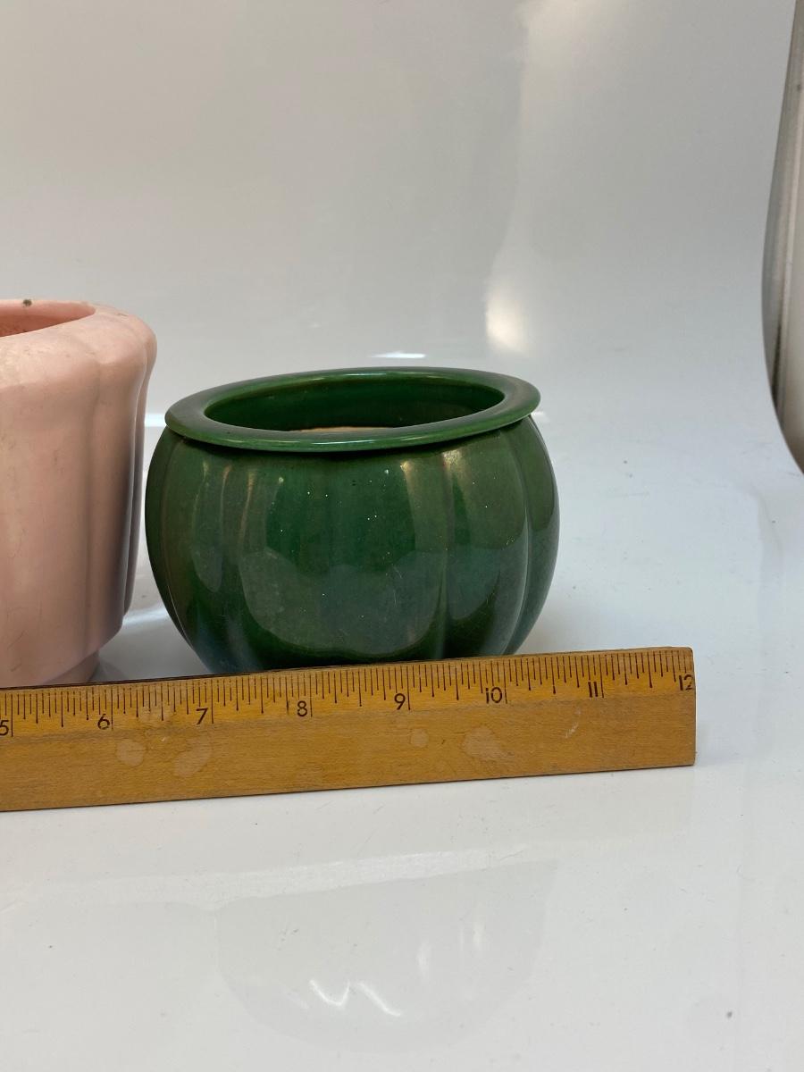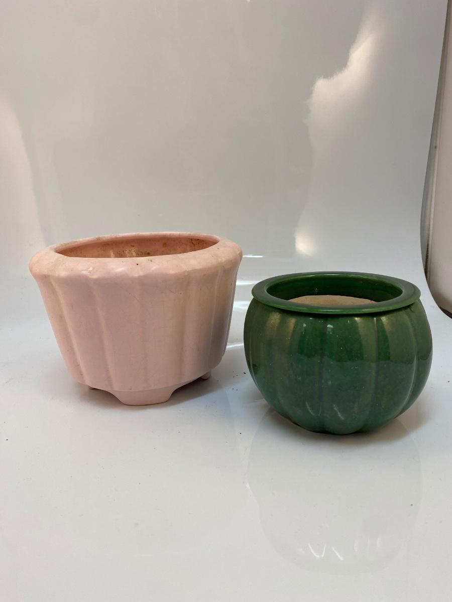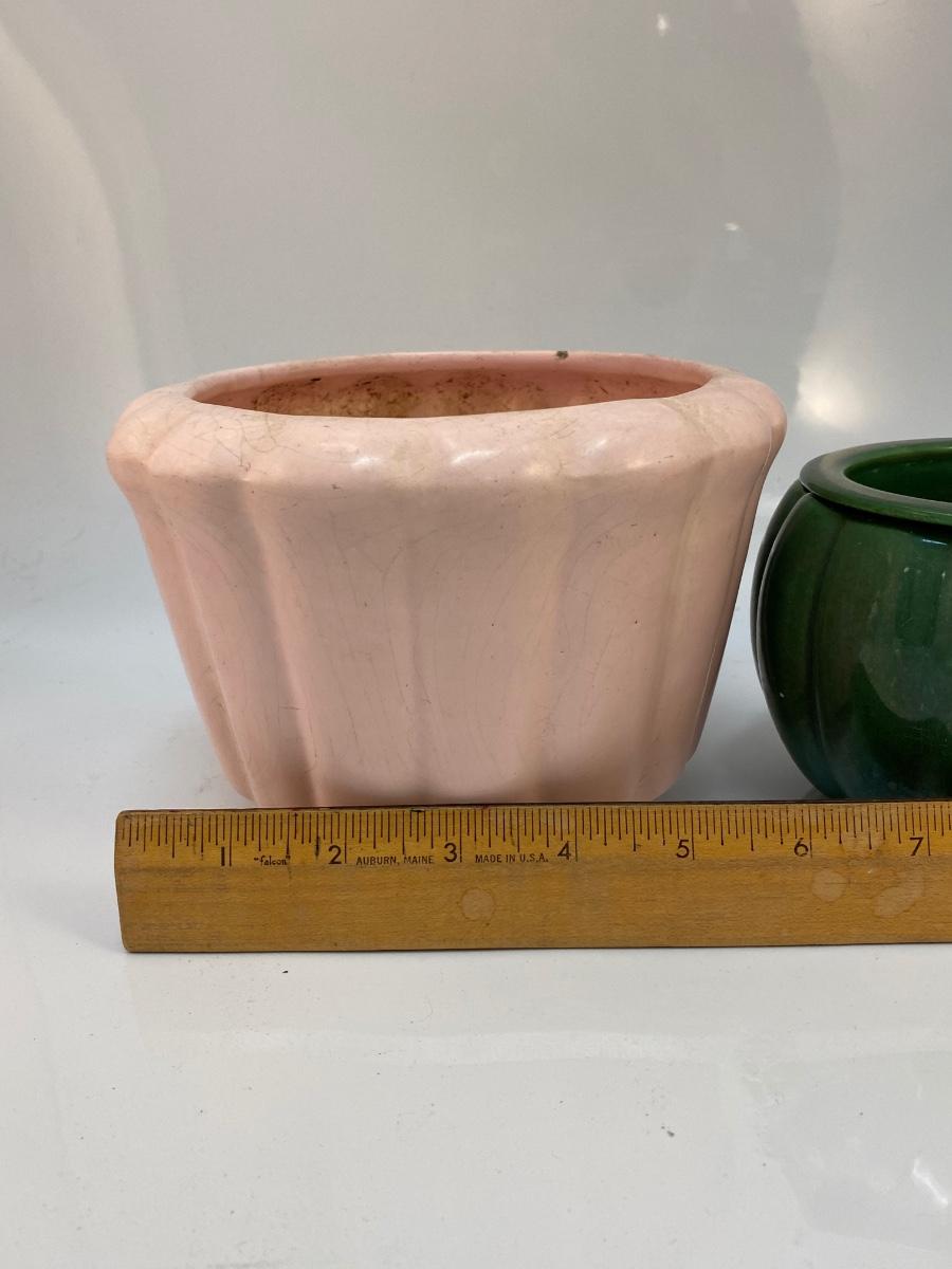 Vintage Pair of Small Planter Pots California Pottery Pink and Green. In vintage condition. Both have crazing, the pink is easier to see. No major chips or damage. Both have pottery company names on them.