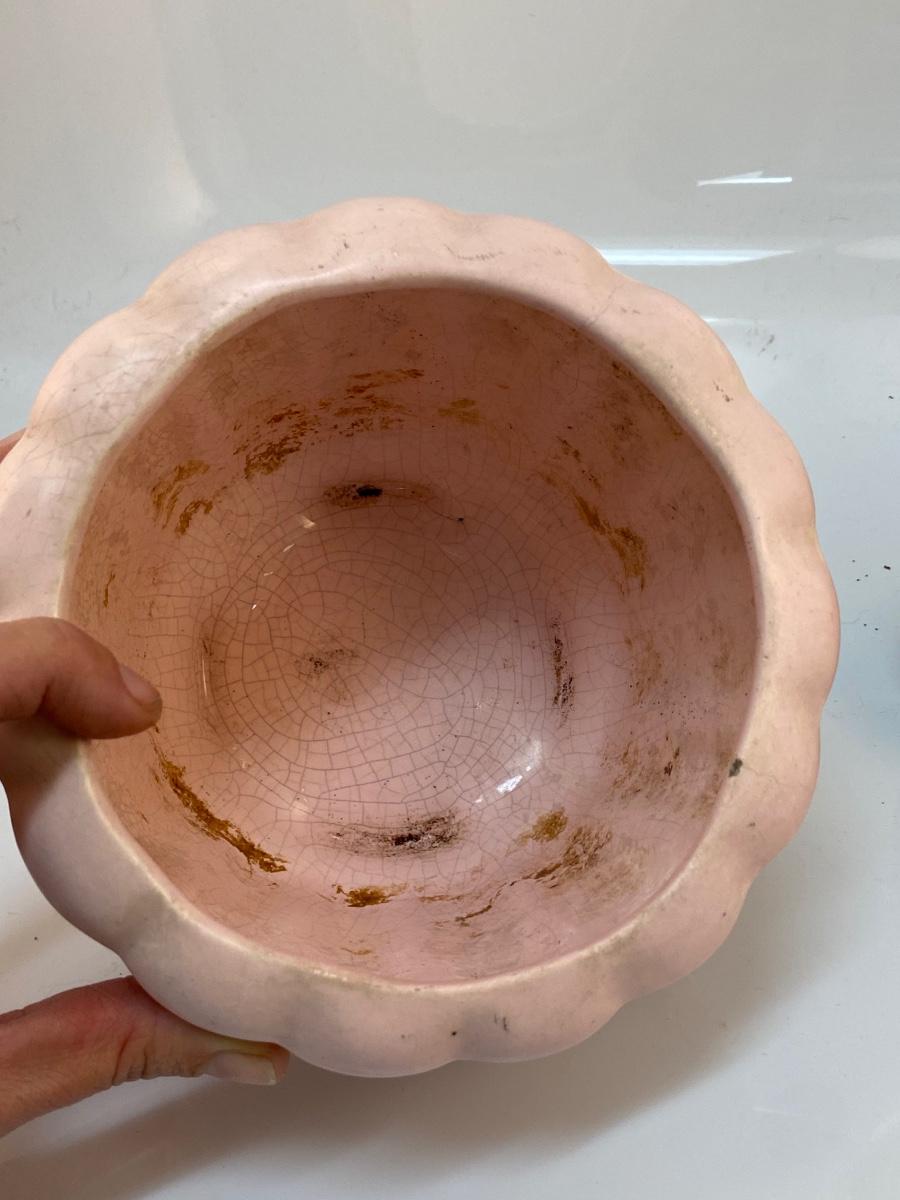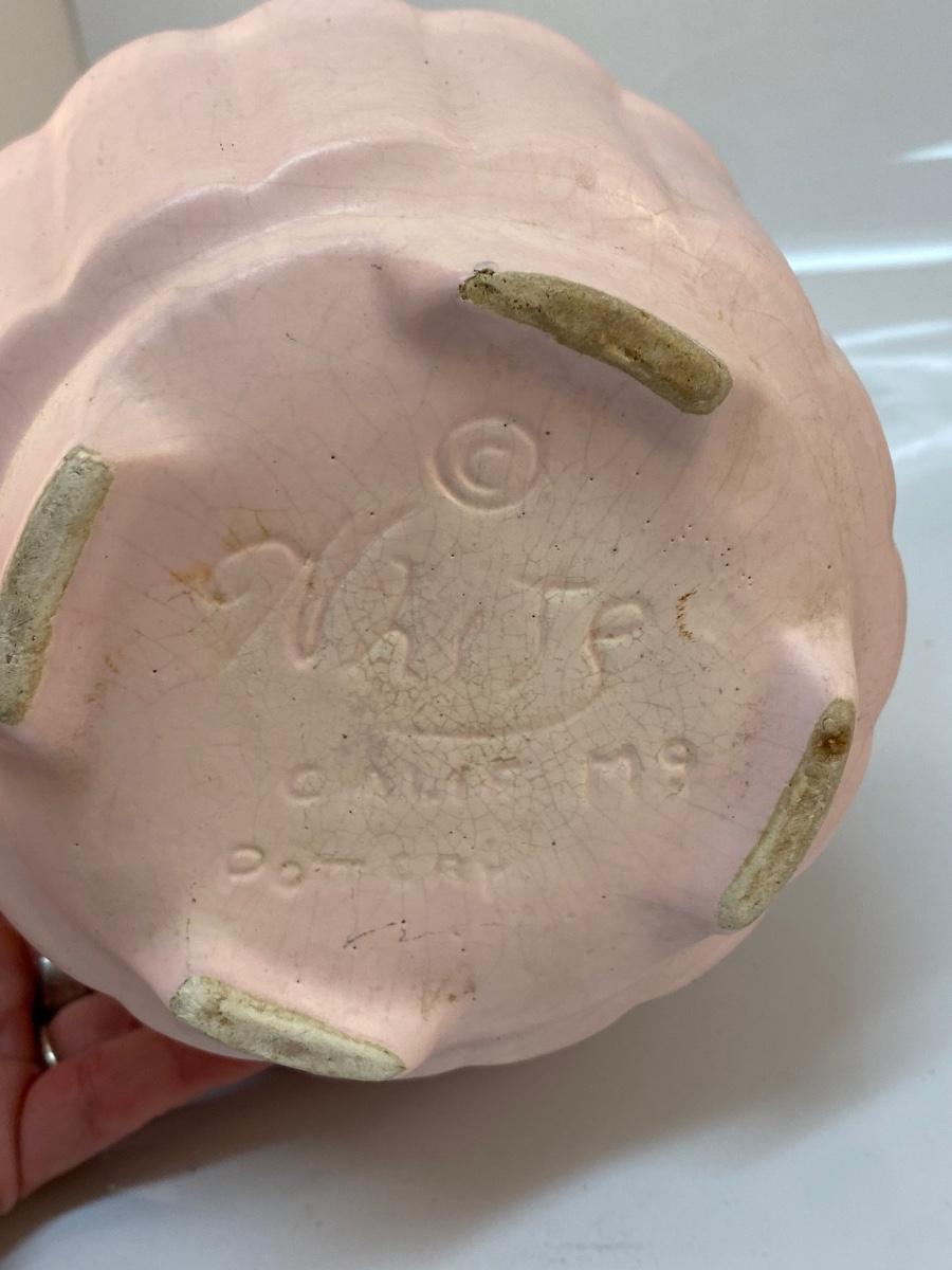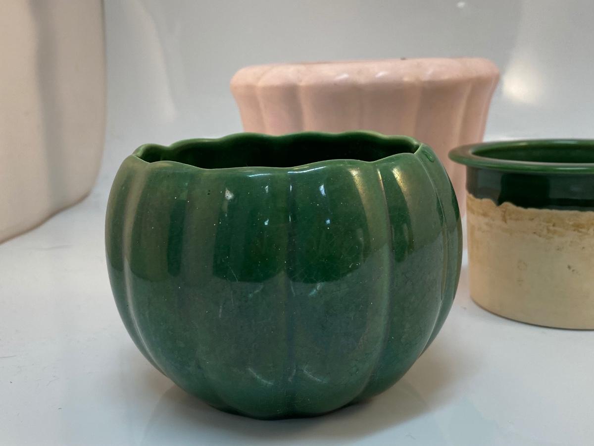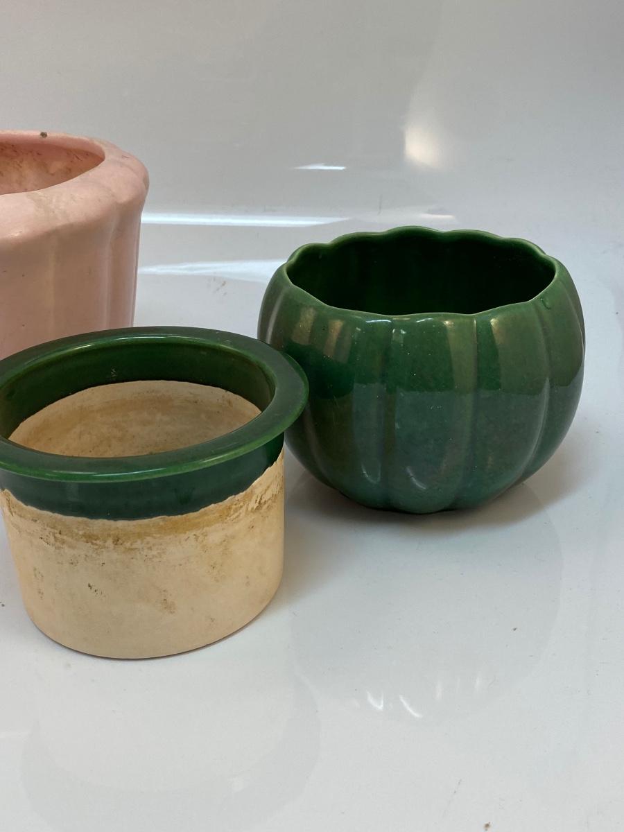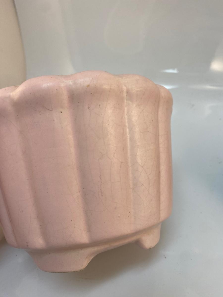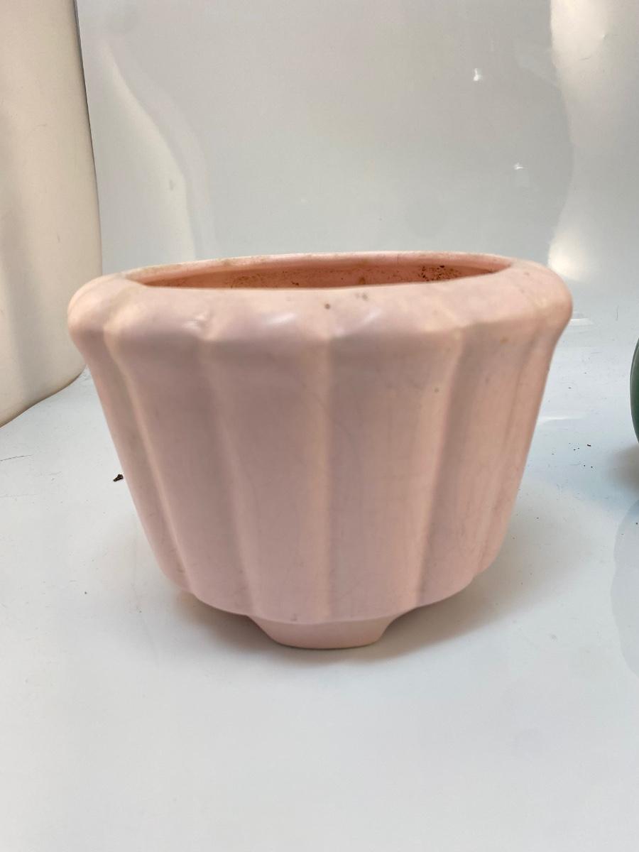 Vintage Pair of Small Planter Pots California Pottery Pink and Green. In vintage condition. Both have crazing, the pink is easier to see. No major chips or damage. Both have pottery company names on them.
