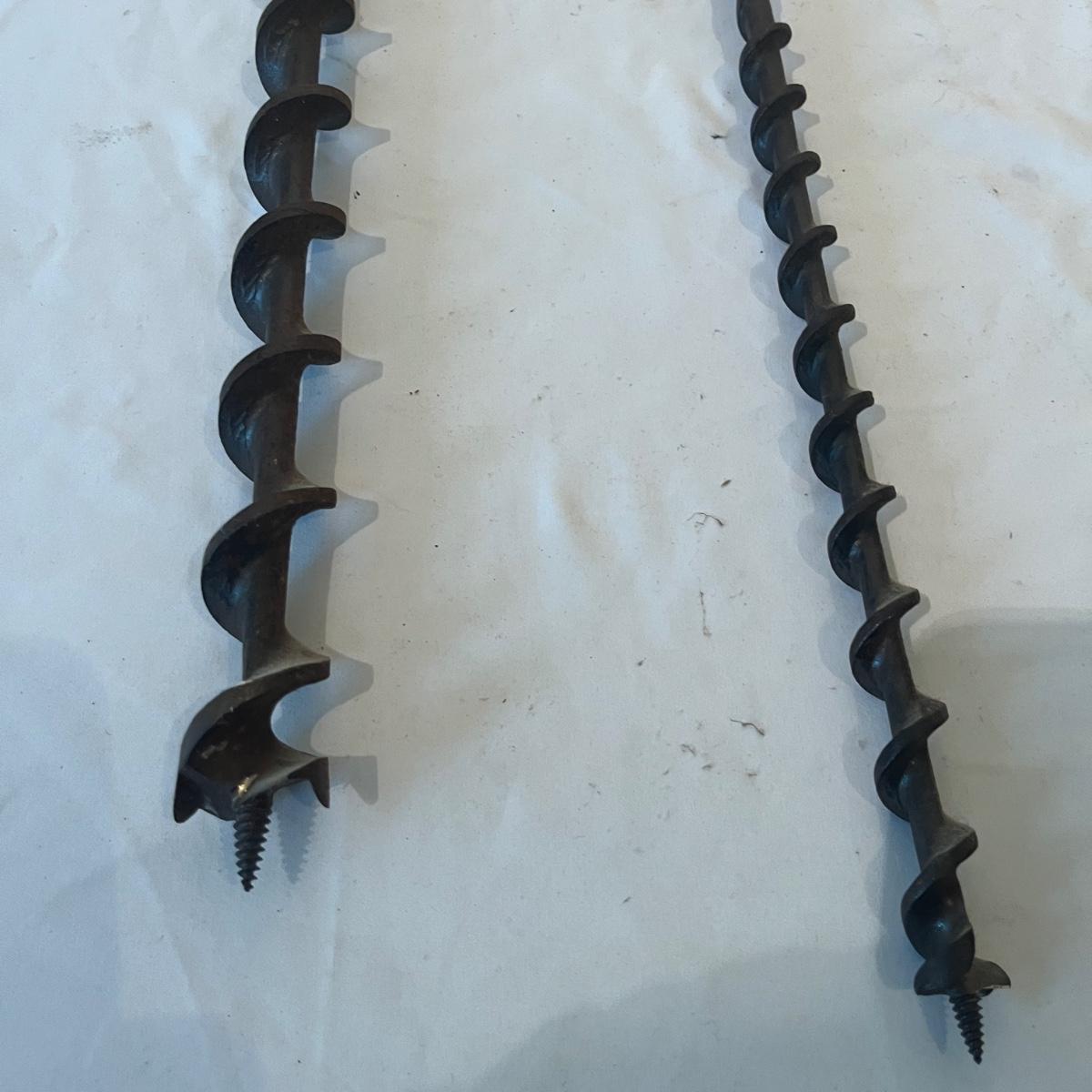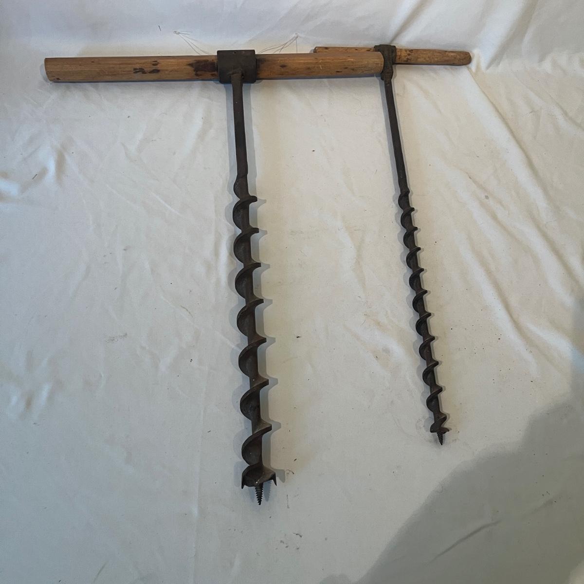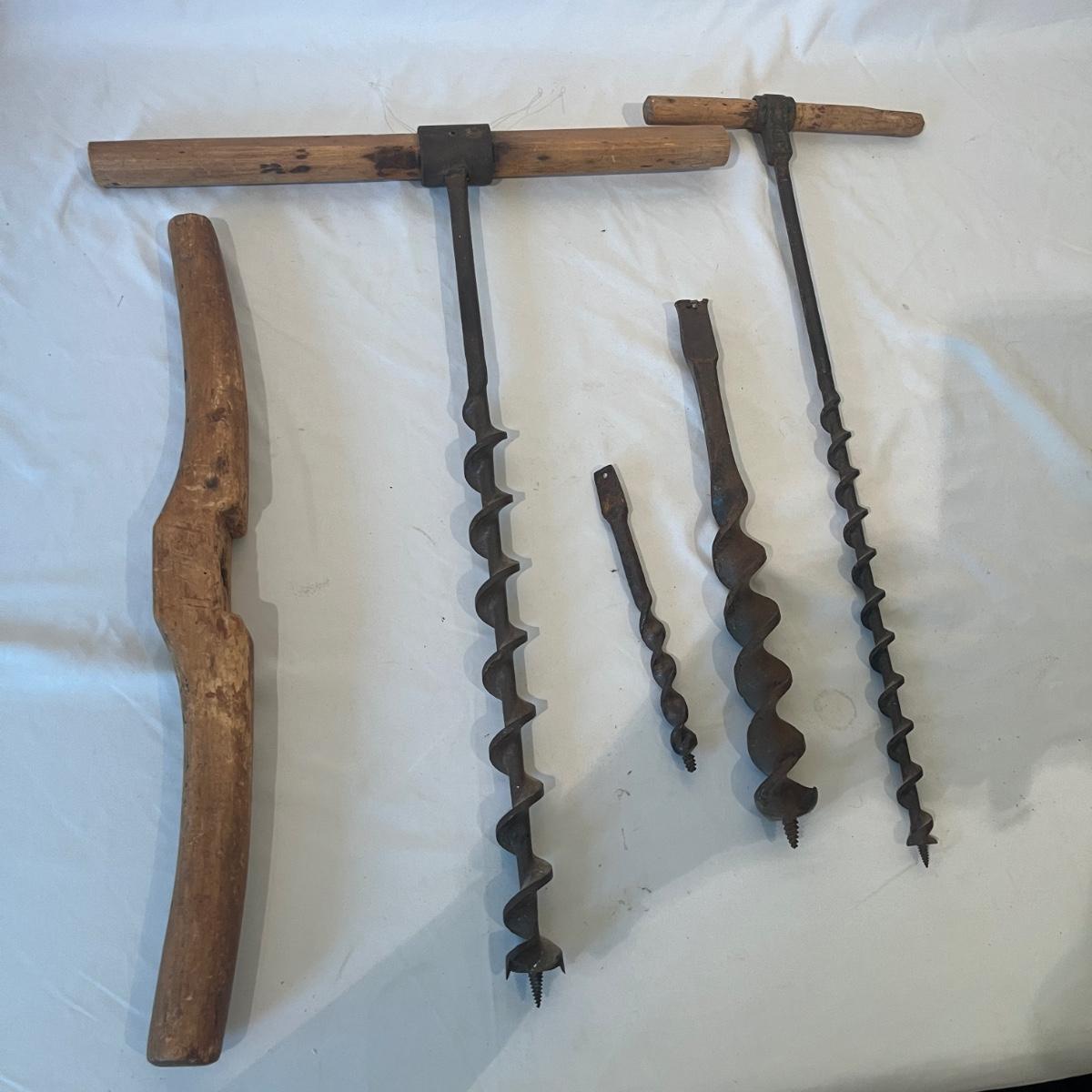 Lot includes two wooden T handle hand drills and two loose bits with a wooden handle. Largest piece measures 18” x 2” x 23”H. See photos for details.