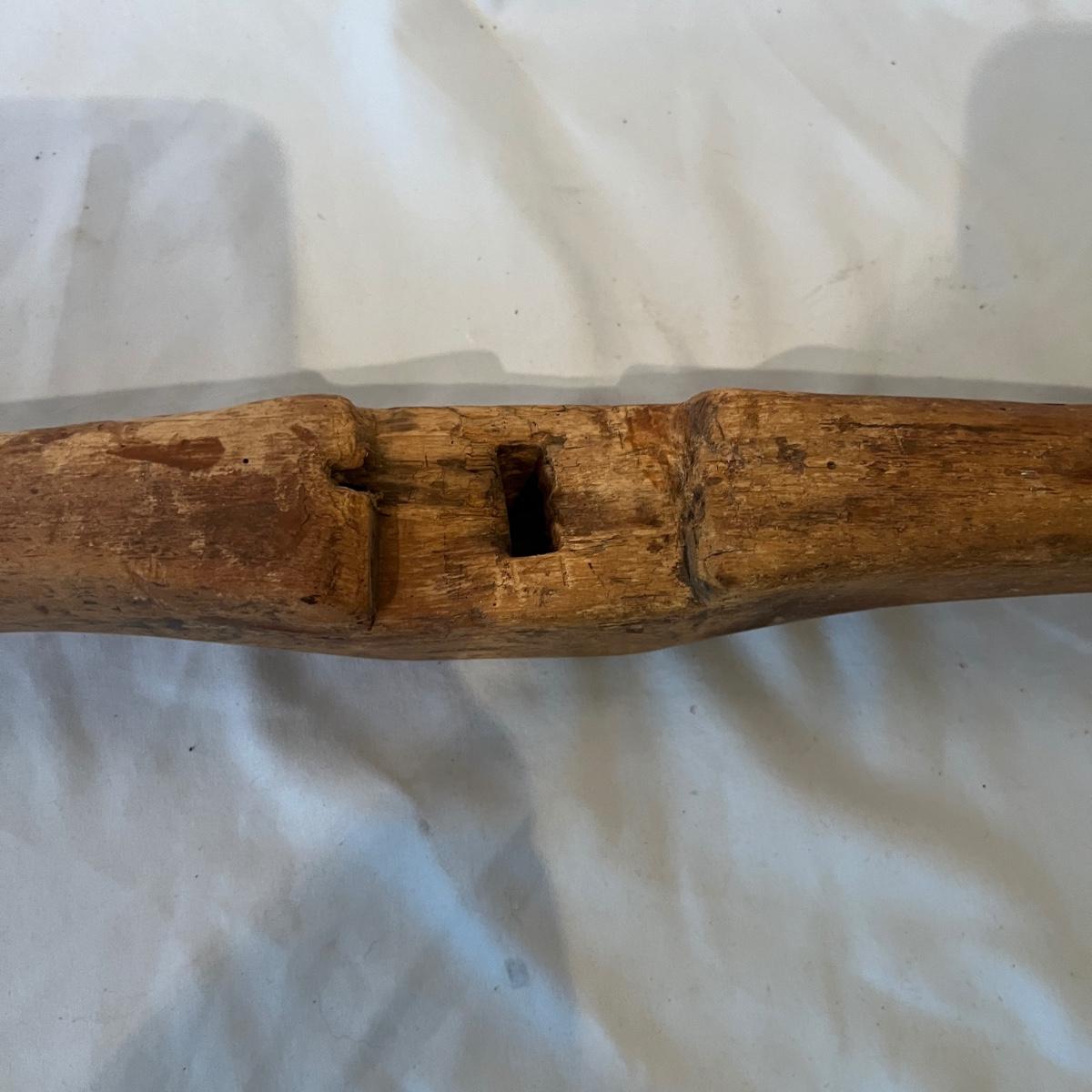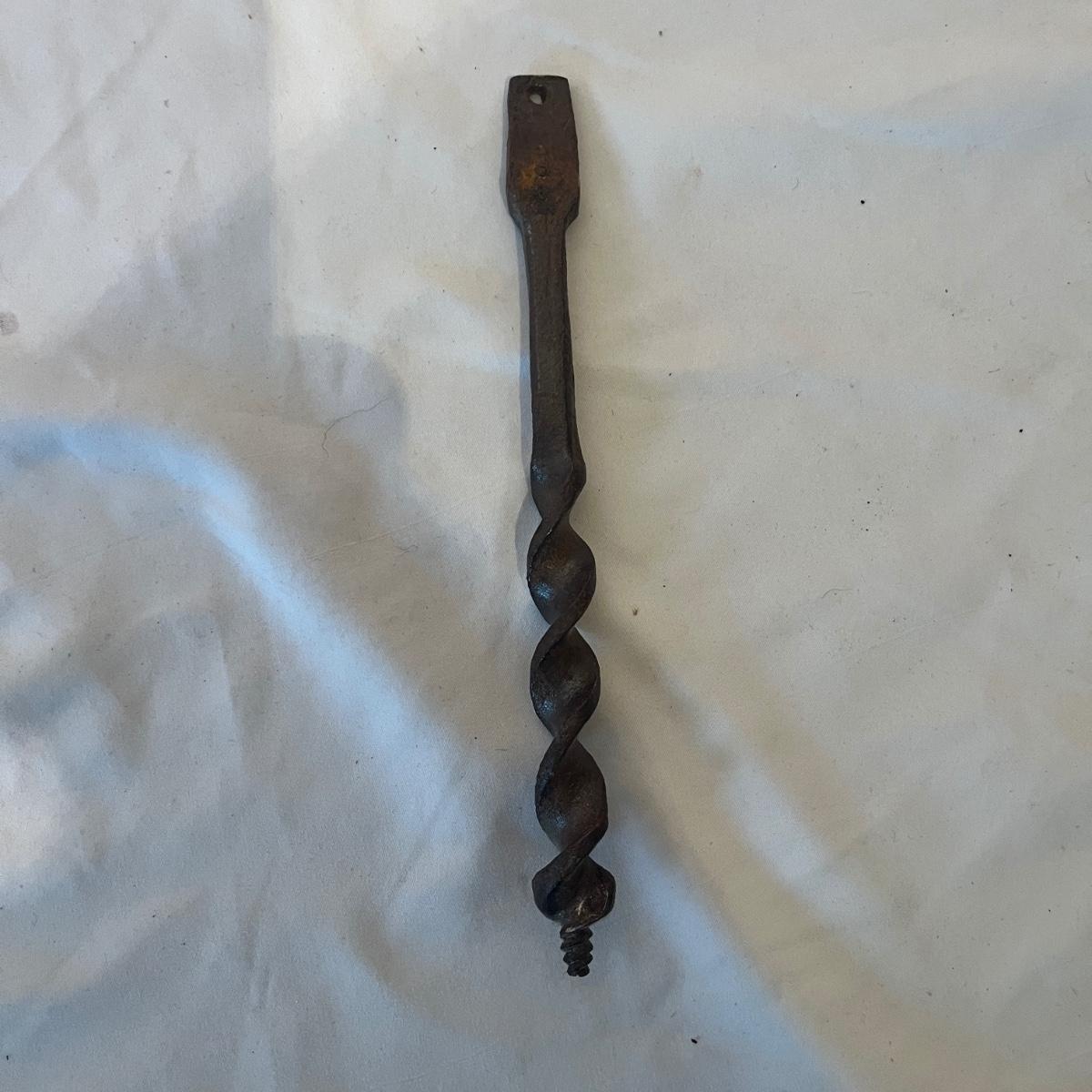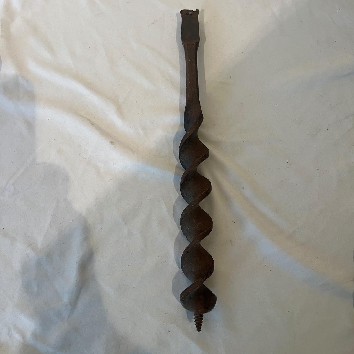 Lot includes two wooden T handle hand drills and two loose bits with a wooden handle. Largest piece measures 18” x 2” x 23”H. See photos for details.