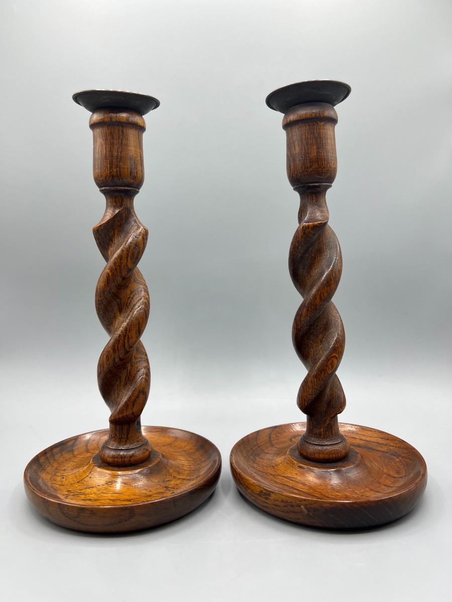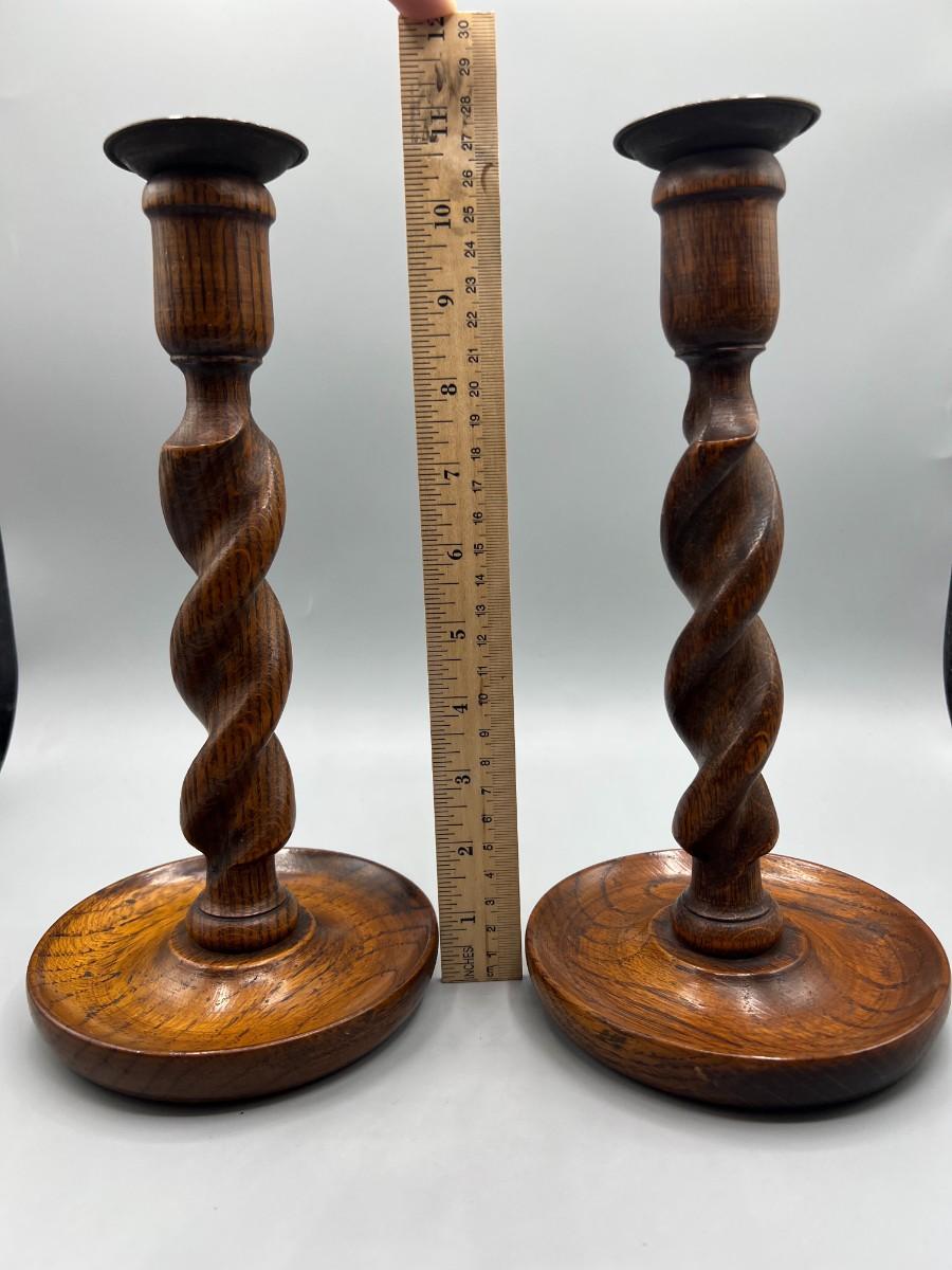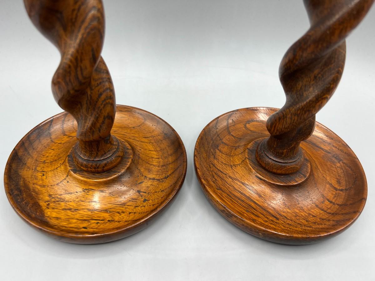 Vintage Pair of Twisting Turned Wood Candlestick Holders