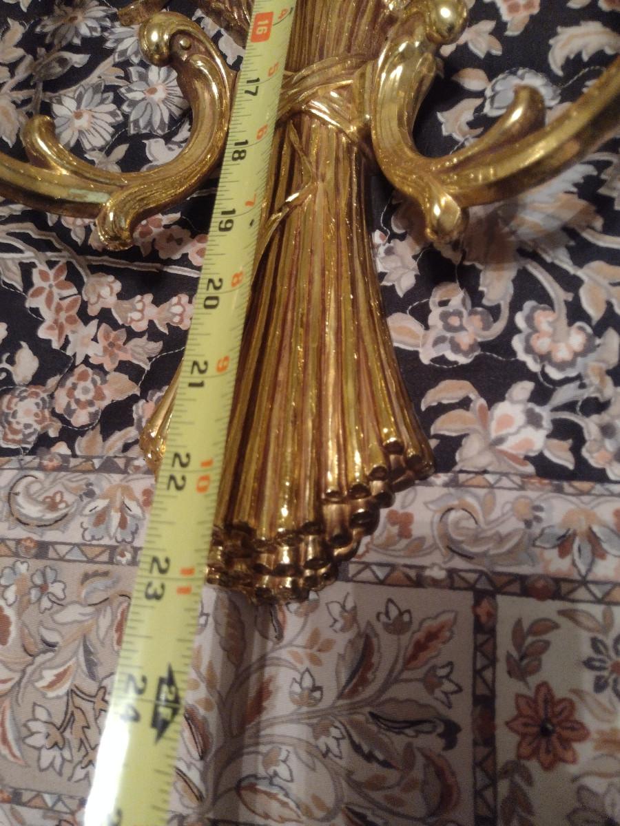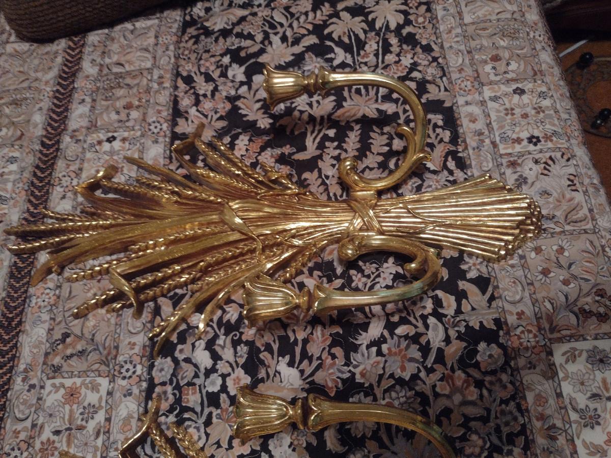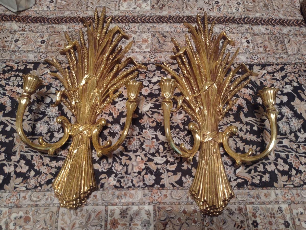 Vintage Pair of Wall Mount Candle Holders. Metal with gilt finish. Bundled wheat design.