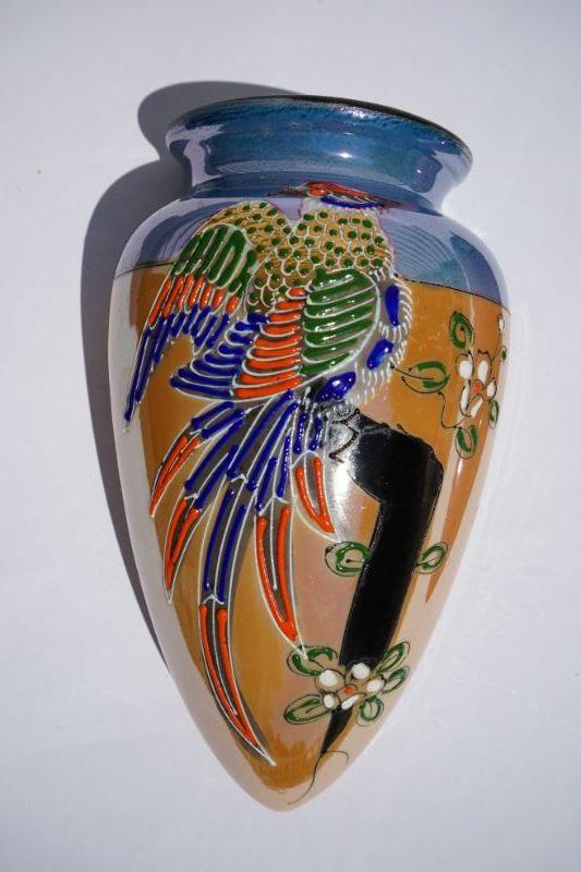 Pair of vintage wall pockets to include a moriage style gold lustre Japanese with bird of paradise 7 1/4" very good condition. Interior is clean.