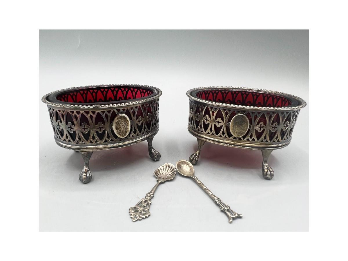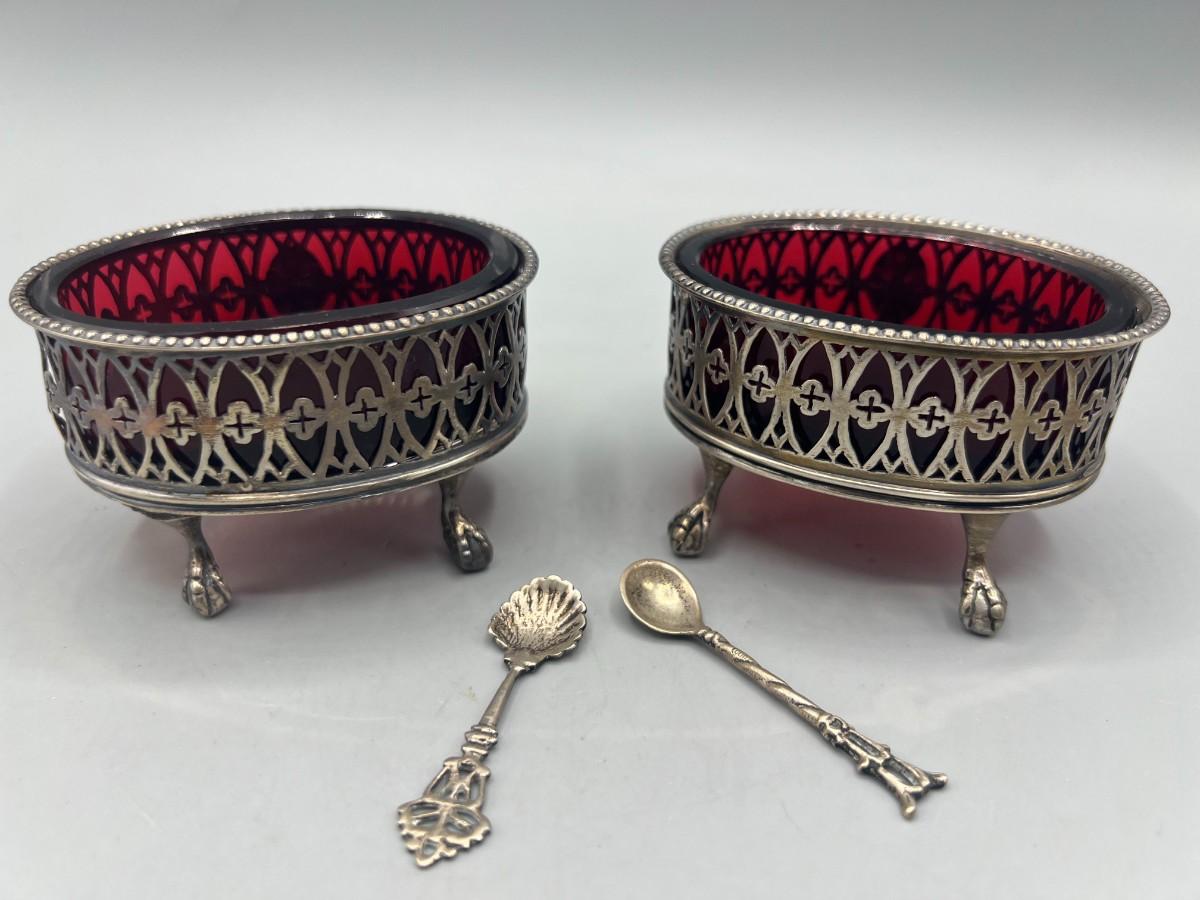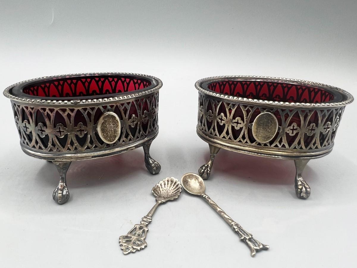 Vintage Pair of West & Son Silver Plated Victorian Style Open Salt & Sugar Bowls with Serving Spoons