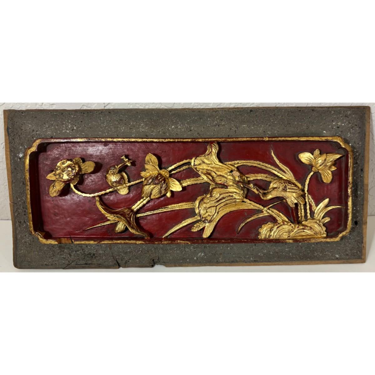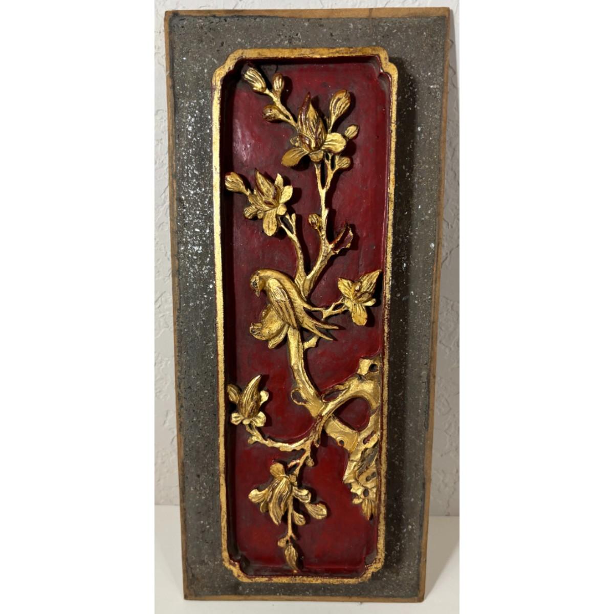 Vintage Pair Tall Chinese Wood Carving Panel Wall Decor Floral Birds Red Gold