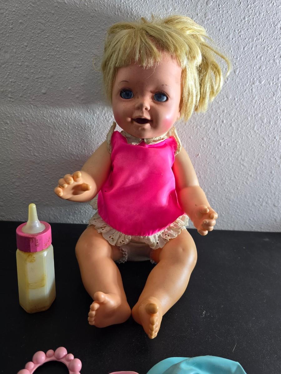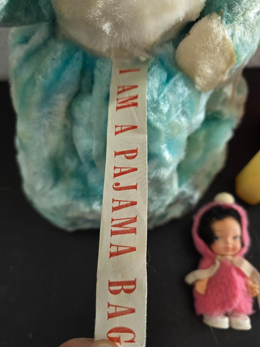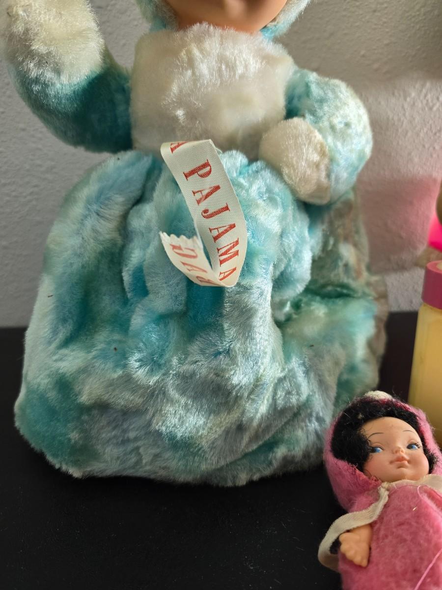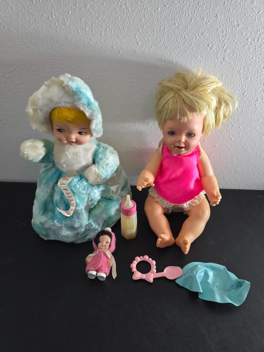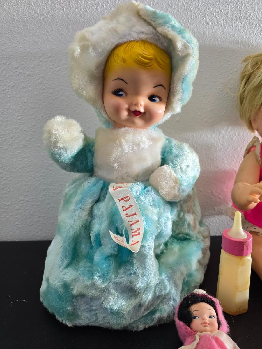 Vintage pajama bag doll with a 1966 Mattel Cheerful Tearful Baby Doll with some accessories