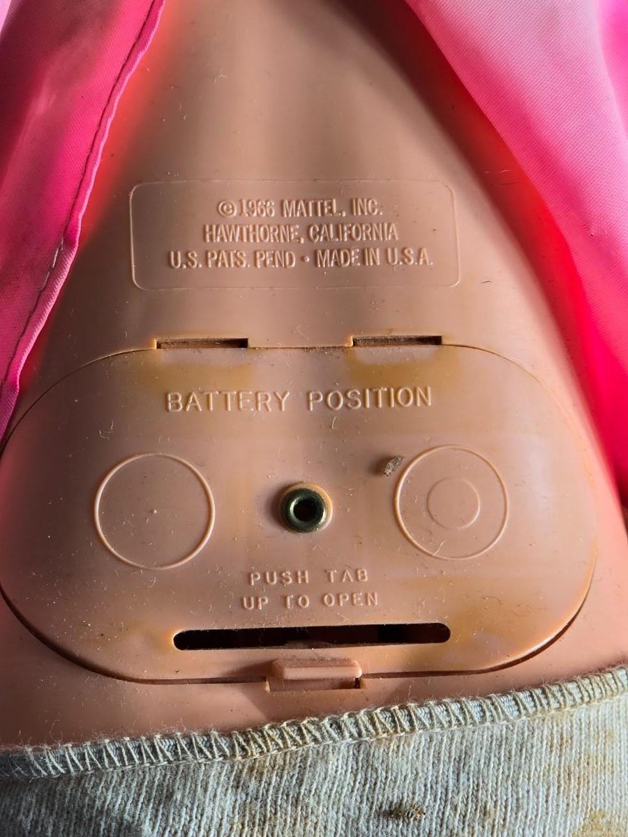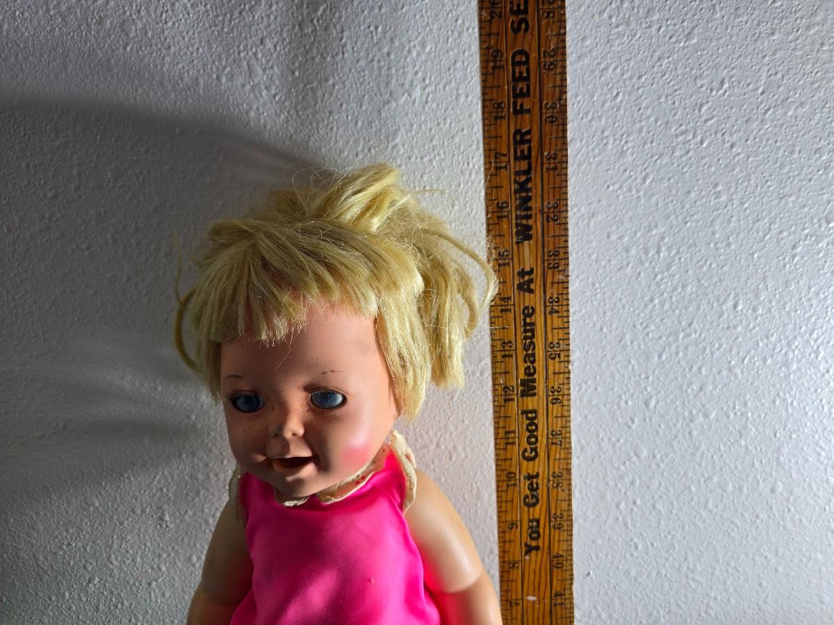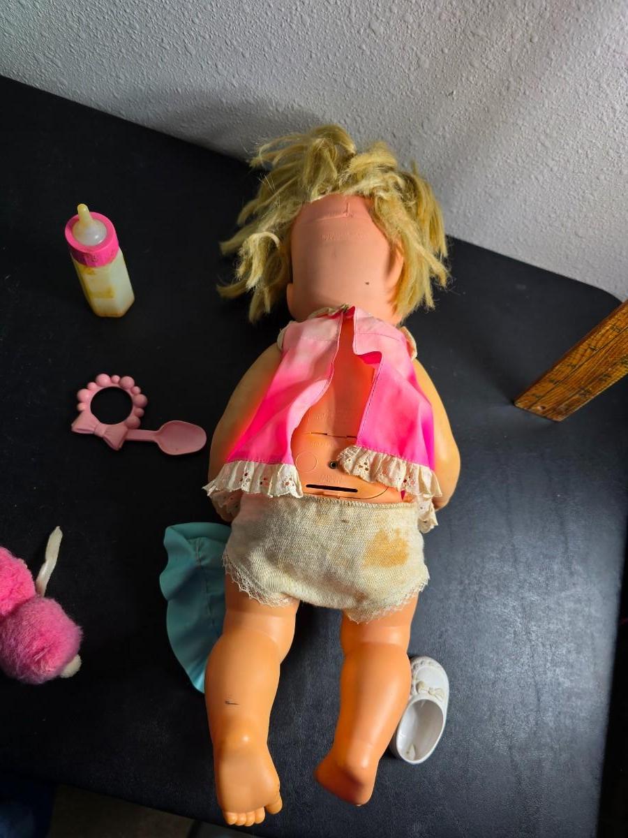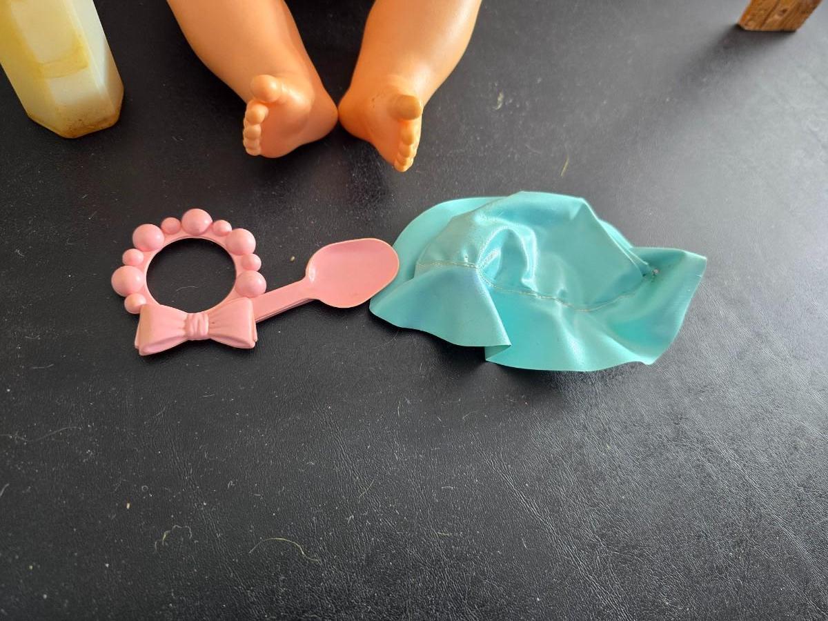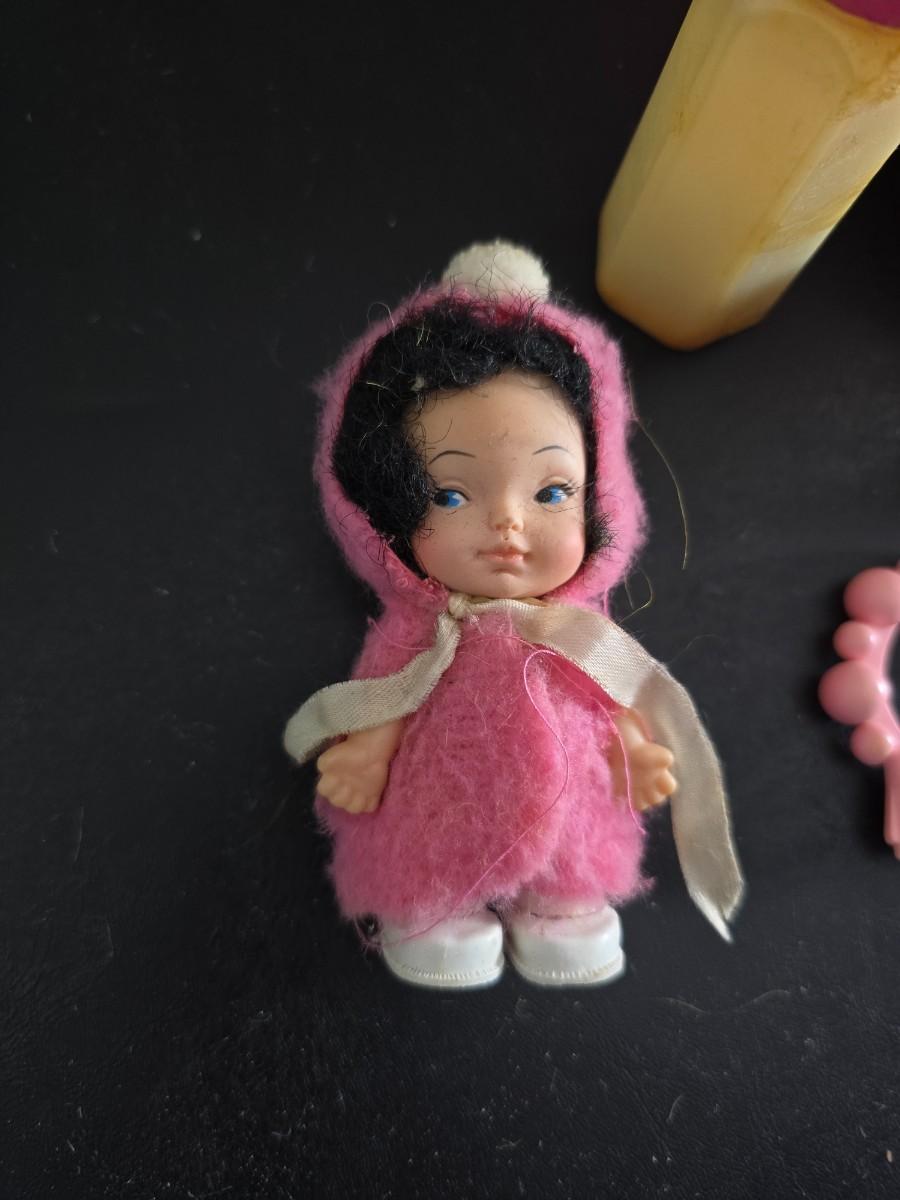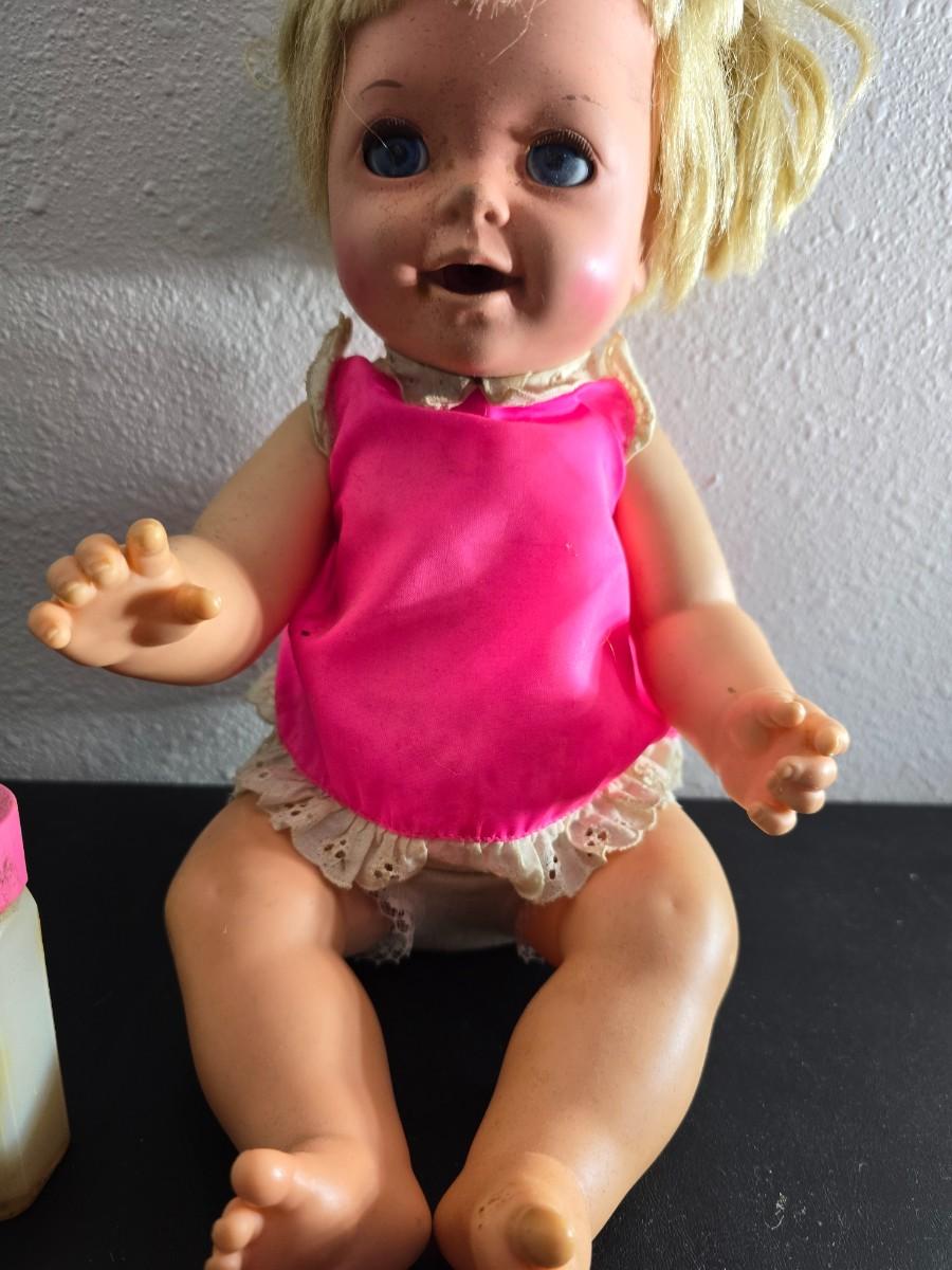 Vintage pajama bag doll with a 1966 Mattel Cheerful Tearful Baby Doll with some accessories