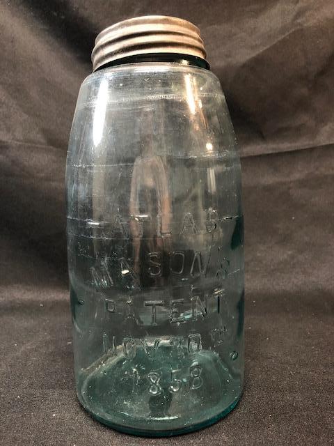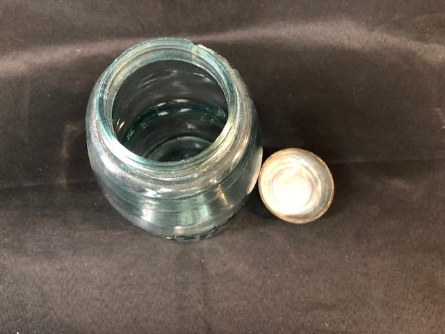Vintage Atals Mason jar. Pale blue glass. Used. Has a chip along the opening.