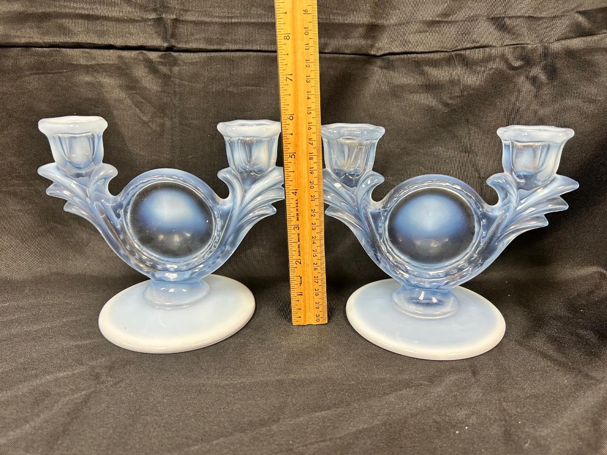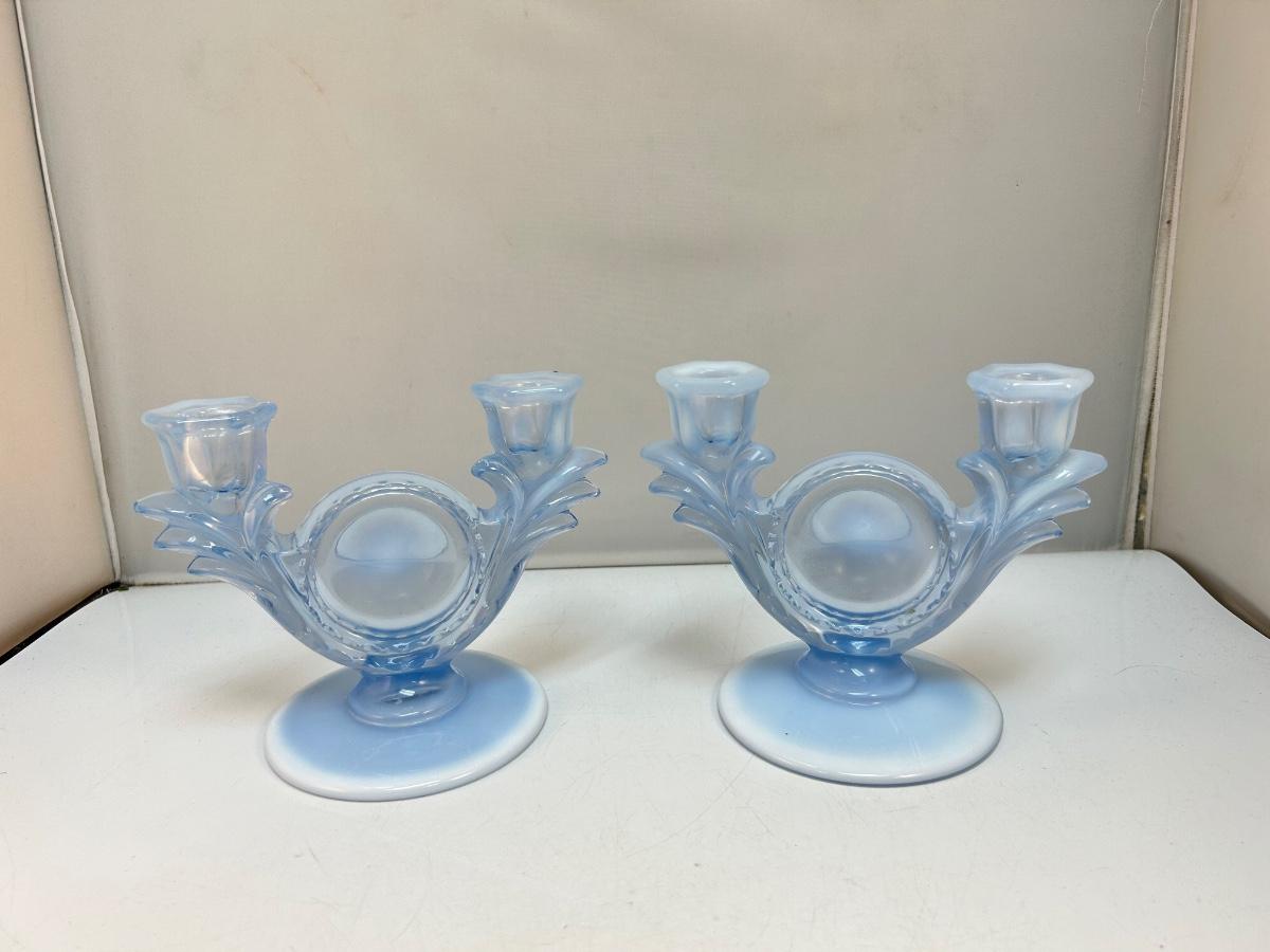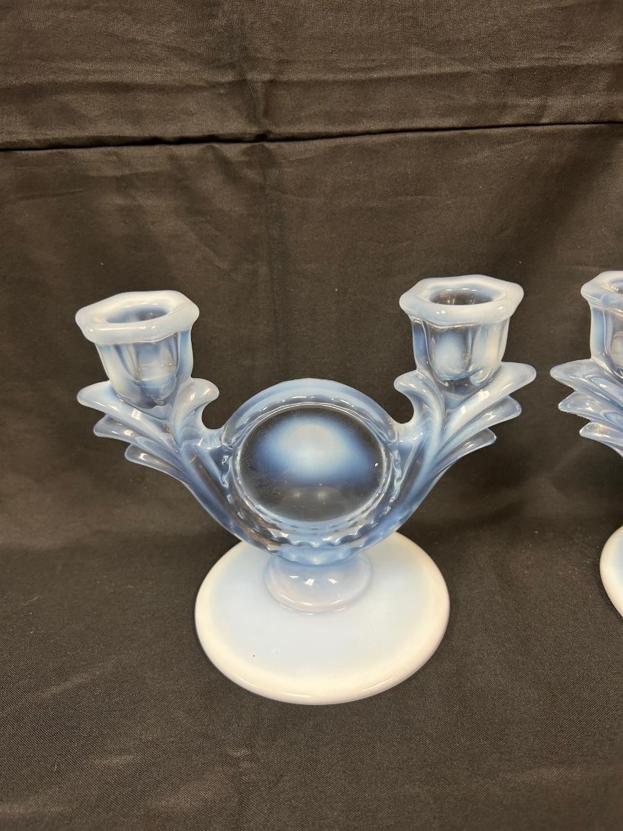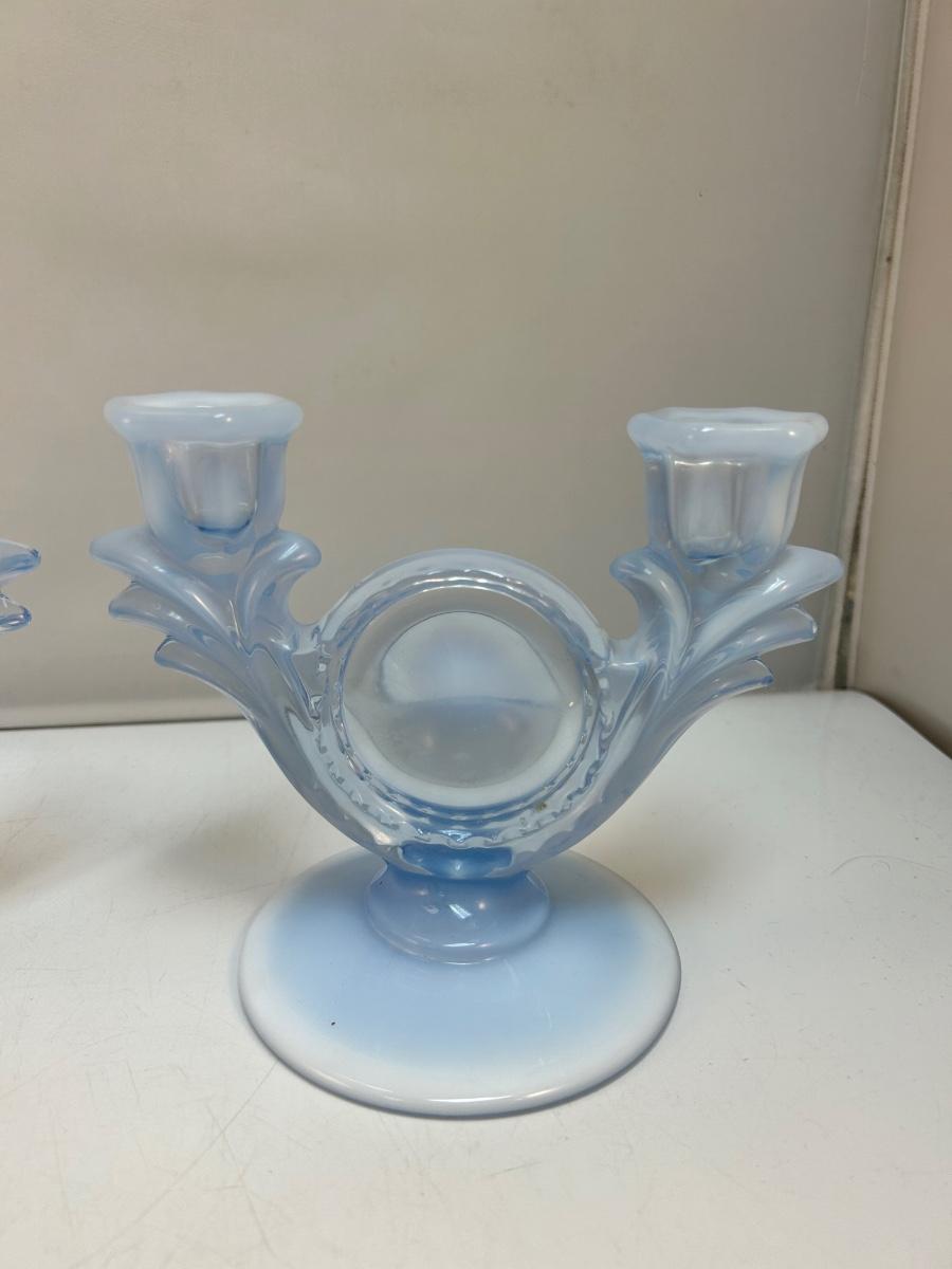 Vintage Pale Blue Glass Opaque Duncan Miller Candelabra Pair
