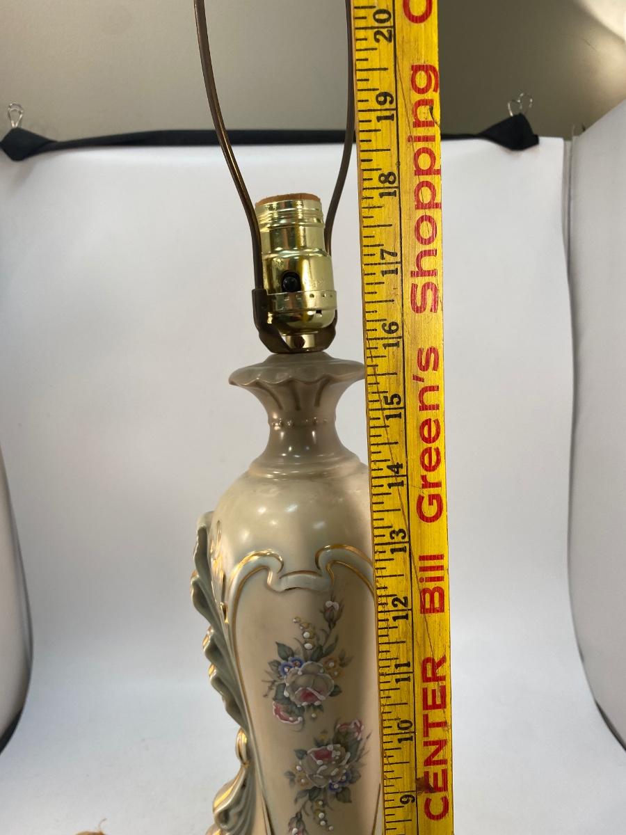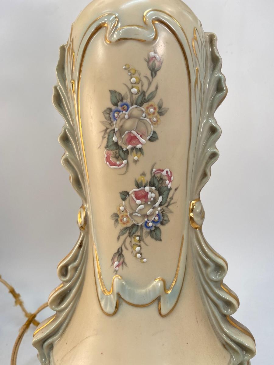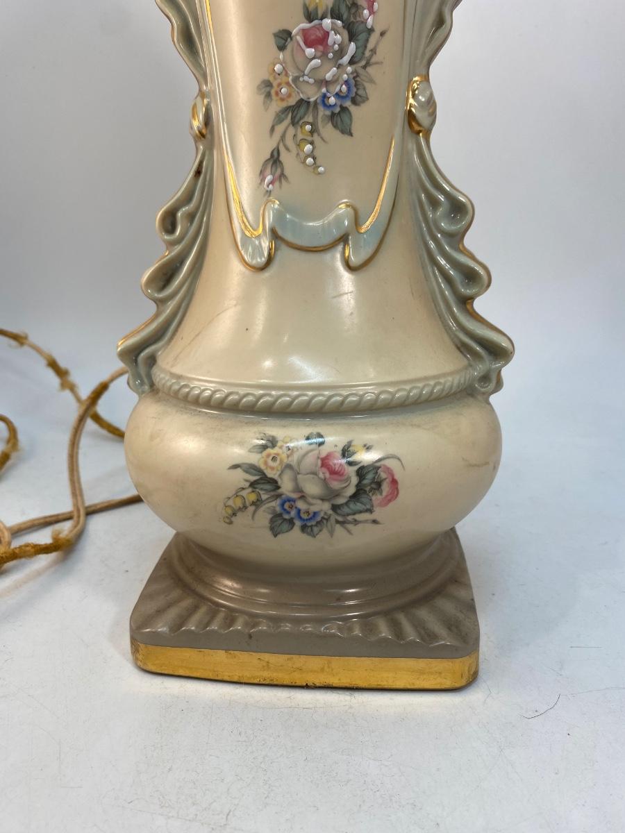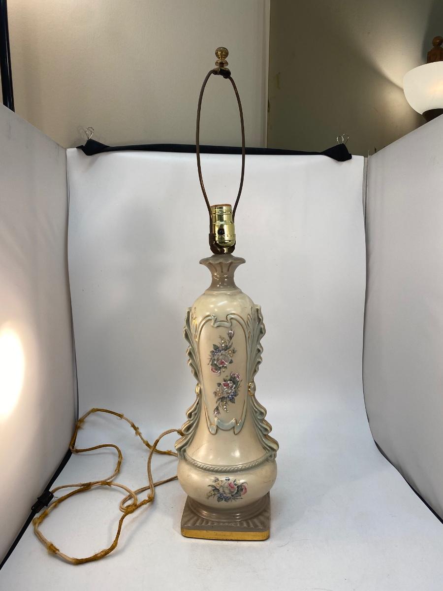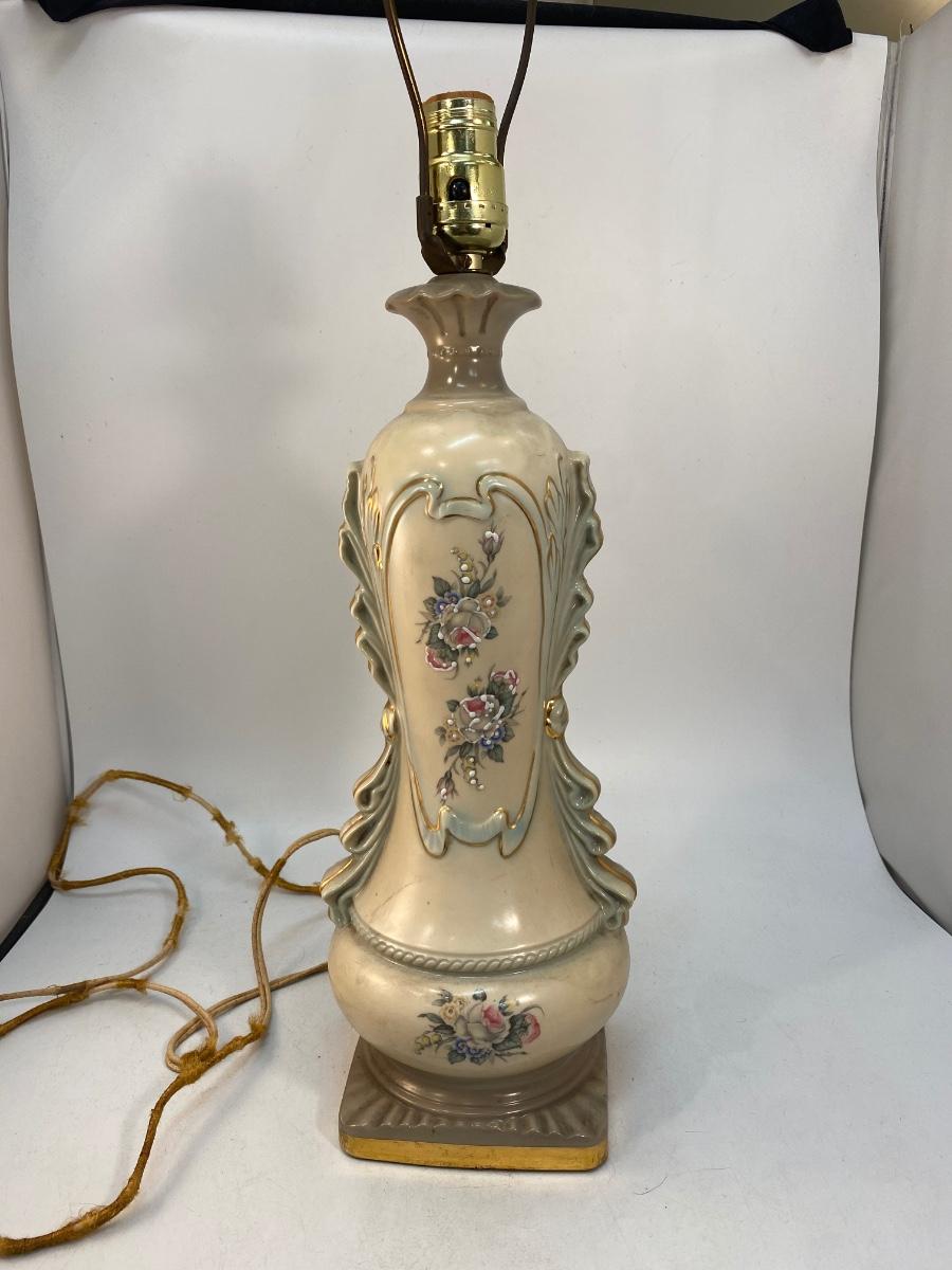 Vintage Pale Blue & Pink Floral Ceramic Table Lamp. Untested, cord looks like it may need to be replaced. No shade. In overall nice vintage condition.