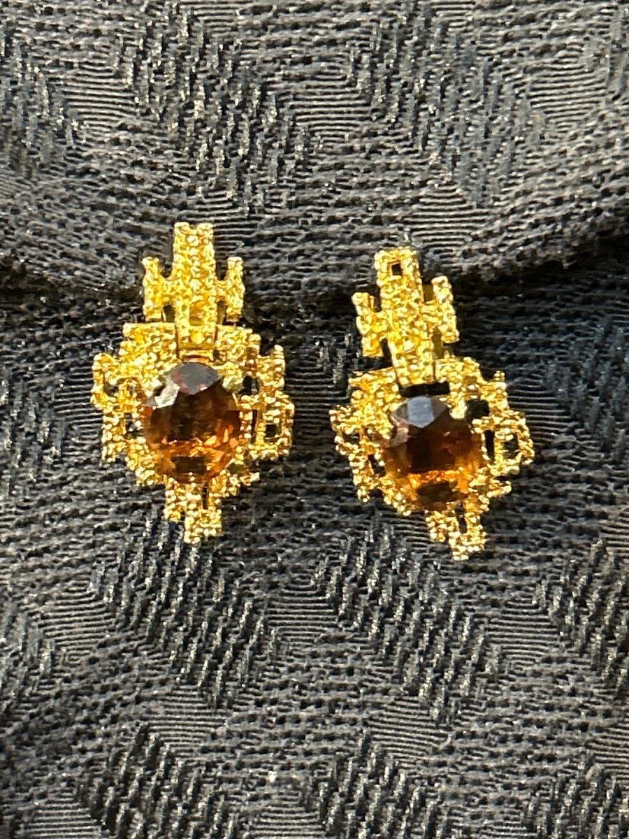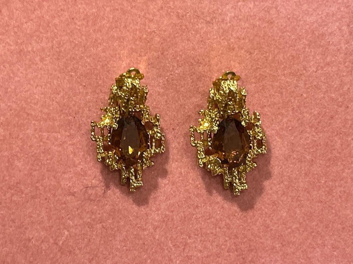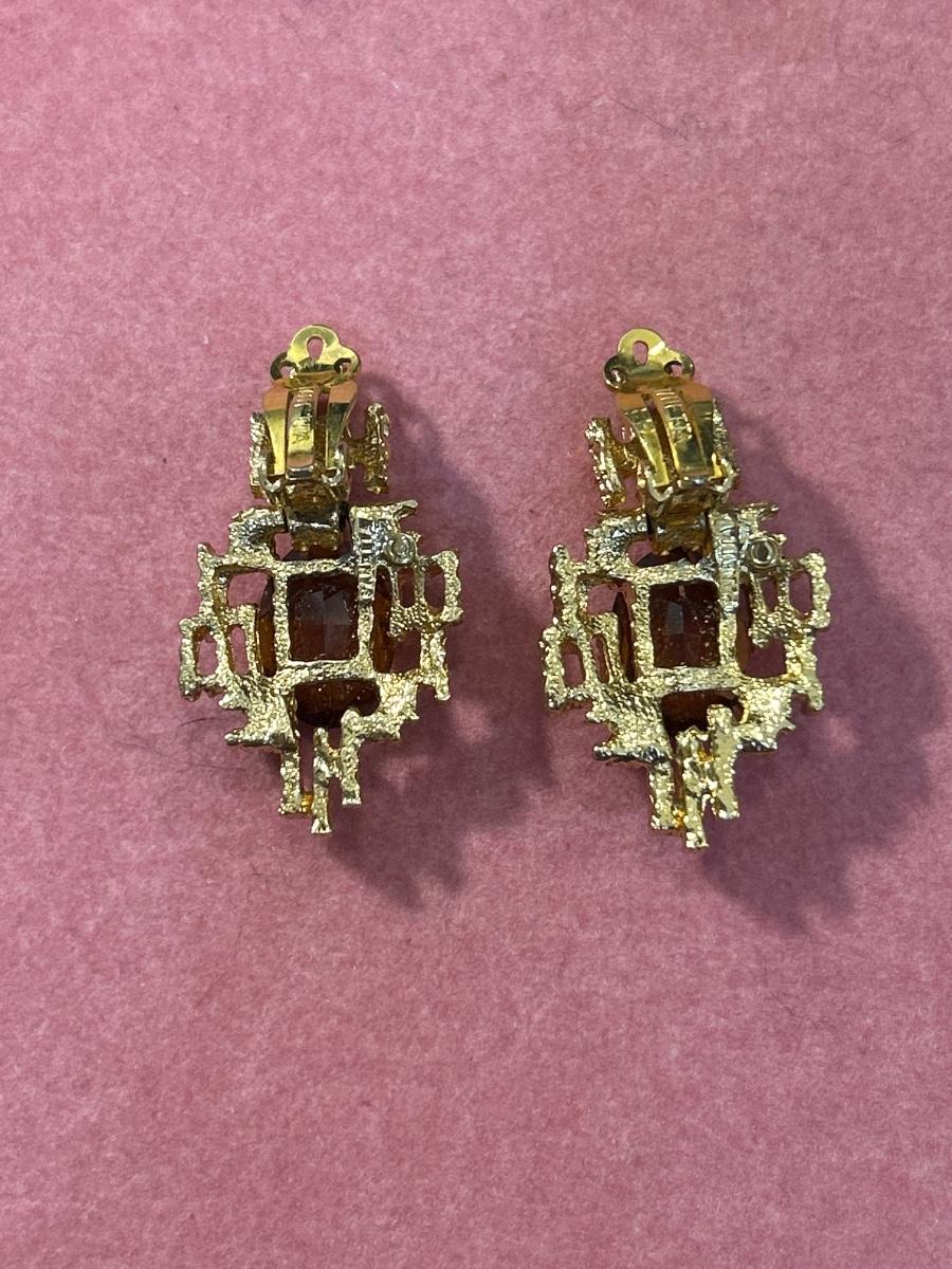 Vintage PANETTA Faux Amethyst MOD BRUTALIST Dangle Drop Clip EARRINGS Gold Tone
