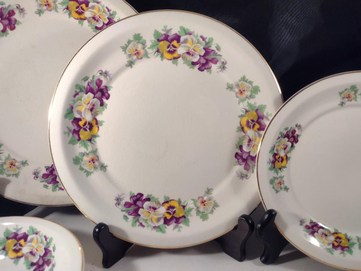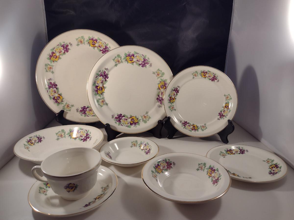 Vintage Pansy Design Dinnerware- Maker Unknown- Approx 94 Pieces. All in used condition- expect occasional chip, crack, or discoloration. Dinner plate (10 1/4")- 9, luncheon plate (9 1/4")- 12, dessert plate (7 1/4")- 11, bread plate (6")- 12, salad/soup bowl (7 3/4")- 7, fruit bowl (5 1/4")- 5, 6" bowl- 9, cup- 11, saucer- 11, vegetable bowl (8 3/4")- 3, platter (9 1/2")- 1, platter (13 1/2")- 1, gravy boat-1, creamer- 1.