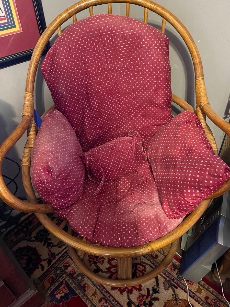 Vintage papasan chair Perfect Shape Cushions have sun exposure