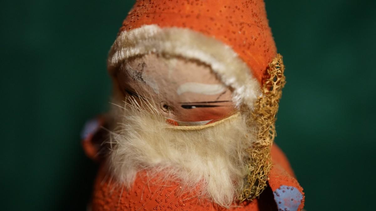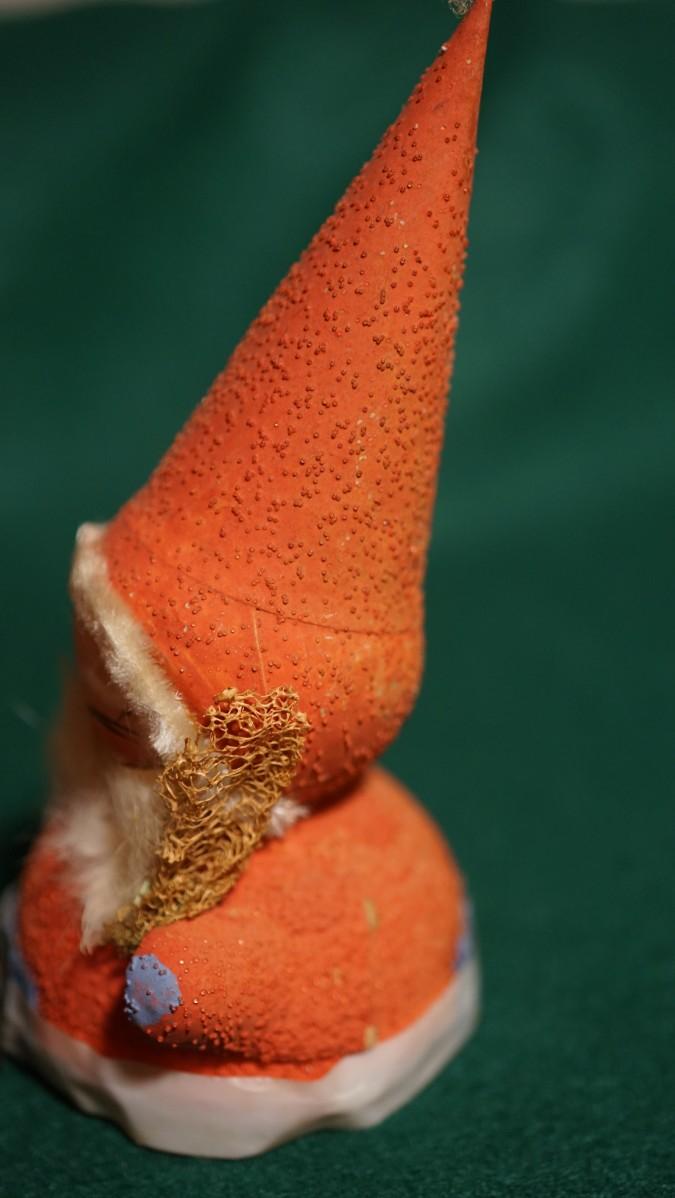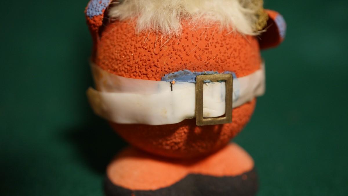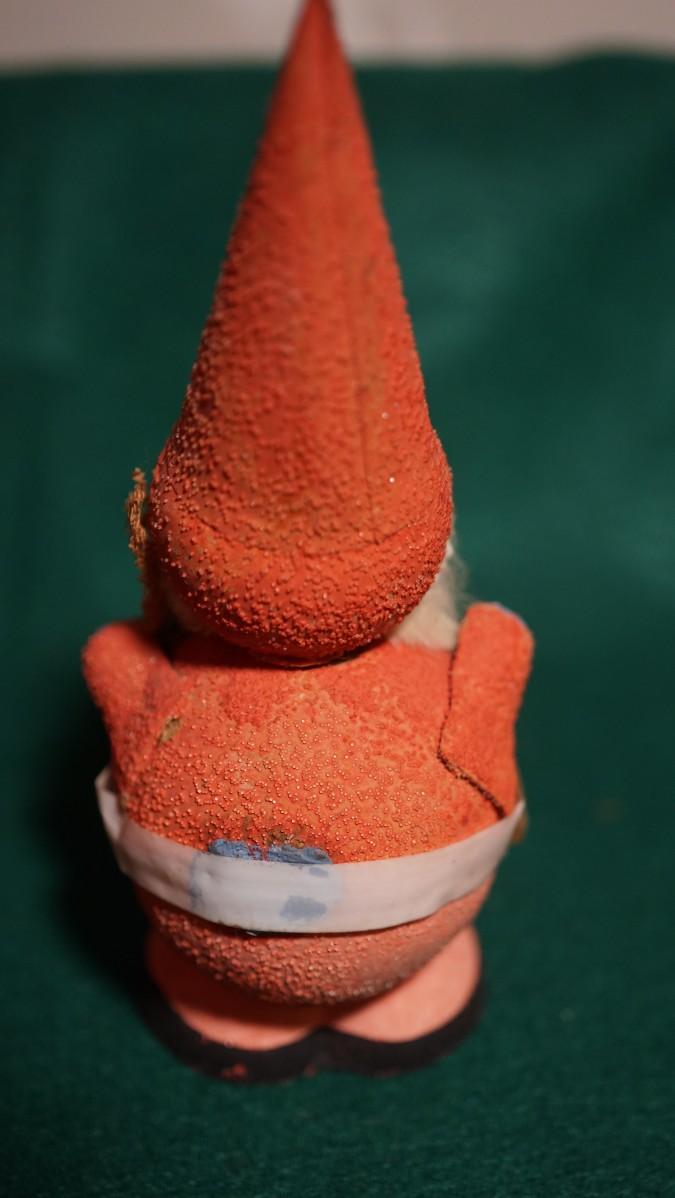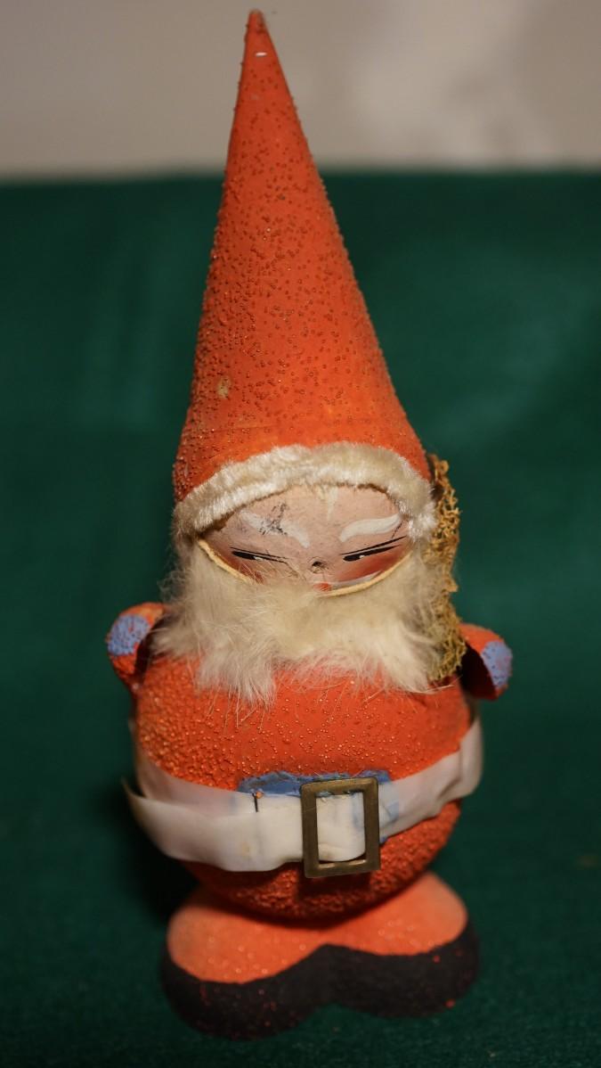 Condition: good to fair. the white belt is little loose. he is missing his little red nose. you could you a holly berry from the mistle to to fix. overall some wear and pitting to the fuzzy finish he had at one time. Hand painted face is good.