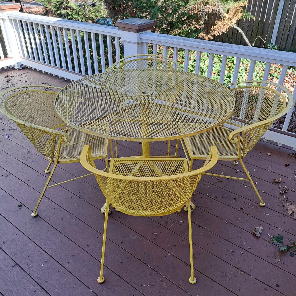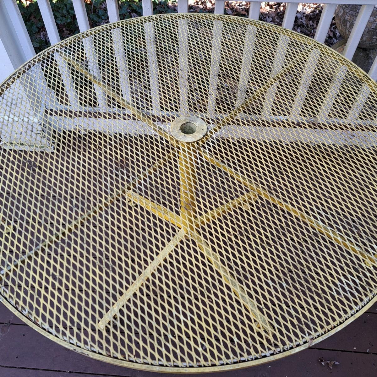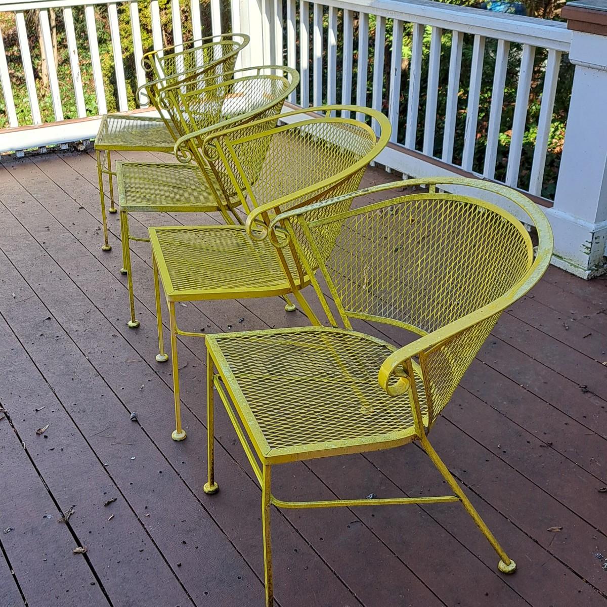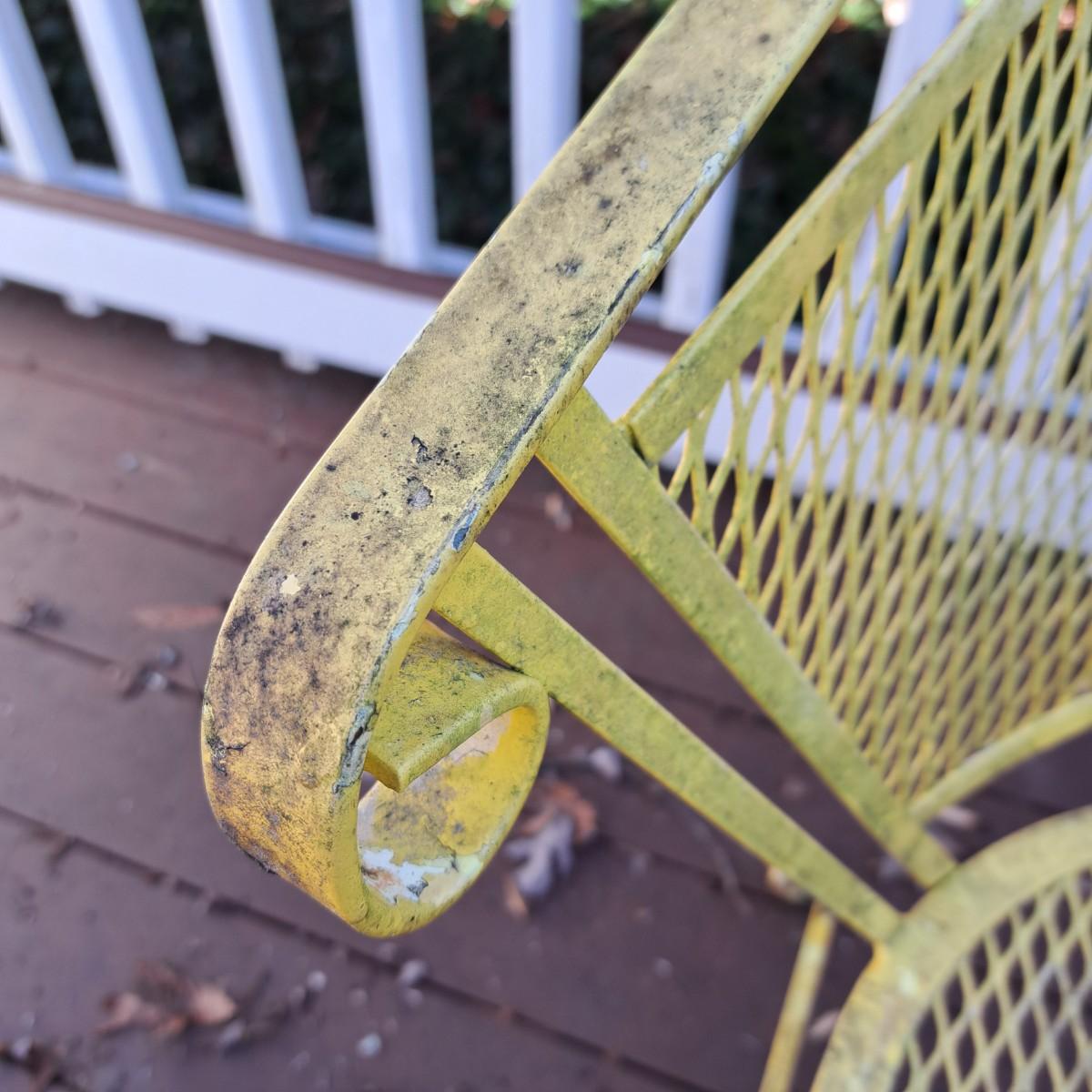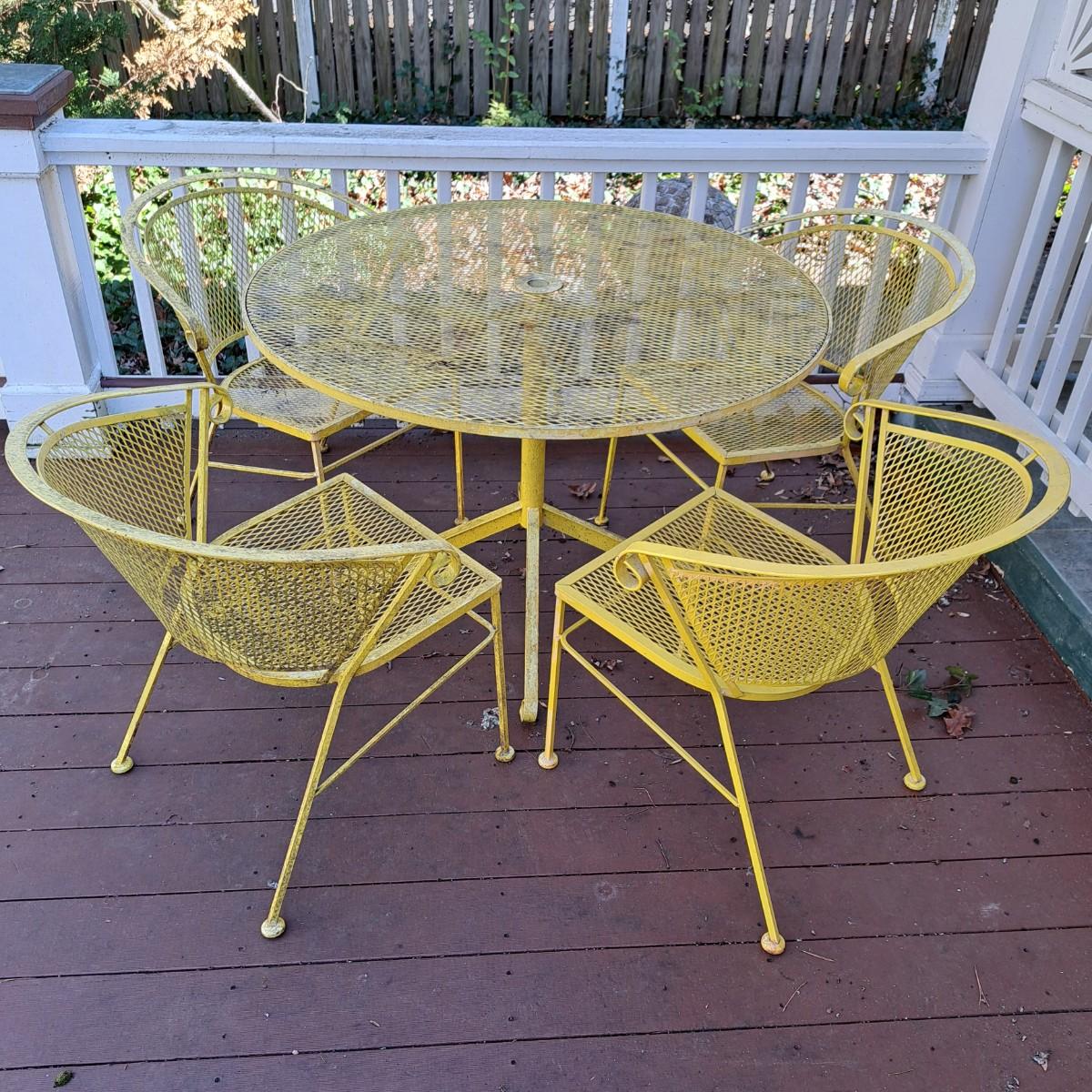 Marvelous vintage woven metal mesh patio set in a bright parakeet yellow. Includes a round four leg scrolled patio table 42"D x 29"H and four matching barrel back arm chairs, each 25" arm-to-arm and 29"H. Table has a hole in center to accept an umbrella. Though this set has a bit of chippy paint on its arms and legs (may need a good wash due to normal algae build-up) it is one of the nicest vintage patio sets we've seen! Local pickup only.