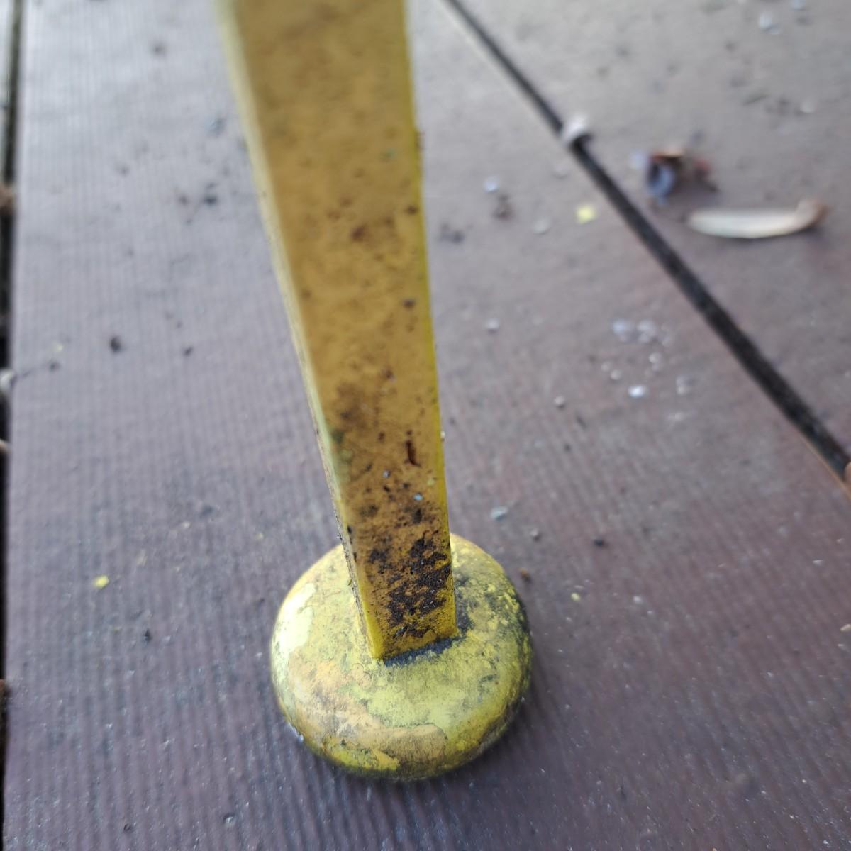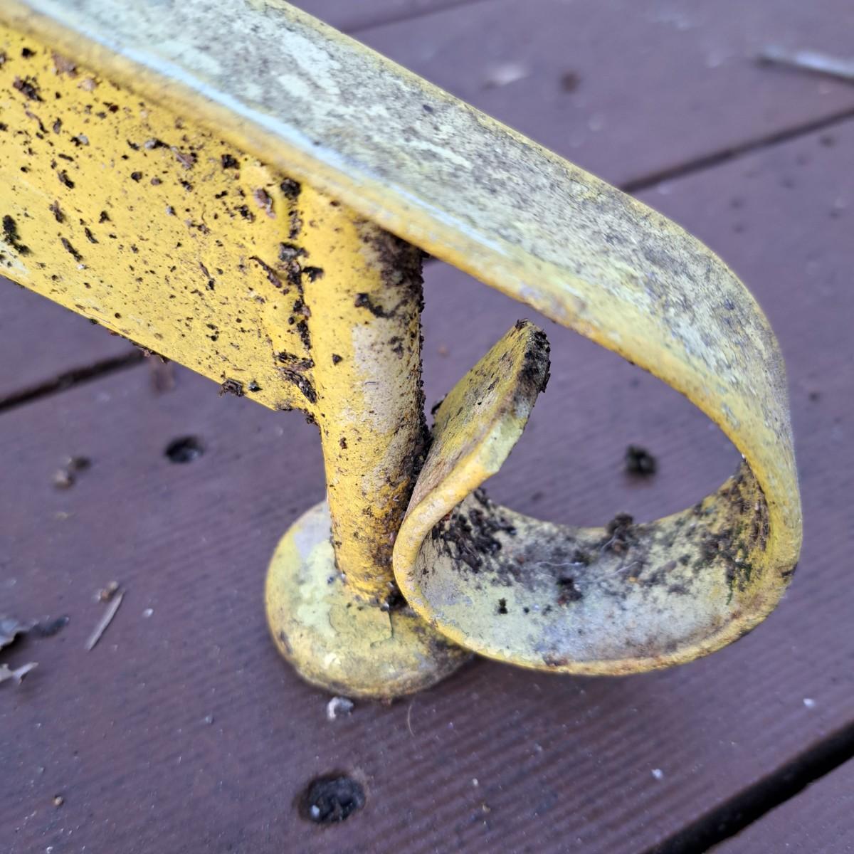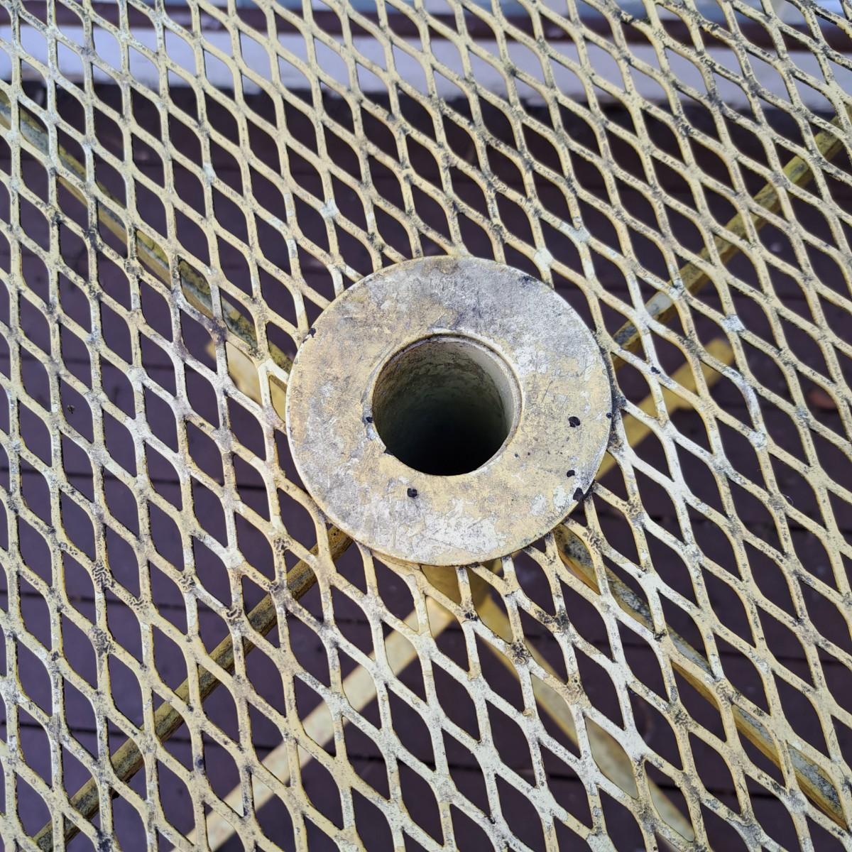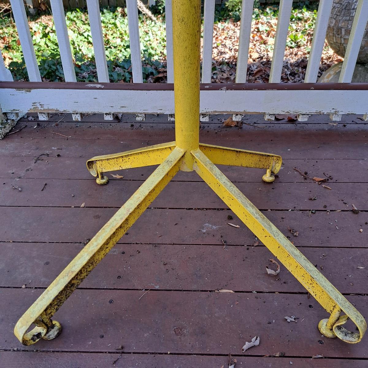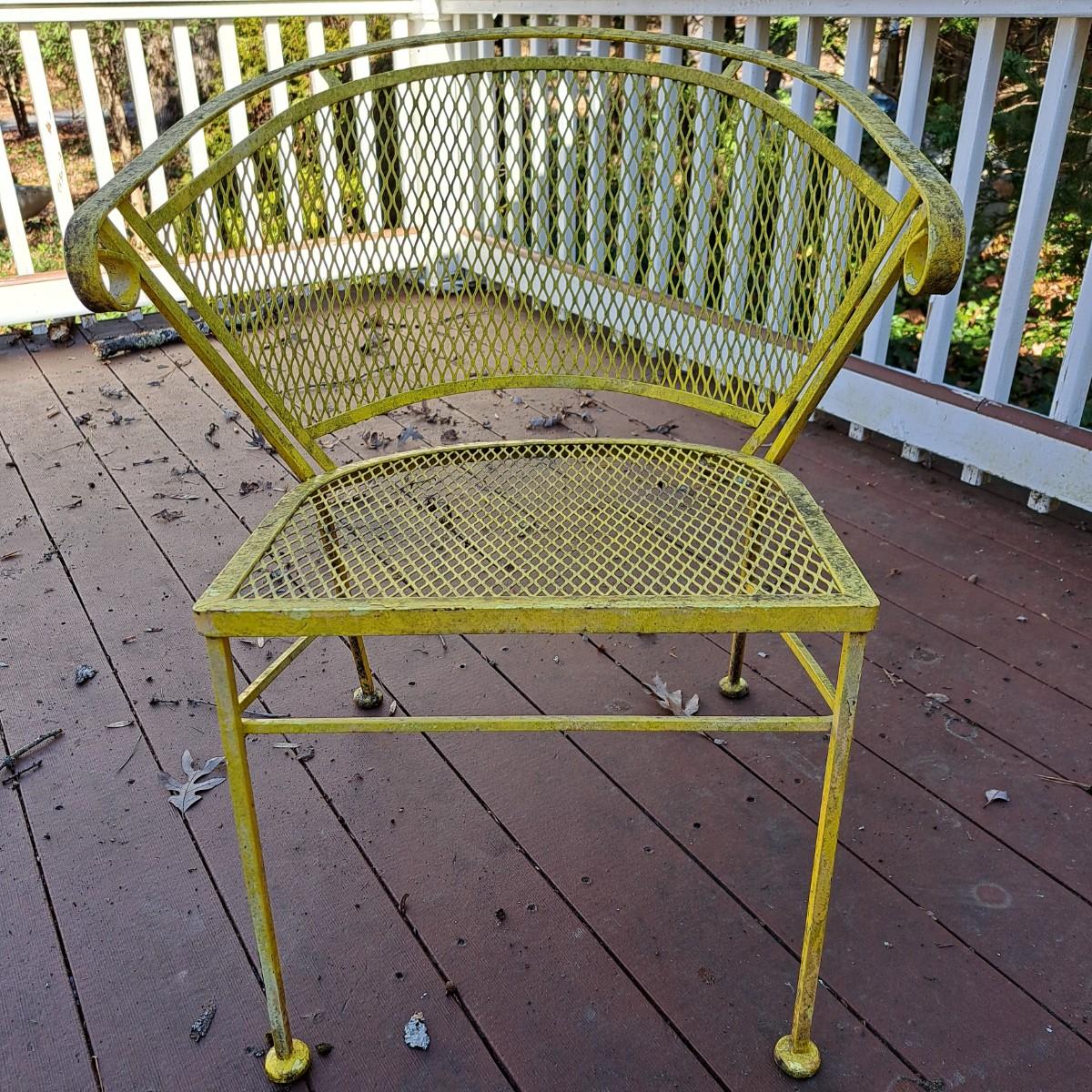 Marvelous vintage woven metal mesh patio set in a bright parakeet yellow. Includes a round four leg scrolled patio table 42"D x 29"H and four matching barrel back arm chairs, each 25" arm-to-arm and 29"H. Table has a hole in center to accept an umbrella. Though this set has a bit of chippy paint on its arms and legs (may need a good wash due to normal algae build-up) it is one of the nicest vintage patio sets we've seen! Local pickup only.