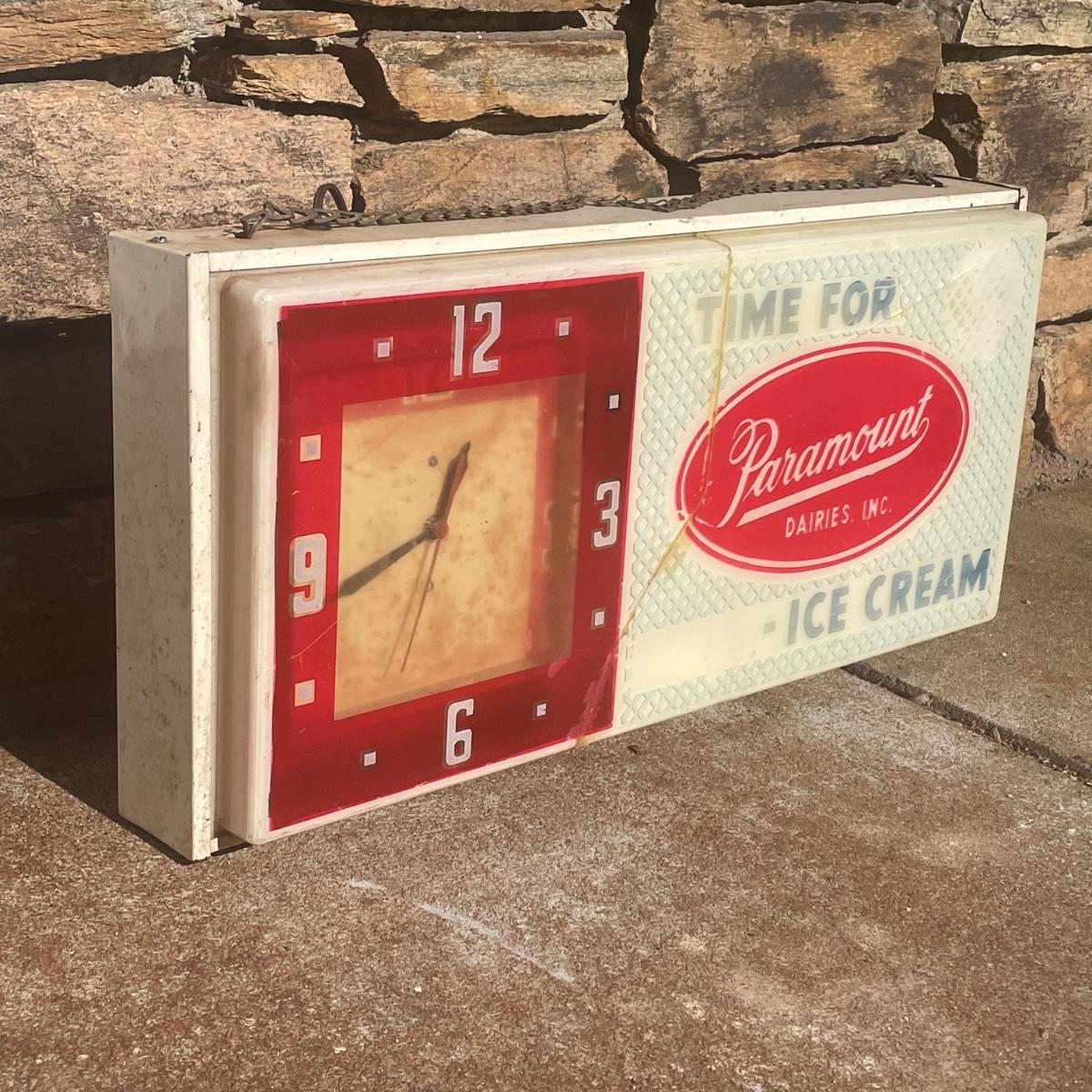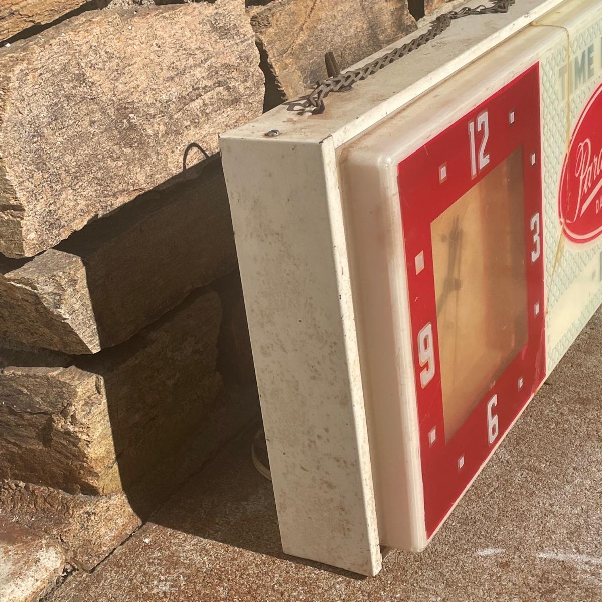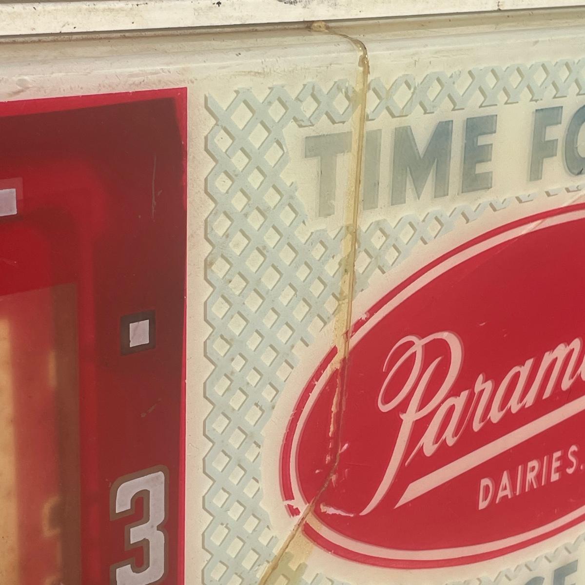 This vintage electric Paramount Dairies Clock measures 25” x 12” x 4”. It powers on and the second hand moves. The orange knob that sets the time currently does not work, it is possibly just jammed. This plastic clock has a crack that runs the height of the front of the piece, see images. It has a chain to hang the piece.
