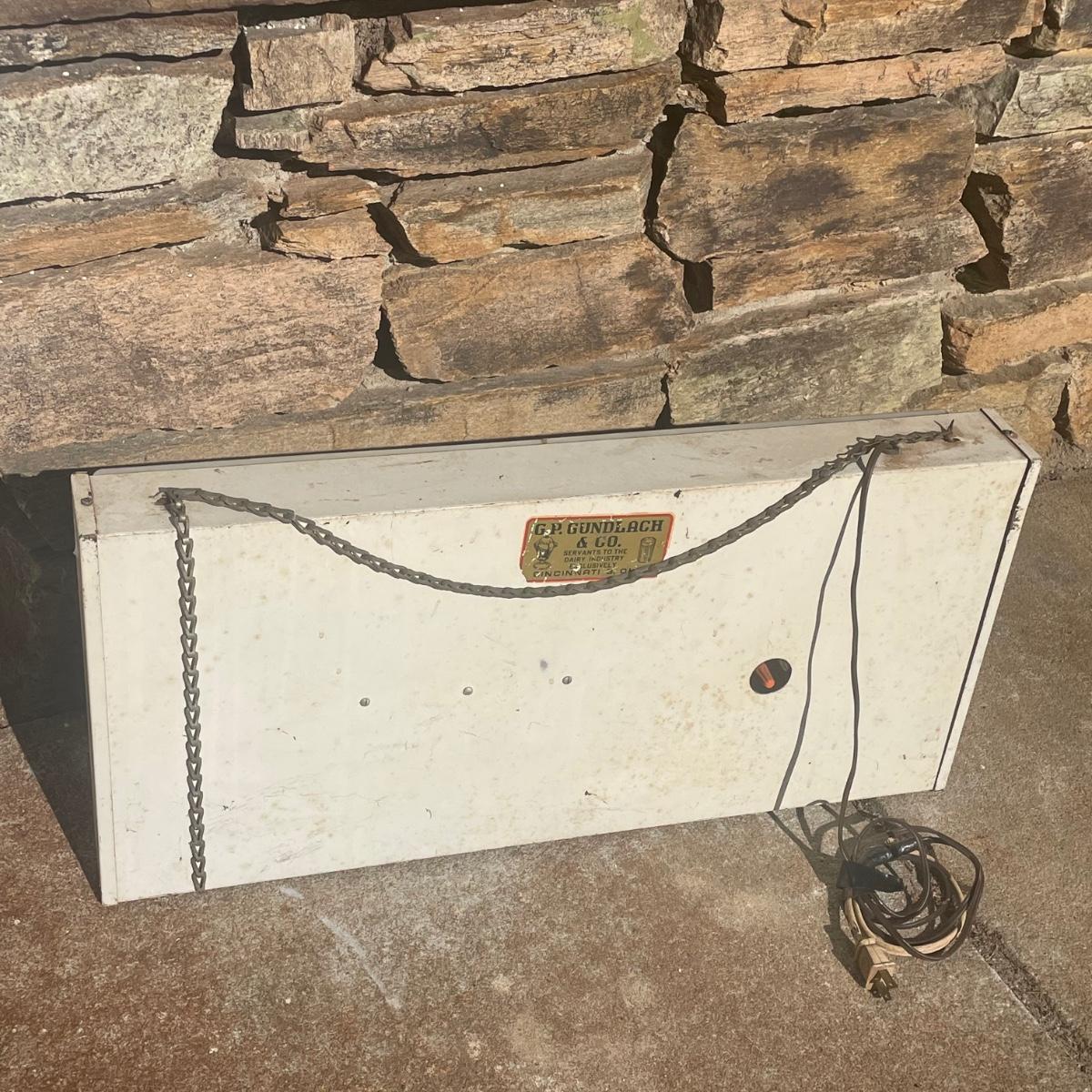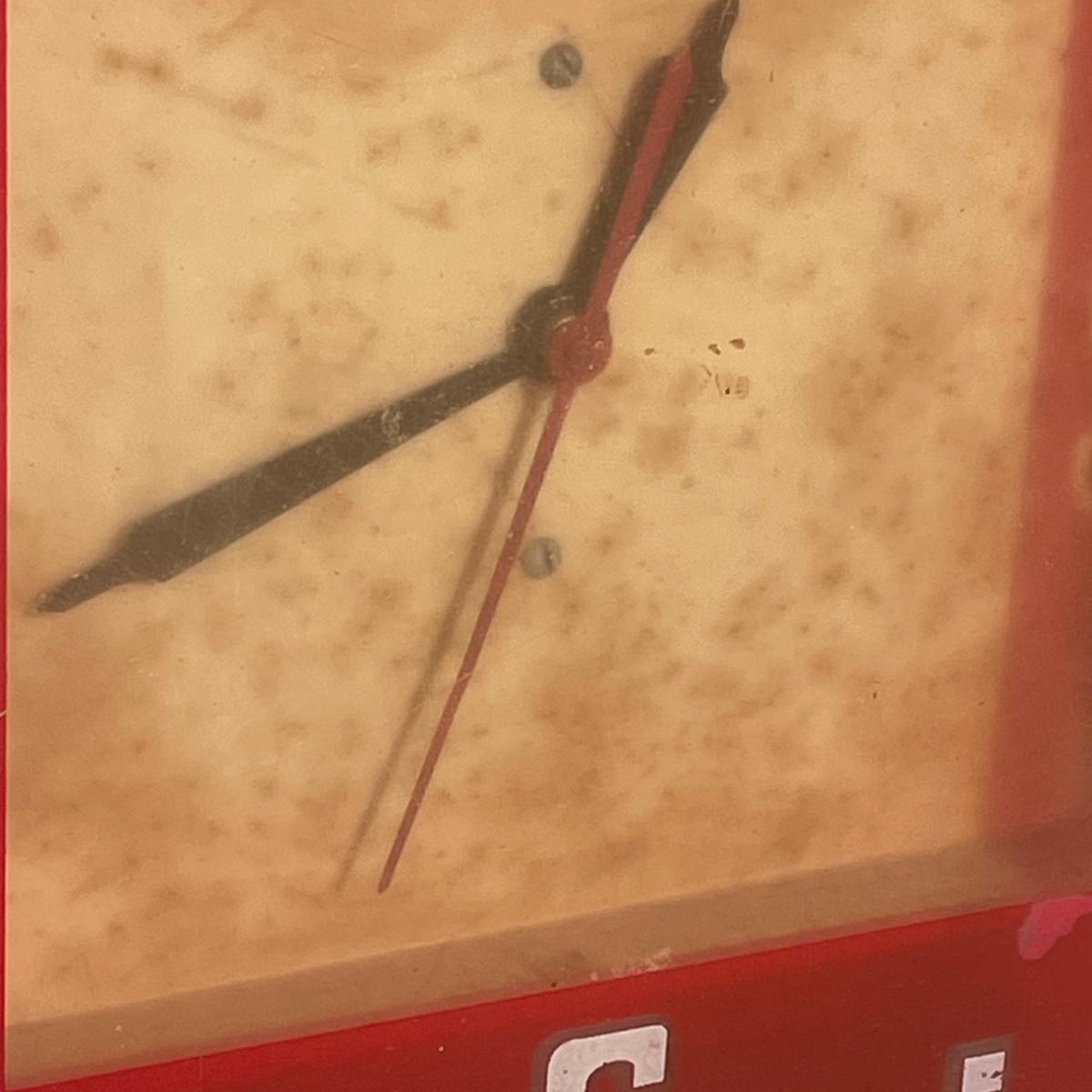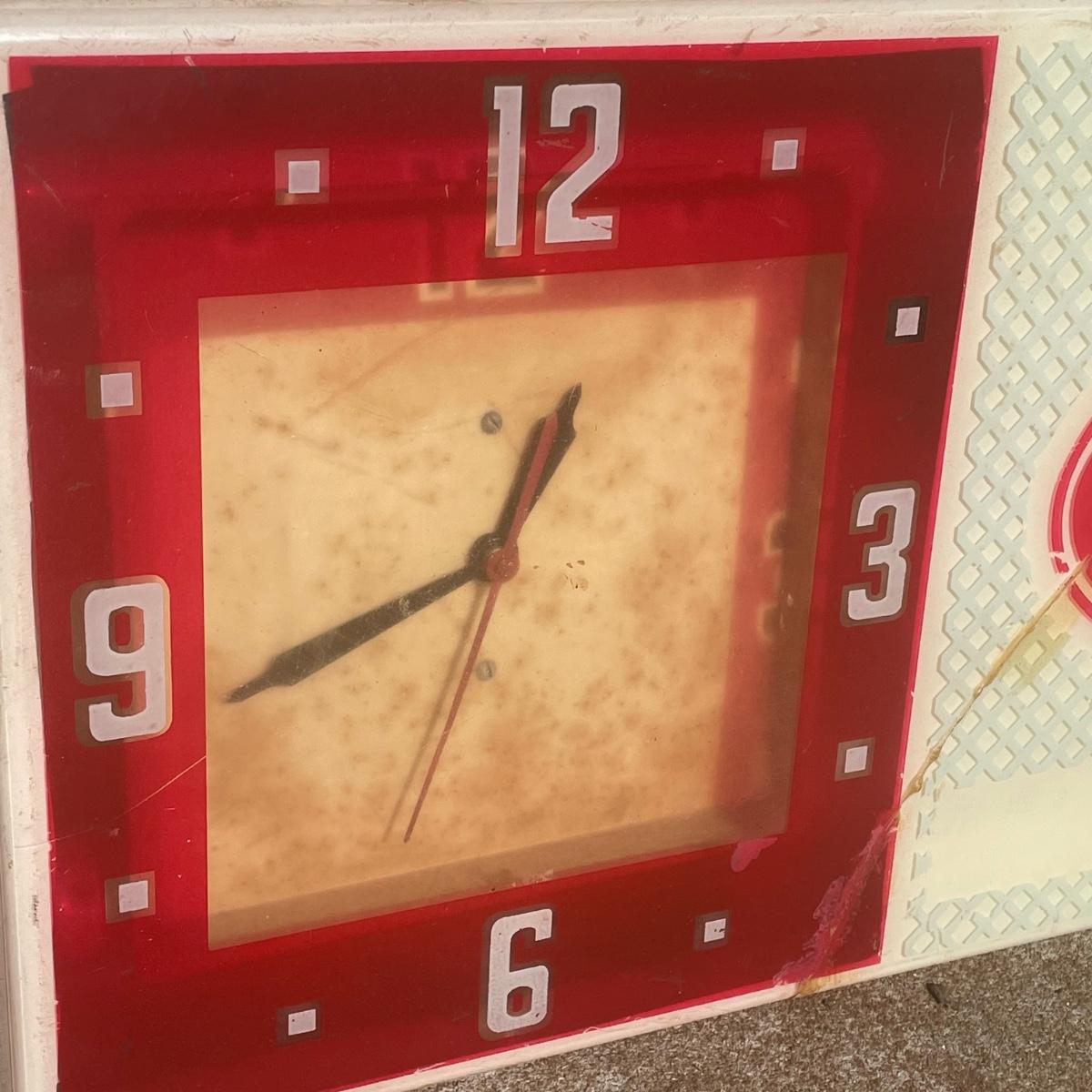 This vintage electric Paramount Dairies Clock measures 25” x 12” x 4”. It powers on and the second hand moves. The orange knob that sets the time currently does not work, it is possibly just jammed. This plastic clock has a crack that runs the height of the front of the piece, see images. It has a chain to hang the piece.