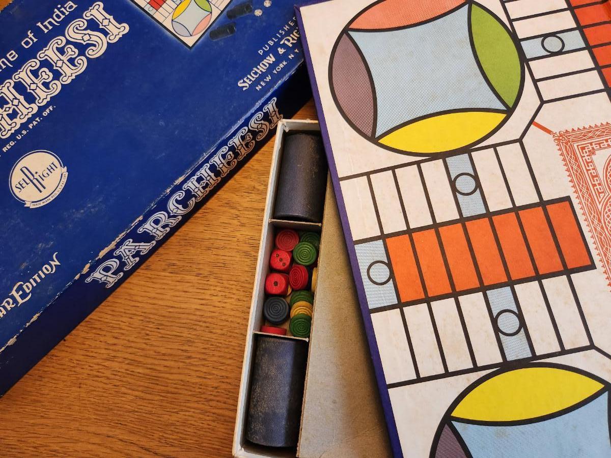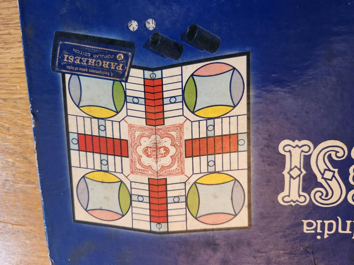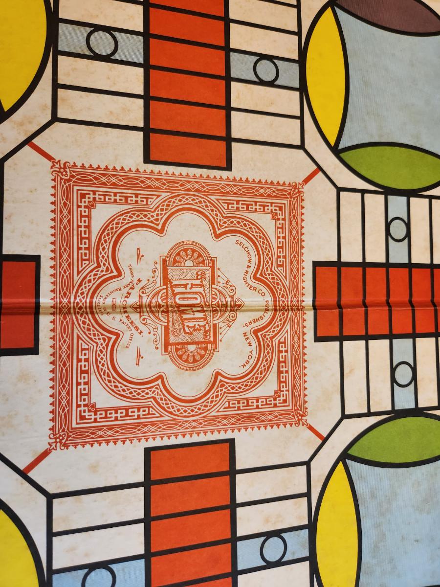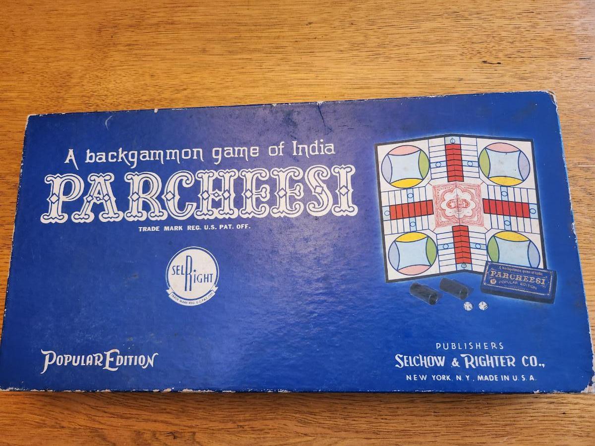 This auction lot is for a Vintage Parcheesi Game. Box is old and a tad rough with a taped bottom holding it together. Appears to have all the required pieces. Play on. Or display.