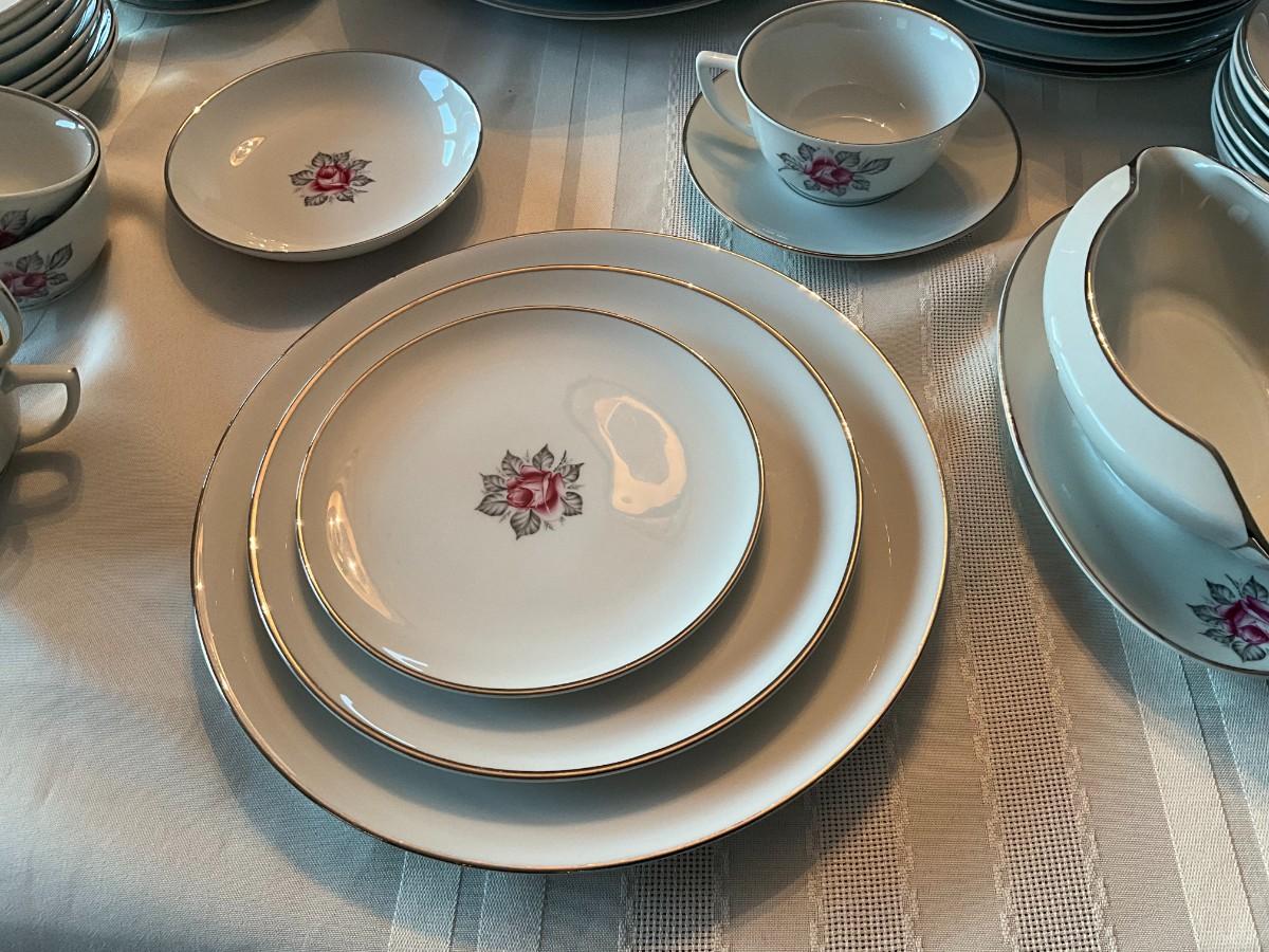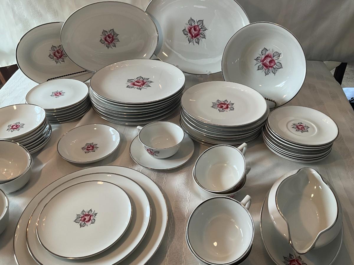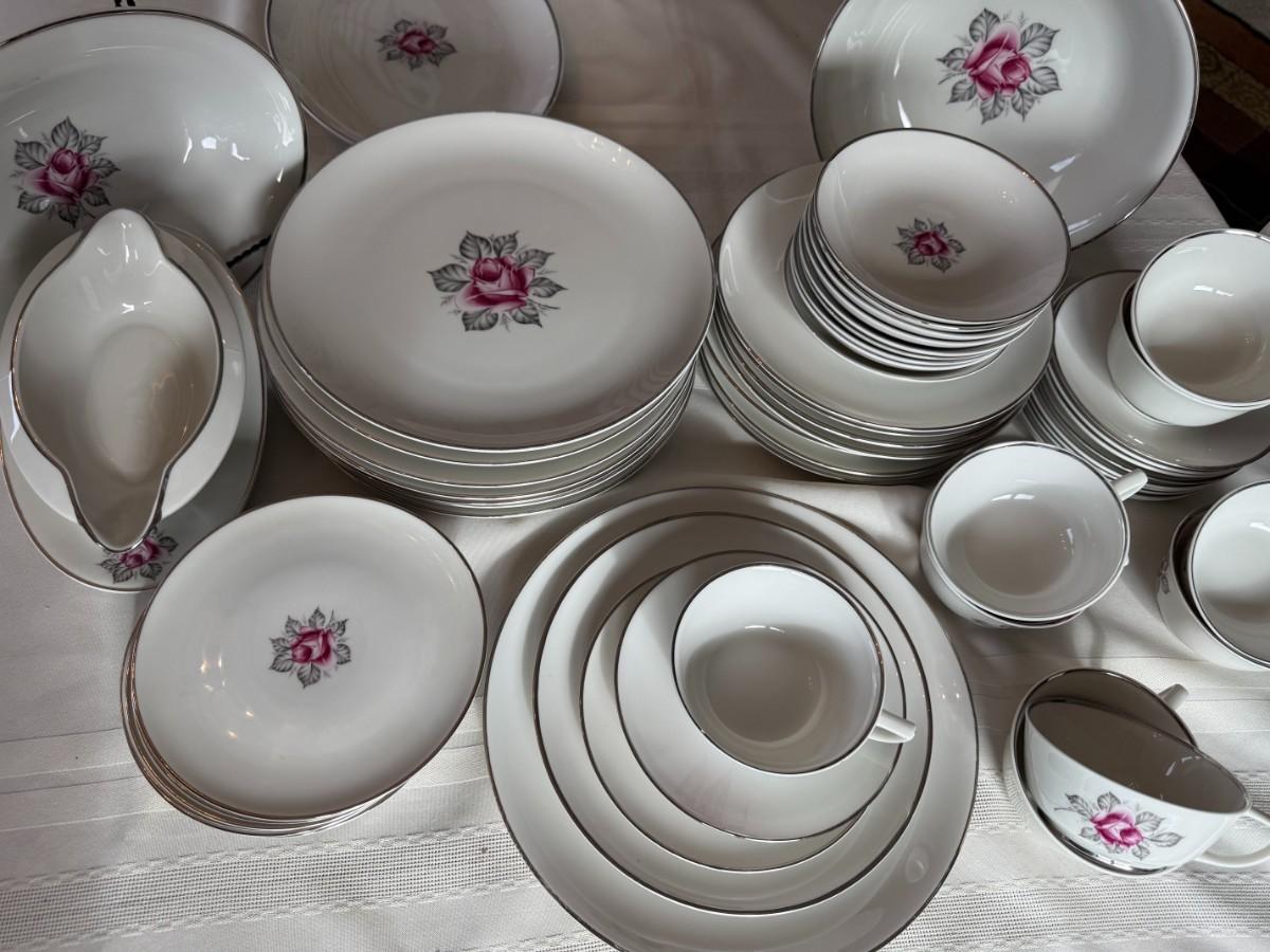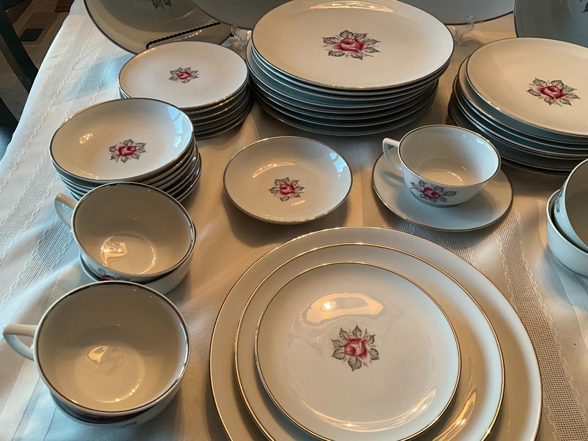 There are 8 plus place settings along with serving dishes. All in great shape, no chips. 60 total pieces