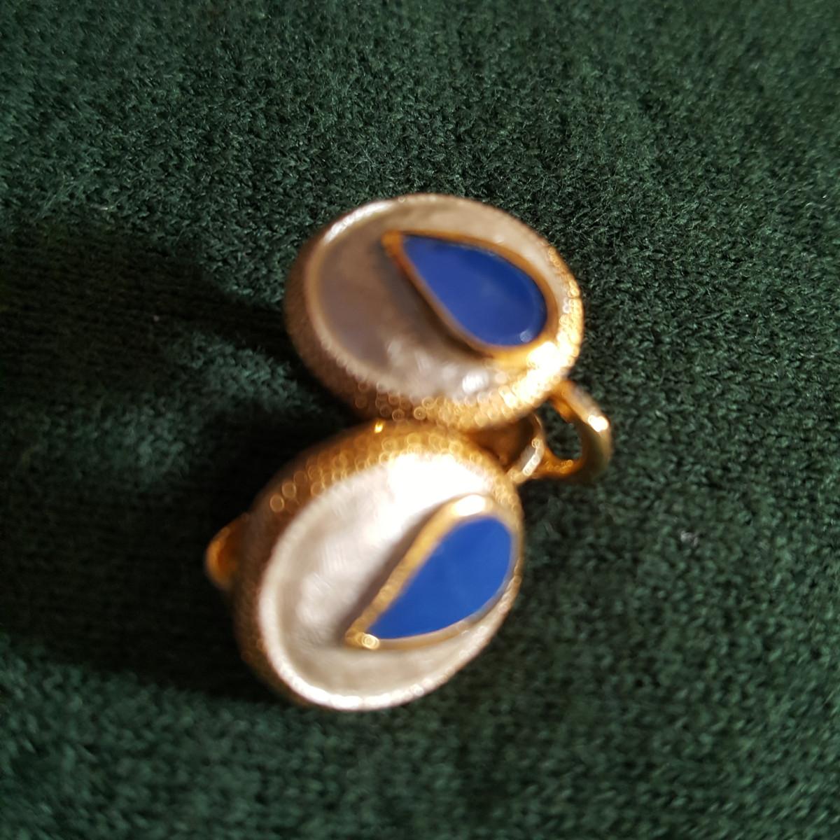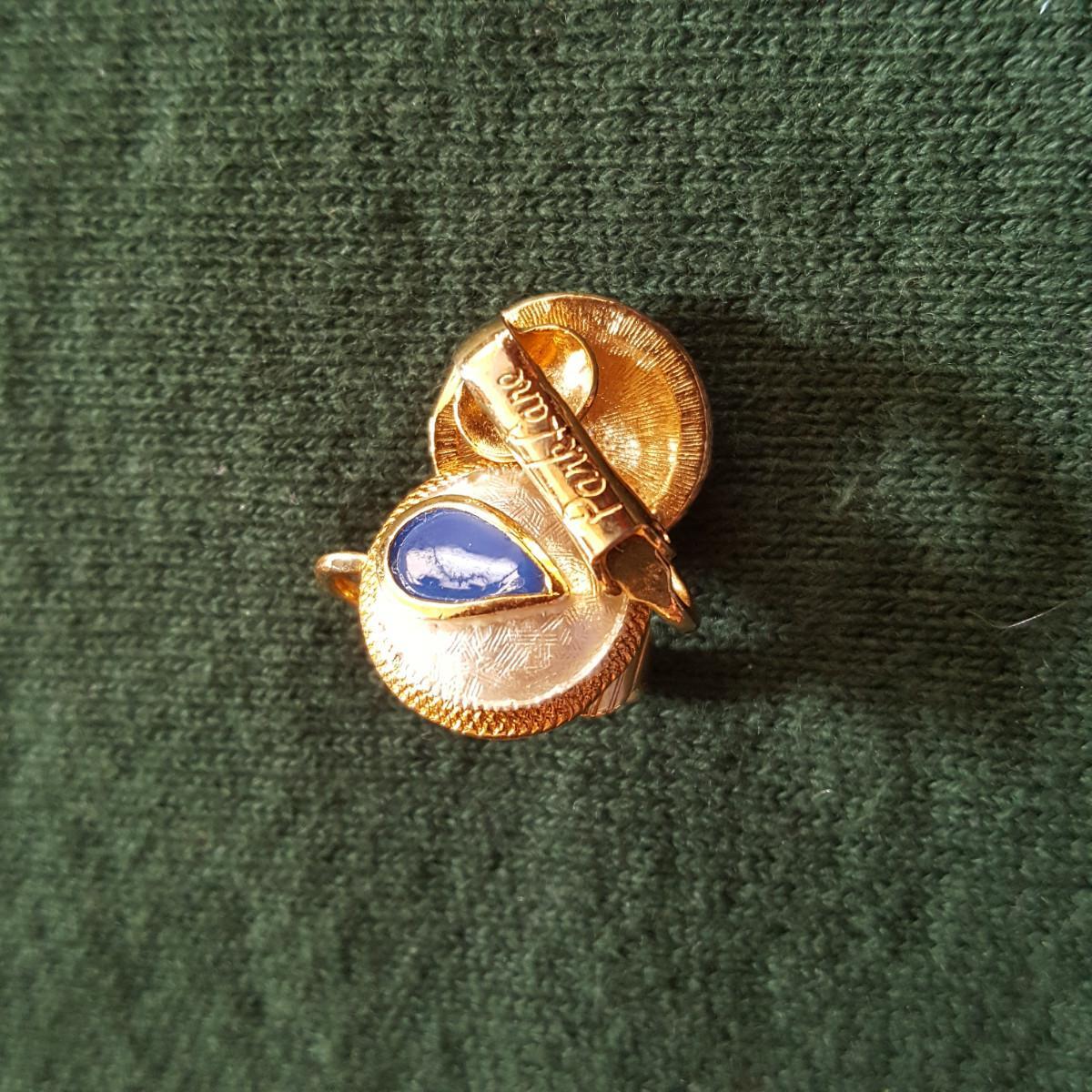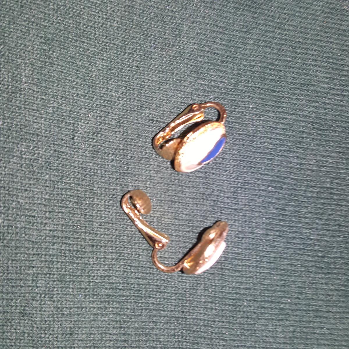 This auction lot is for a pair of Vintage Park Lane Earrings. This earrings are the clip-on style. They are small, measuring about .5-inch in diameter. They seem to depict a blue drop, which appears to be enameled, but you be the judge.