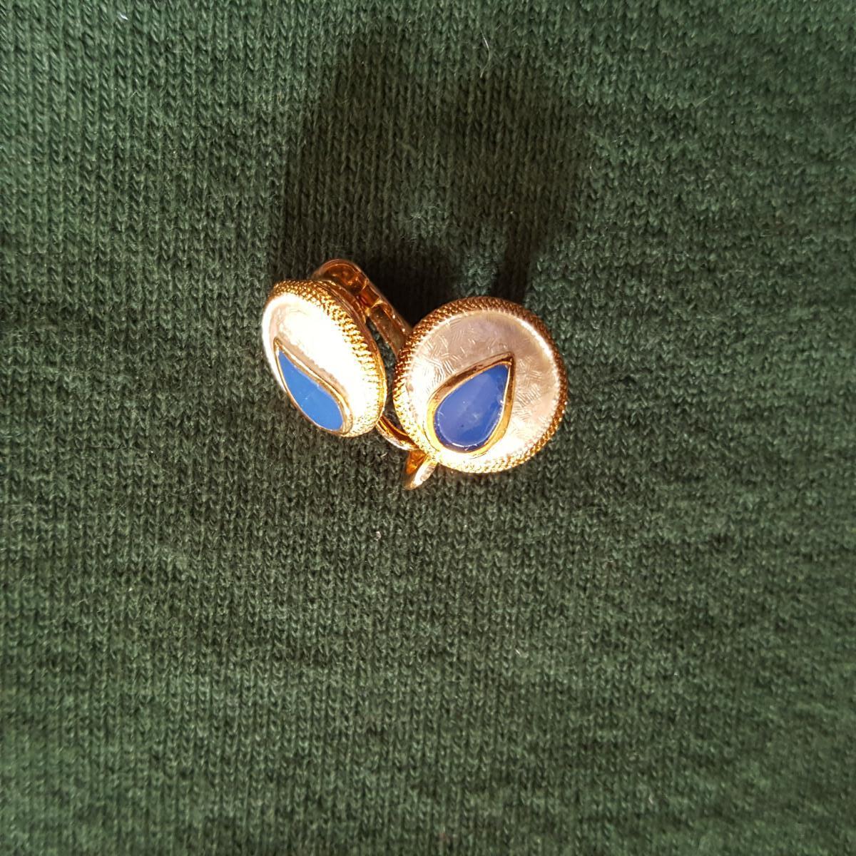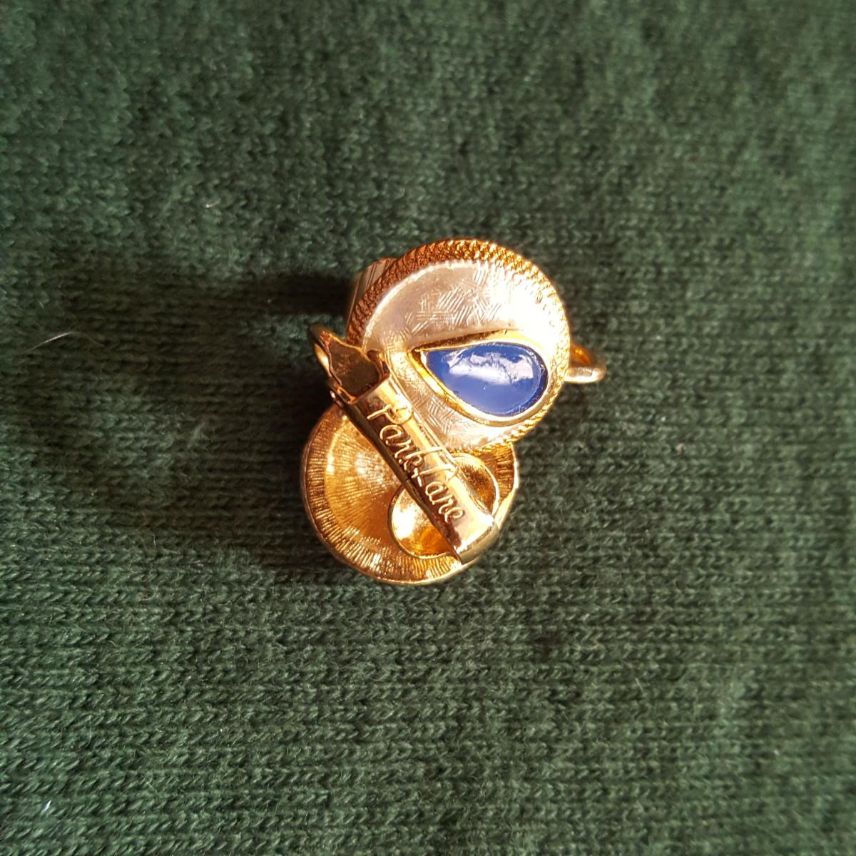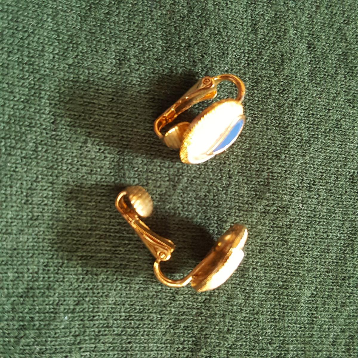 This auction lot is for a pair of Vintage Park Lane Earrings. This earrings are the clip-on style. They are small, measuring about .5-inch in diameter. They seem to depict a blue drop, which appears to be enameled, but you be the judge.