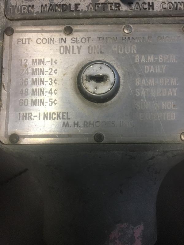 M.H Rhodes, inc. Mark Time turn handle parking meter. No key. What a great decoration in a man cave.