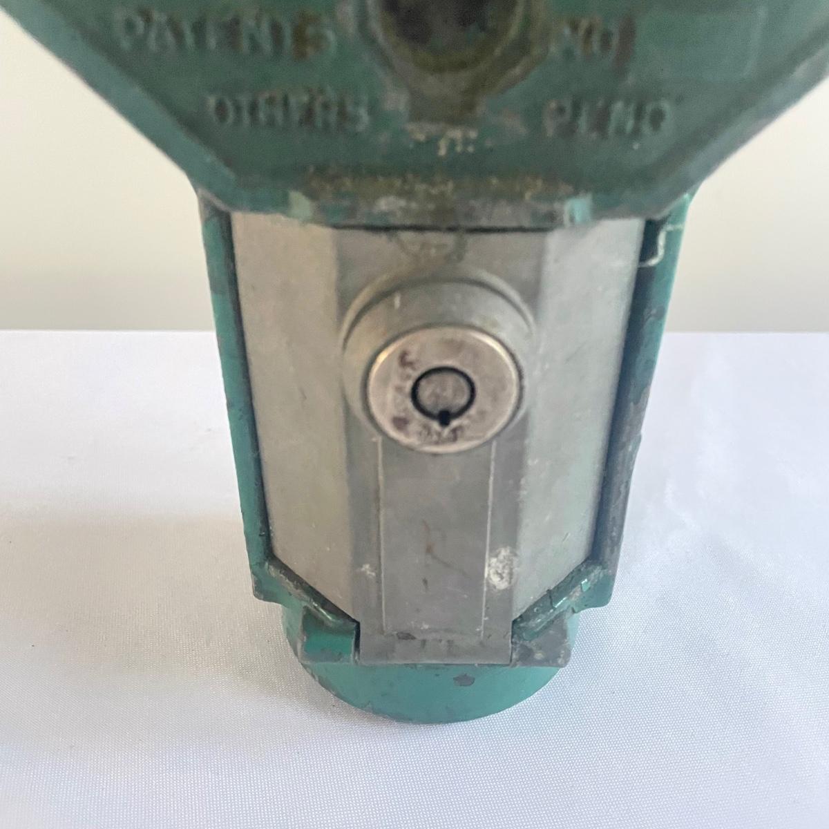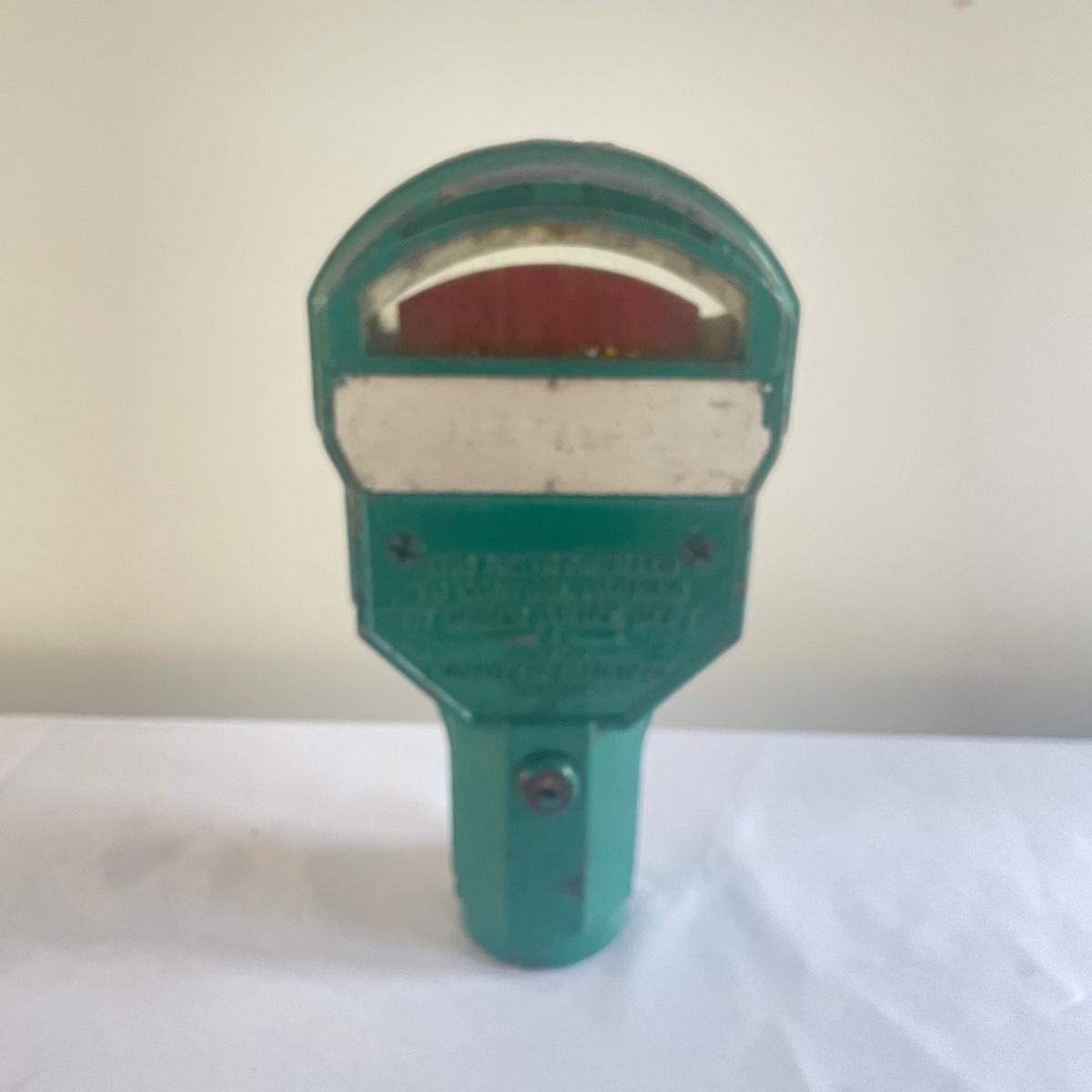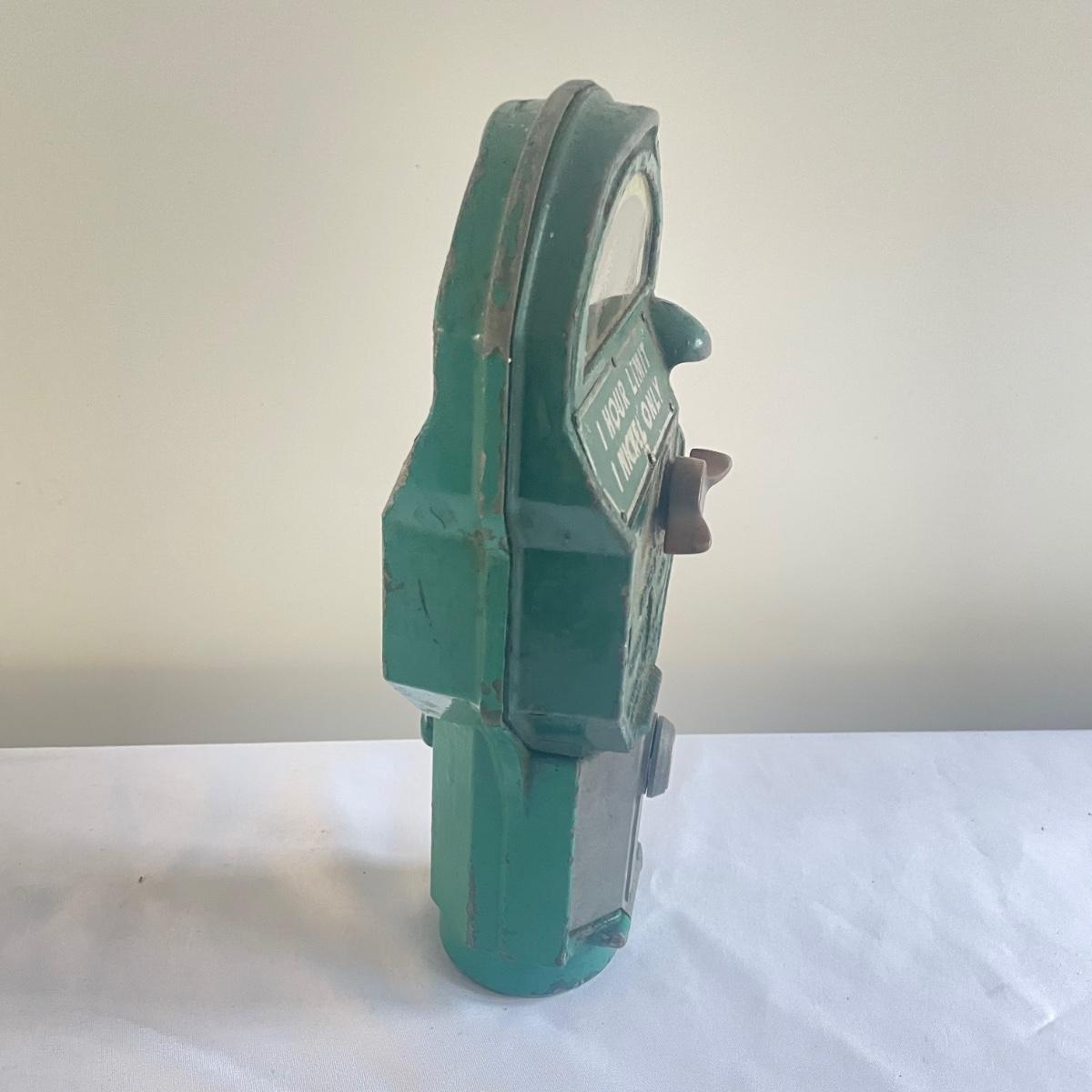 This green painted metal authentic parking meter is in used, but good condition and measures 7” x 4” x 12.5”.