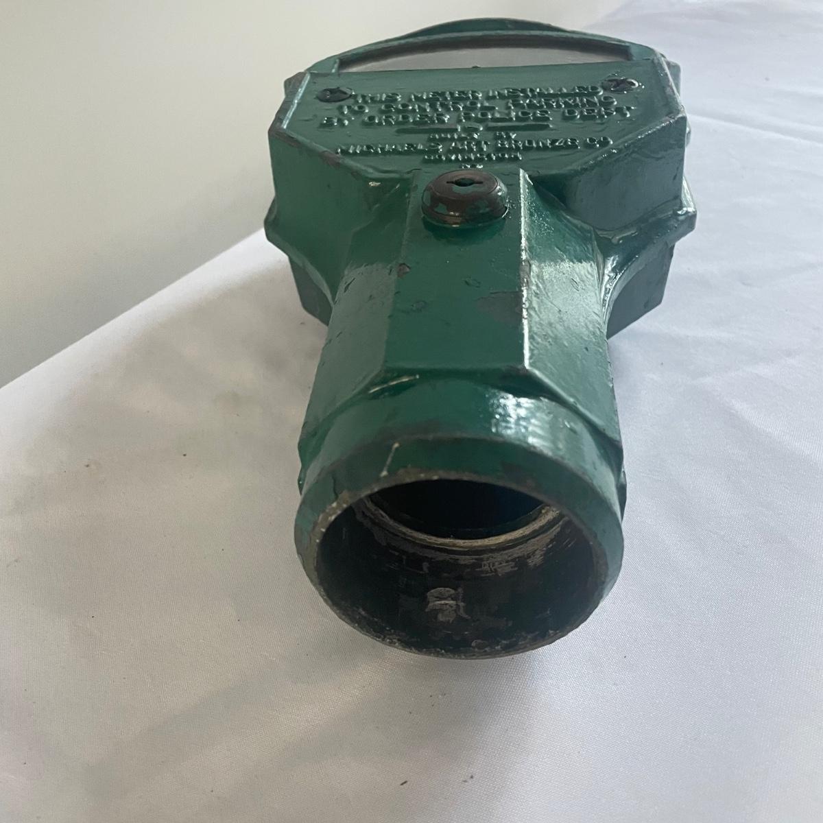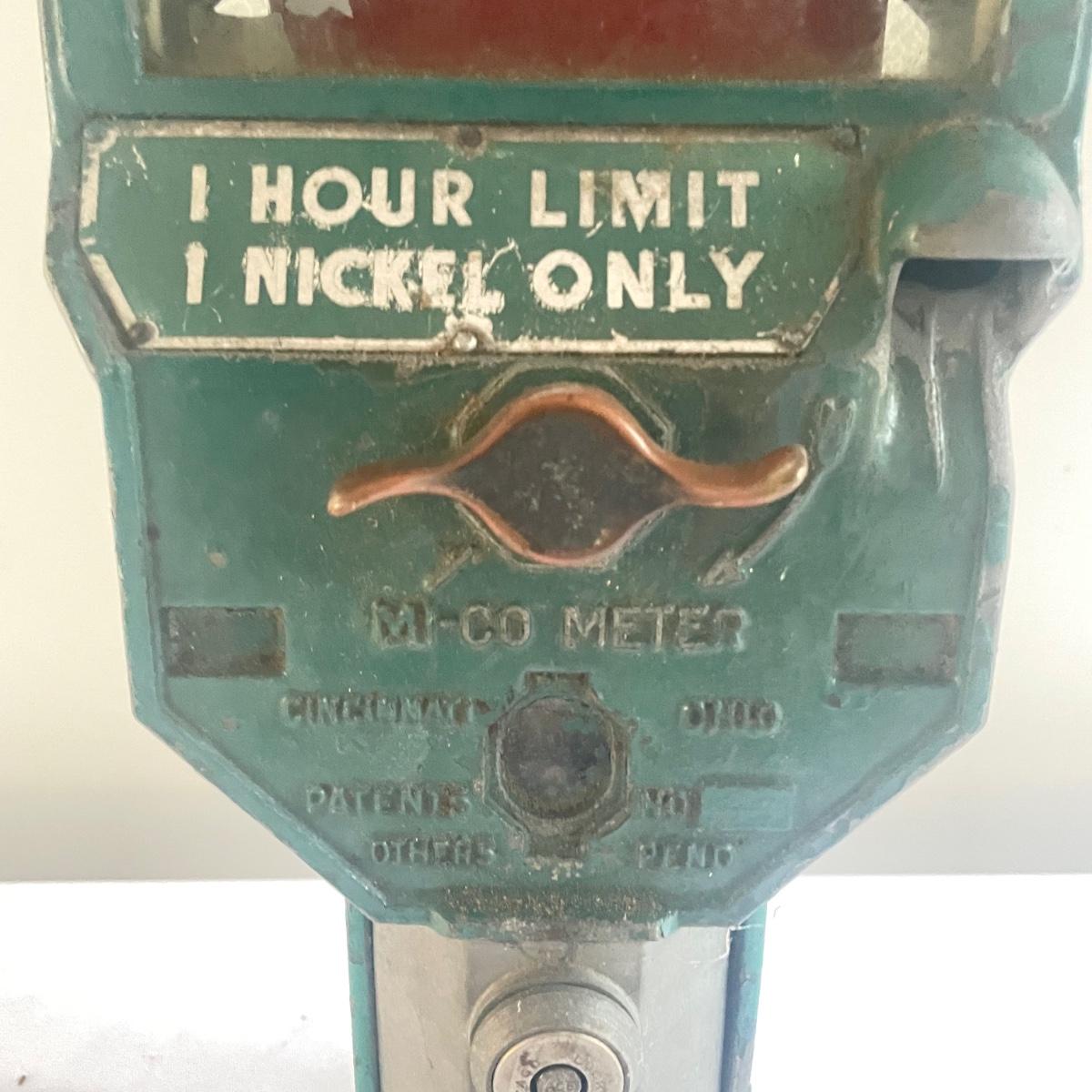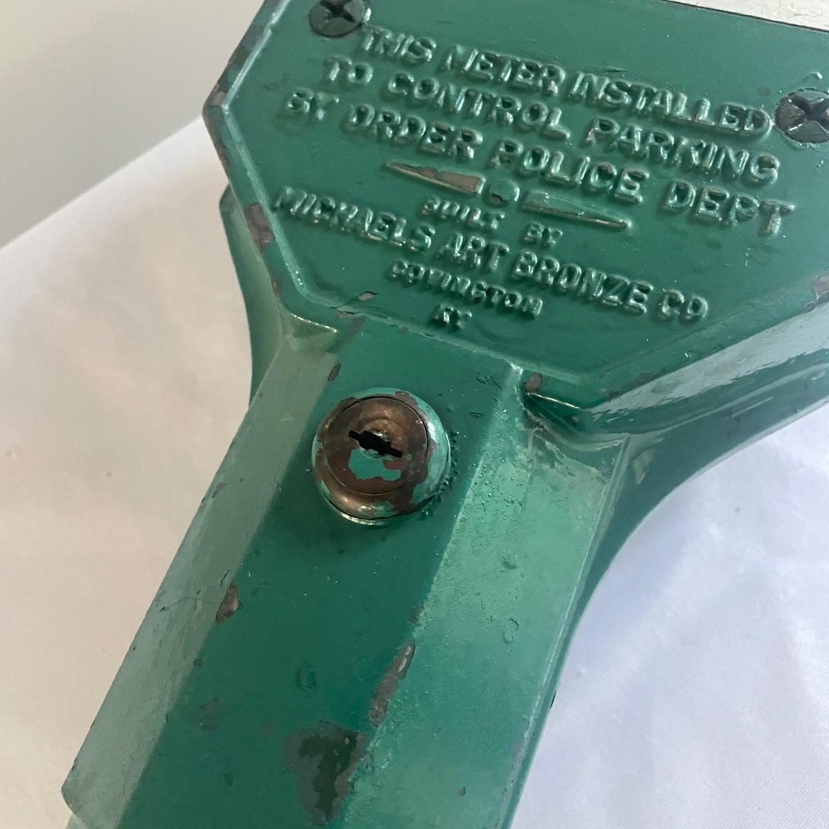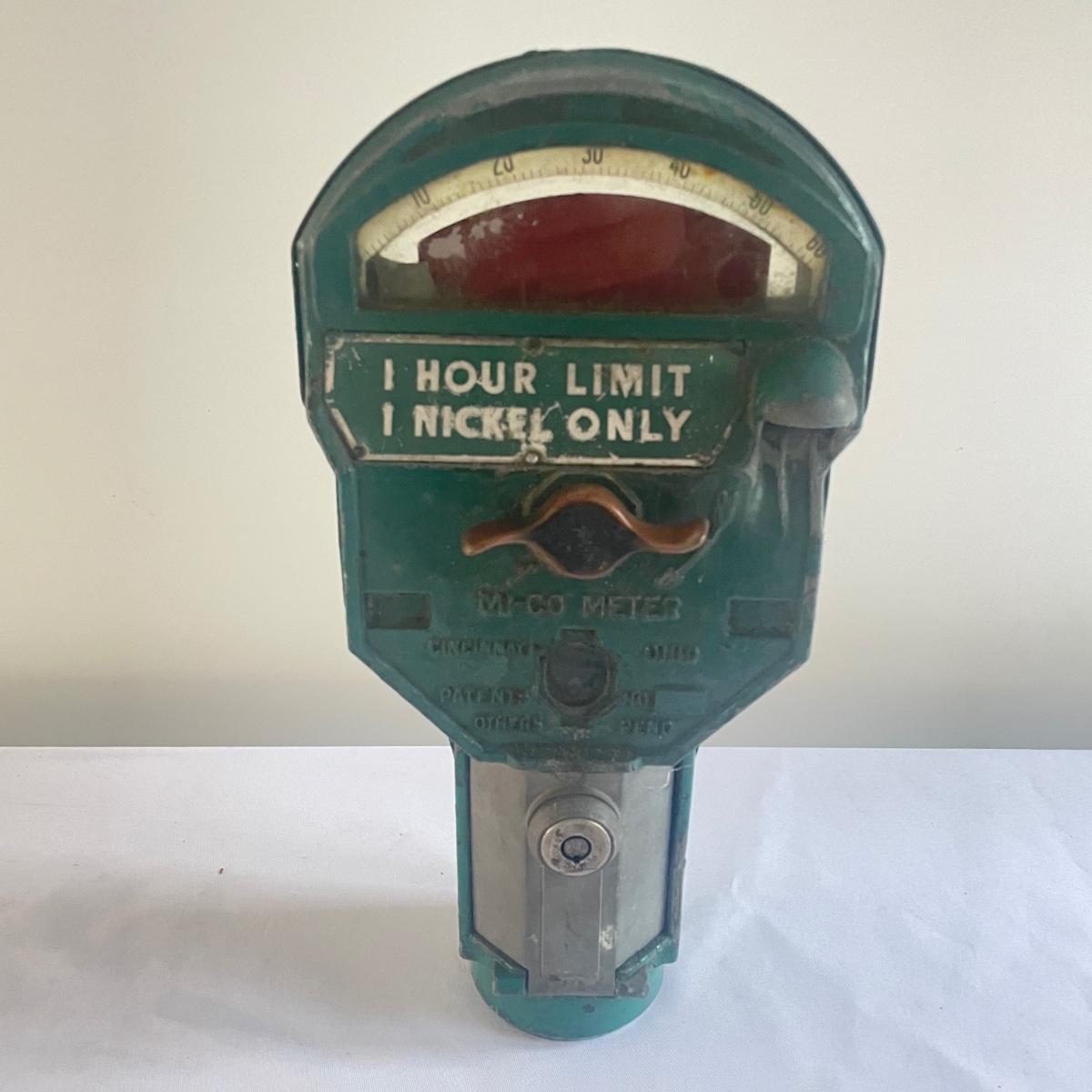 This green painted metal authentic parking meter is in used, but good condition and measures 7” x 4” x 12.5”.