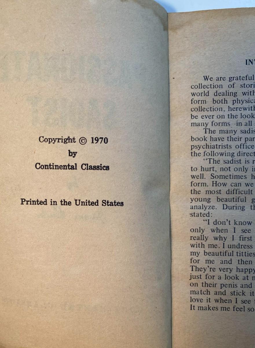 You get one vintage Passionate Sadist by James Burke 1970 softcover book published by Continental Classics in the USA. This item is in English and is in good condition with some wear to its covers and edges. The covers do have some creasing. The binding is tight and the book is complete with no loose pages, This item is 7 inches tall by 4.25 inches wide. These measurements are just approximations to give you an idea of how big, or small, the book is. Please refer to pictures to gauge thickness. Please see all pictures. Thank you for looking. As a reminder, if this is a lot, we do not break up lots. Also, all items are prepacked, so each item is sent individually. Any item that qualifies for media mail and weighs over one pound will be shipped via media mail. Otherwise, the item will be shipped USPS ground advantage, or UPS ground. Shipping for this item is $8.00. Items ship within two days after payment is received. Item SKU is .