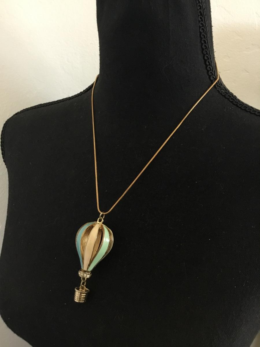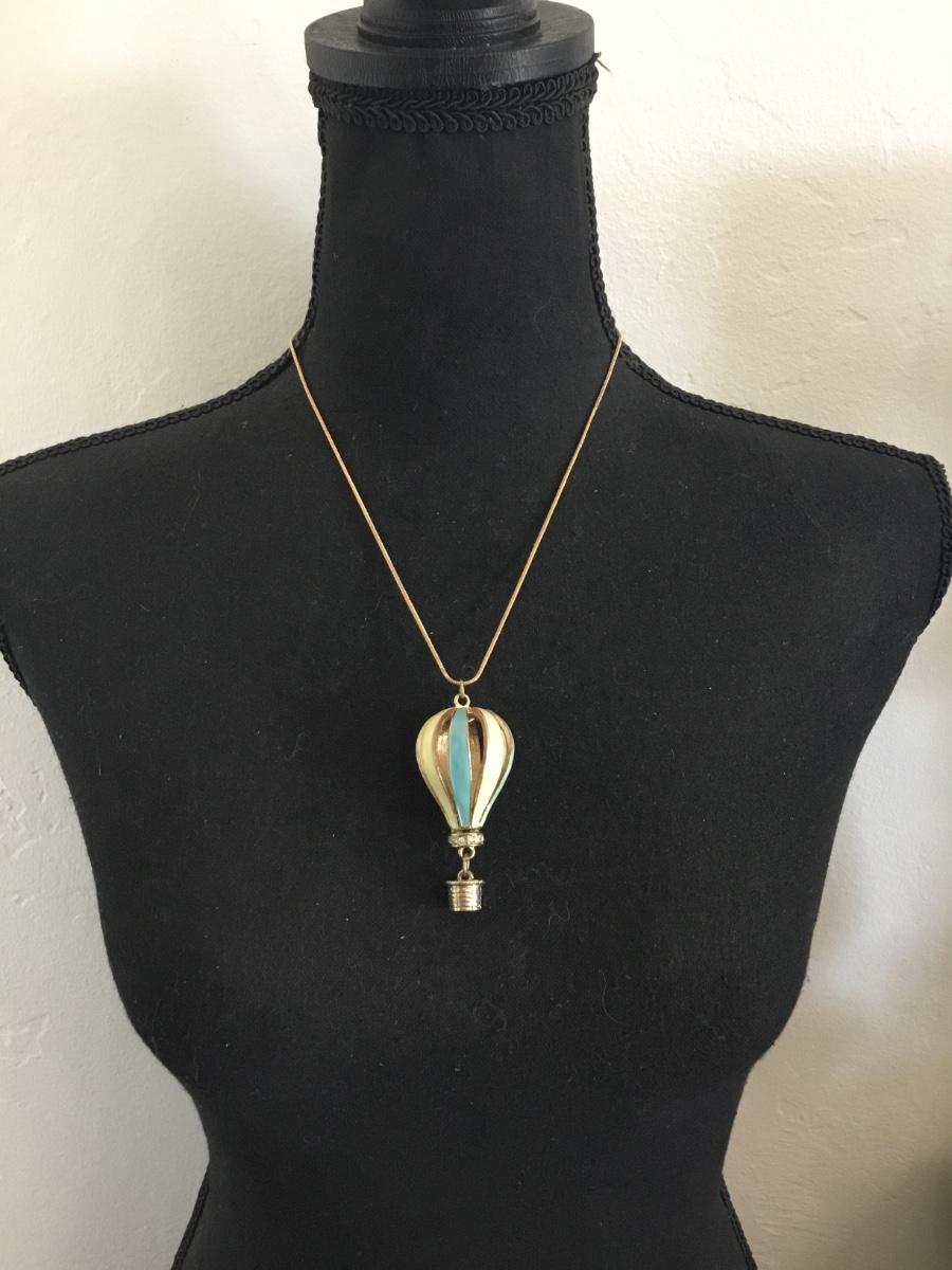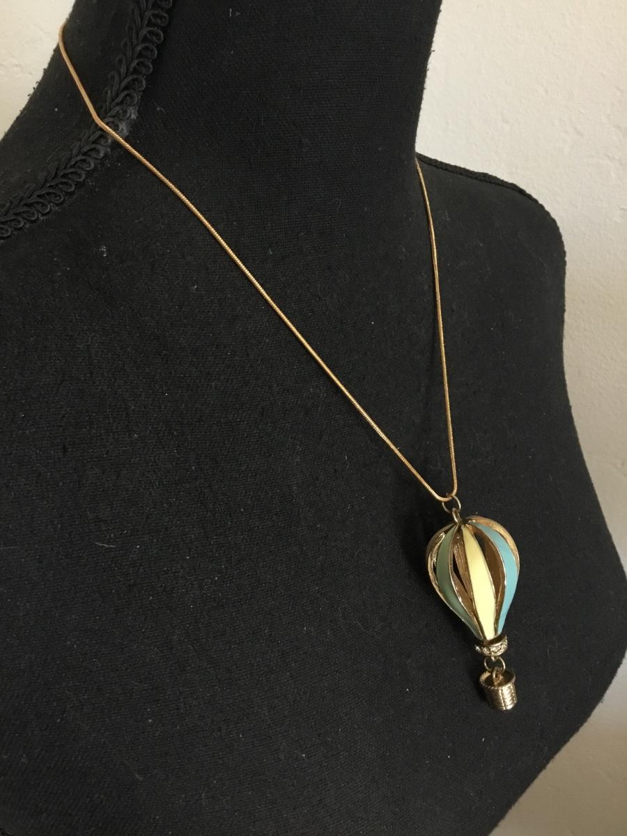 Vintage, pastel, hot air, balloon basket, pendant, gold tone, chain necklace