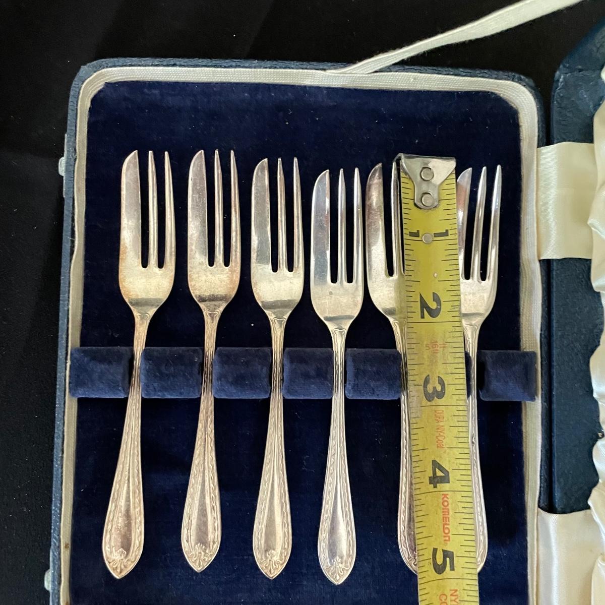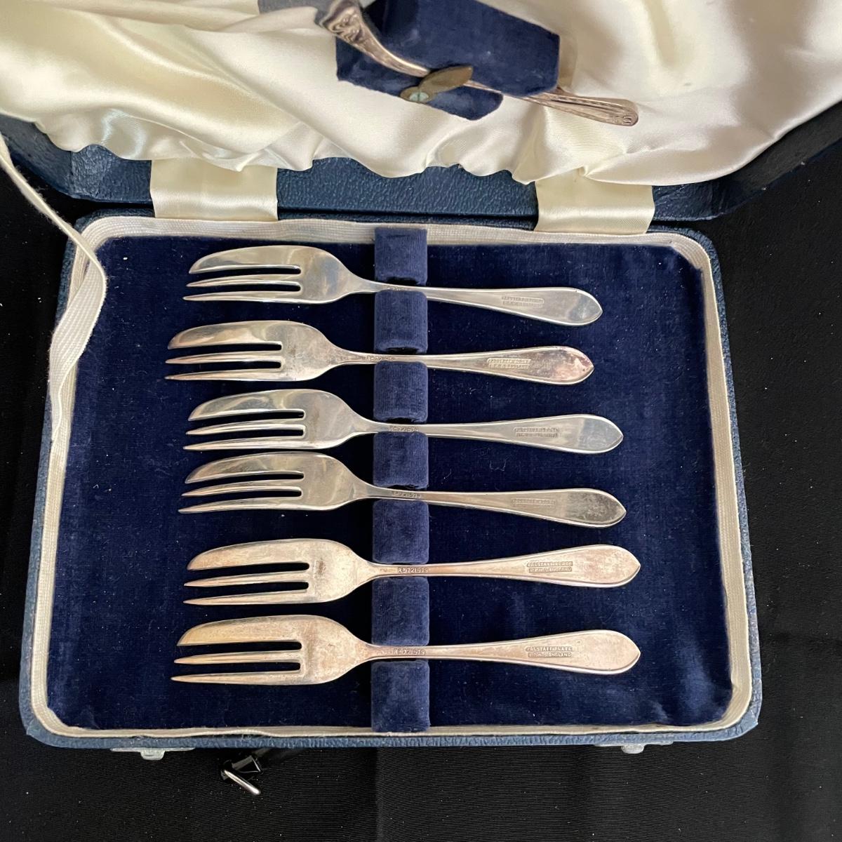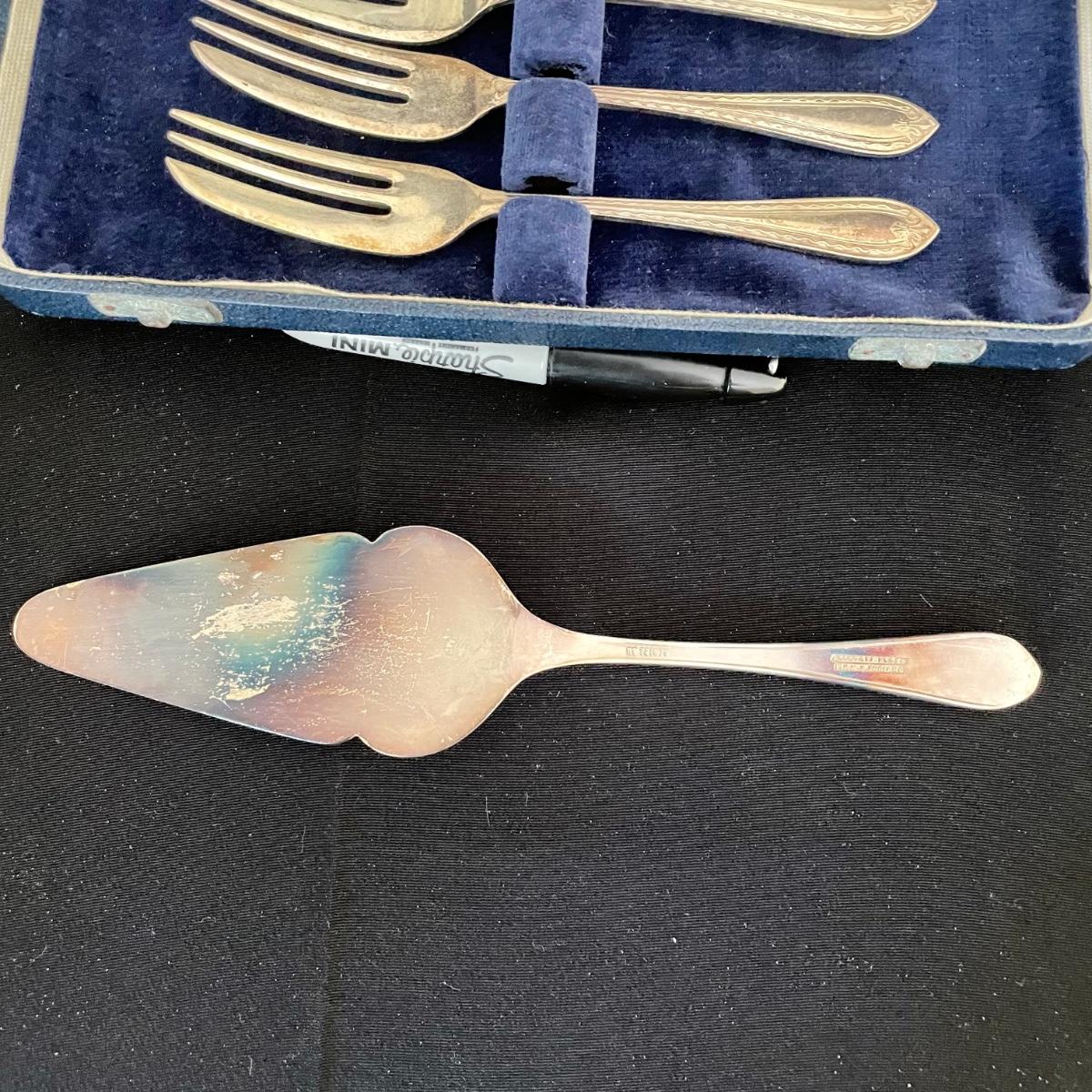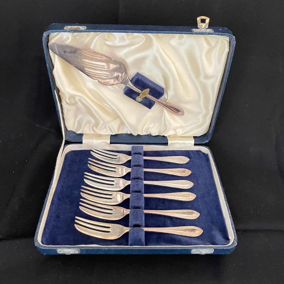 A set of six vintage pastry forks with a matching serving spatula. Cutlery appears to be with its original vinyl covered box. See images. Shipping available.