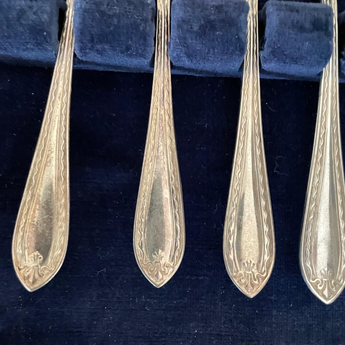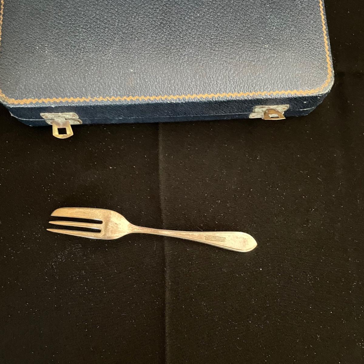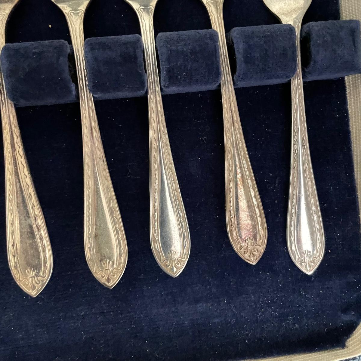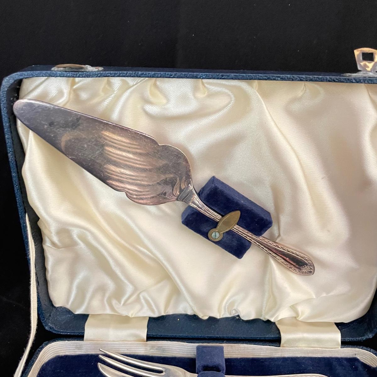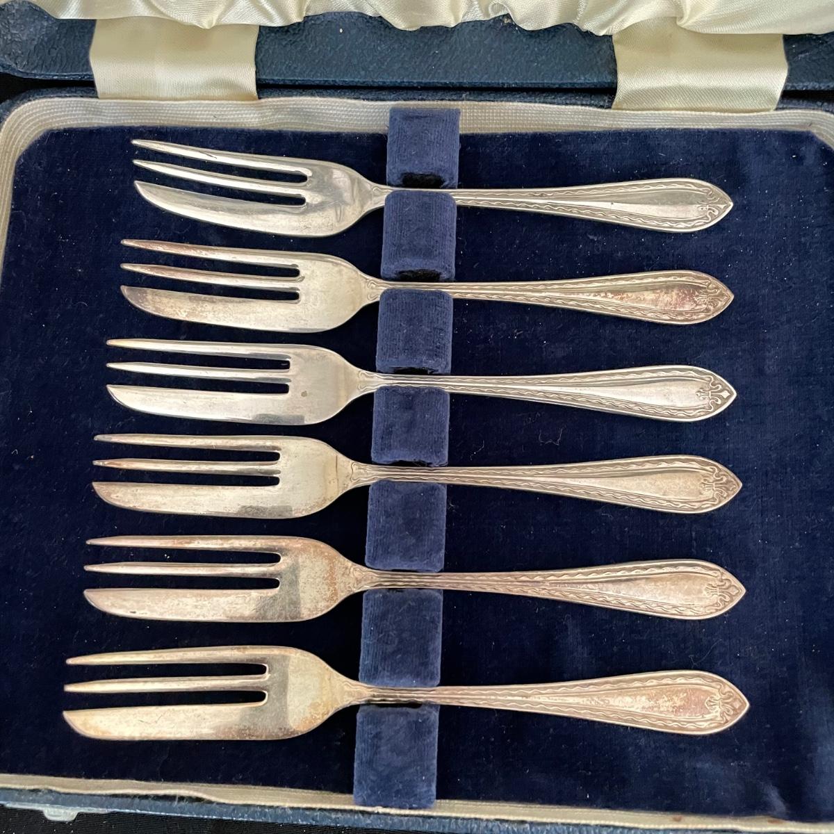 A set of six vintage pastry forks with a matching serving spatula. Cutlery appears to be with its original vinyl covered box. See images. Shipping available.