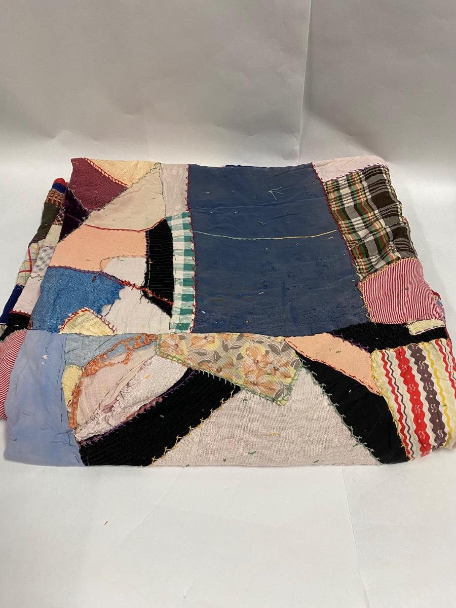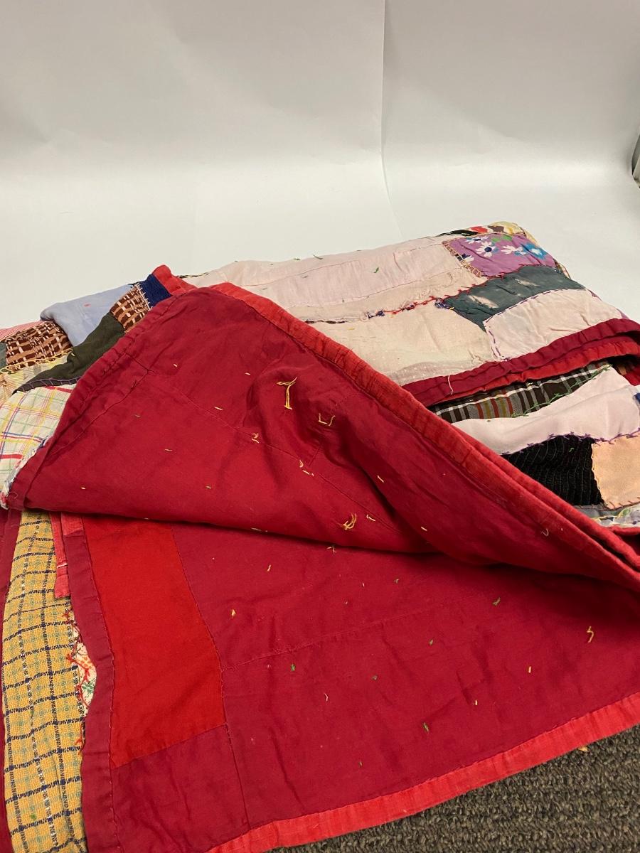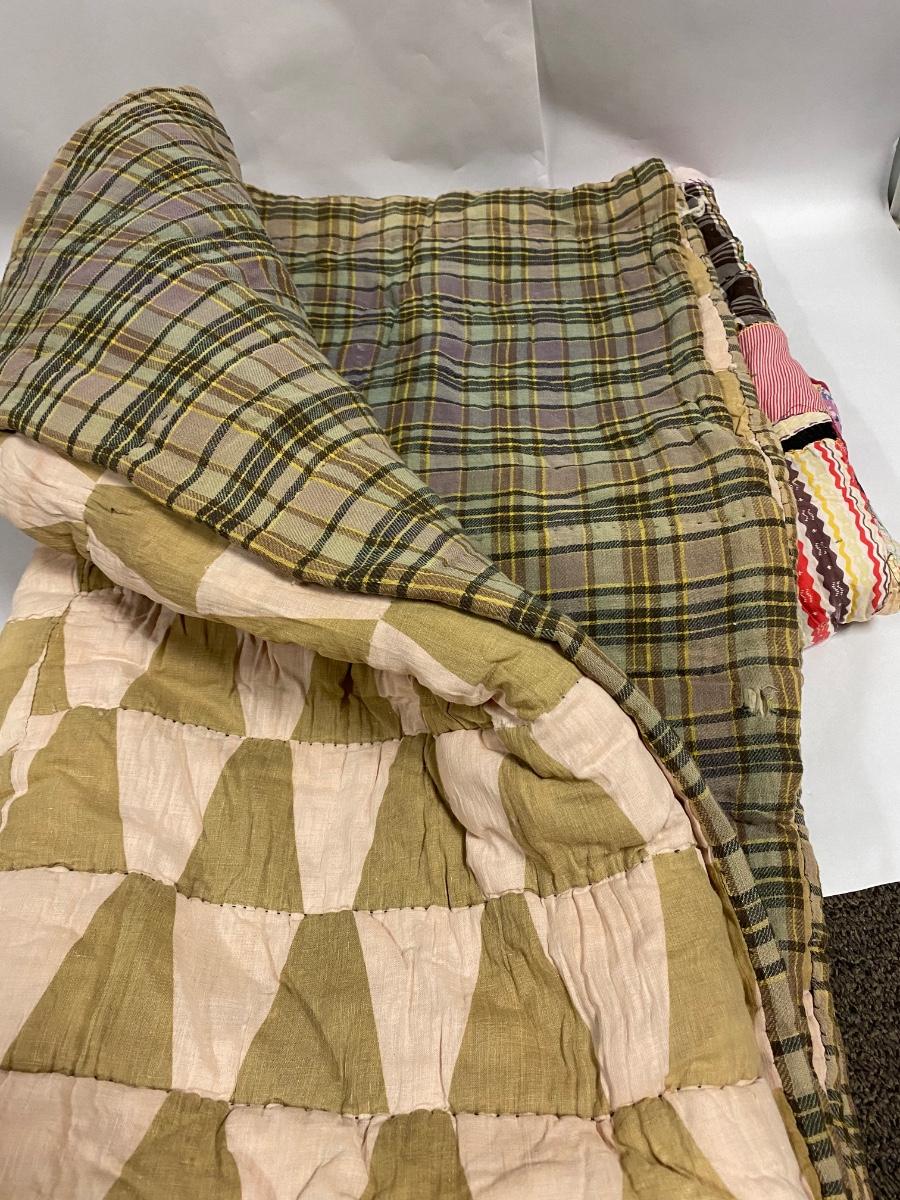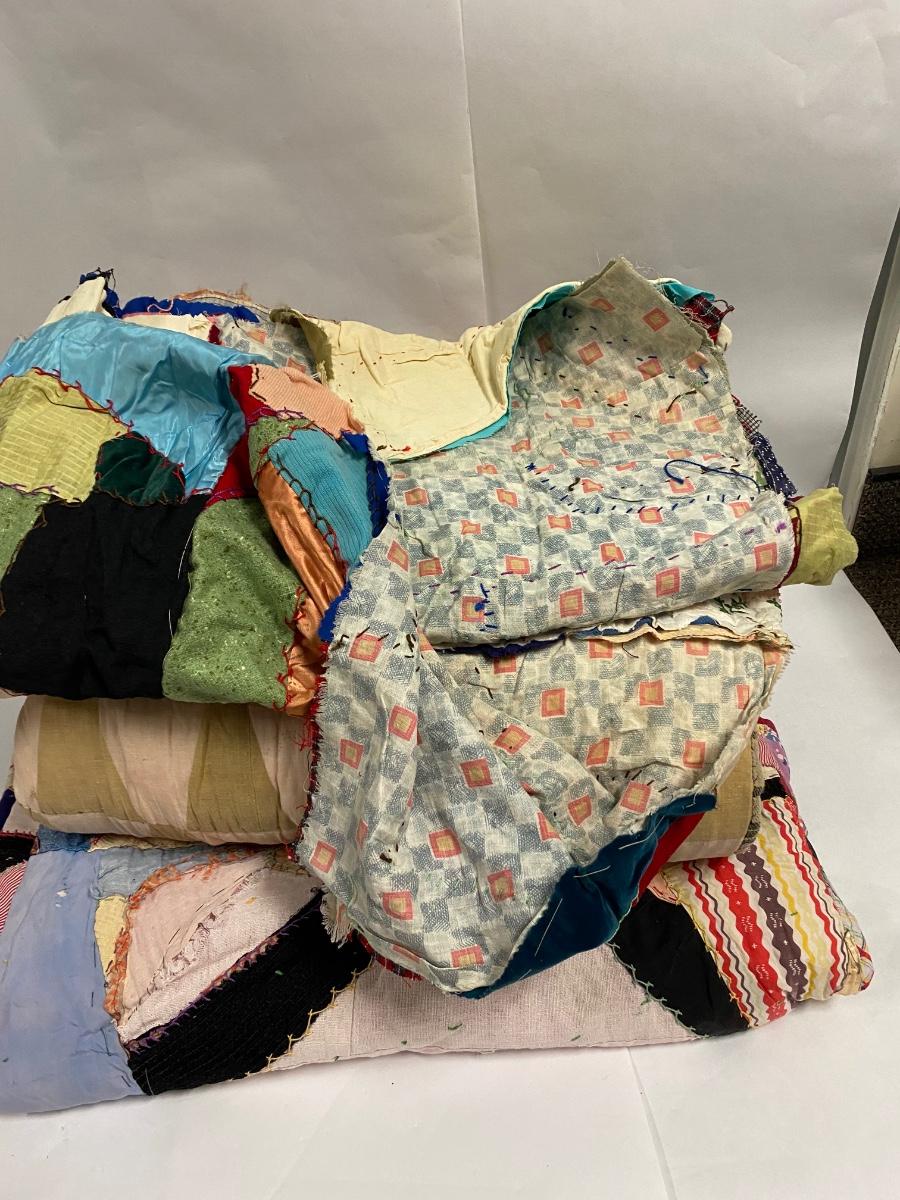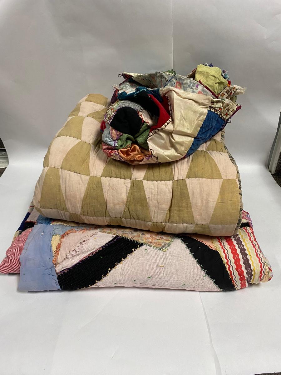 Vintage Patchwork Quilt Blankets. Three different blankets, one is unfinished. All are in fair vintage condition, spots and discolor noticed, may come clean with washing. About 6' size.