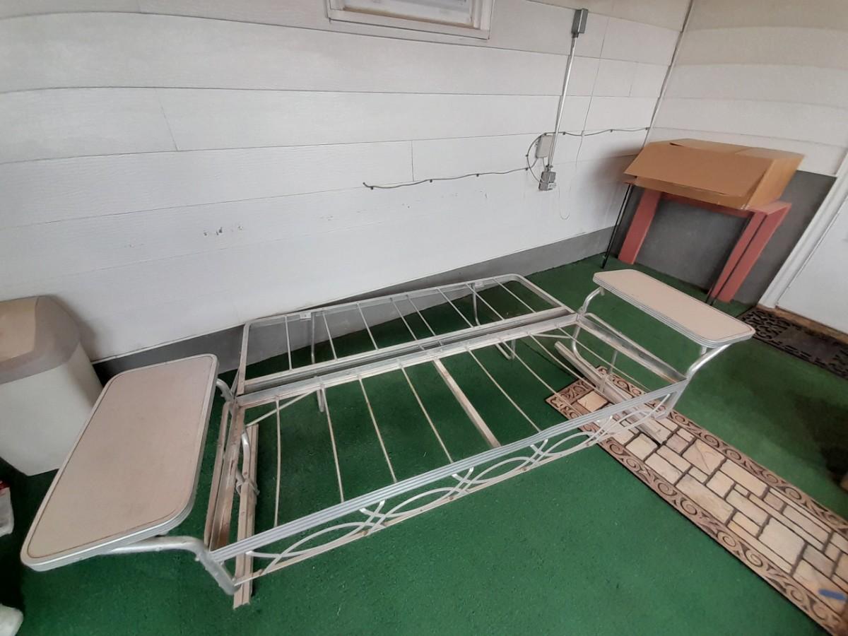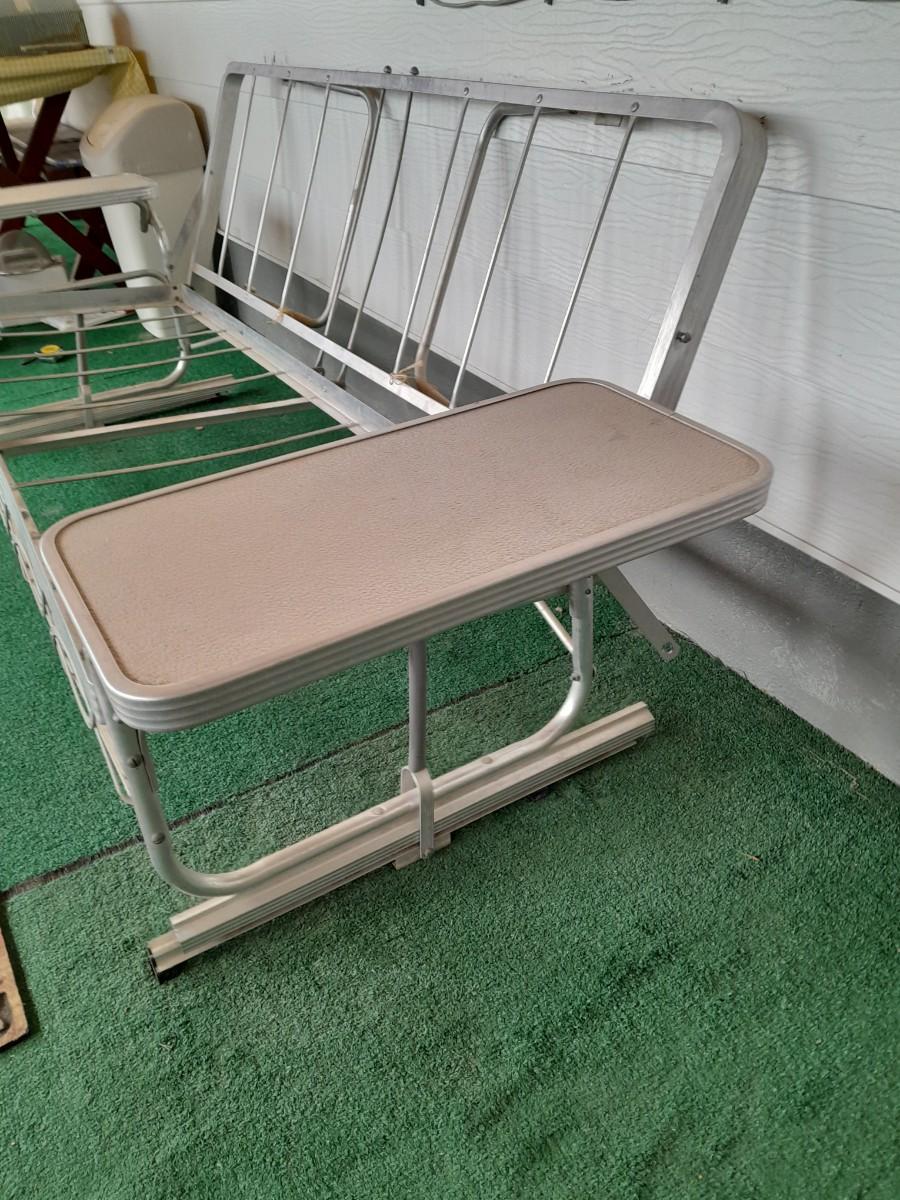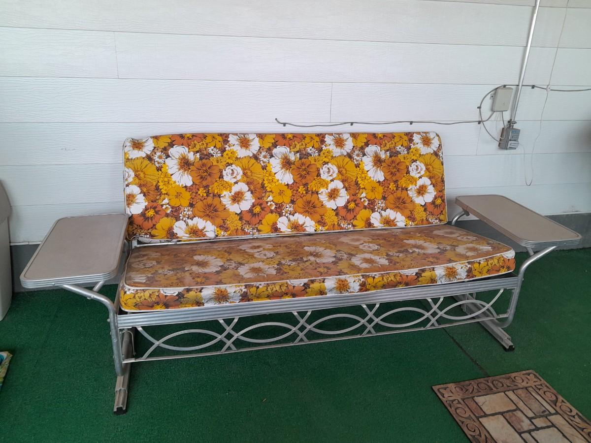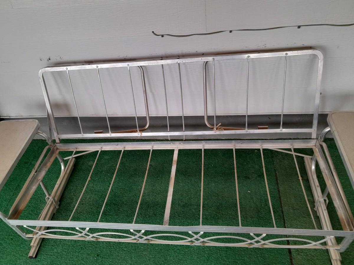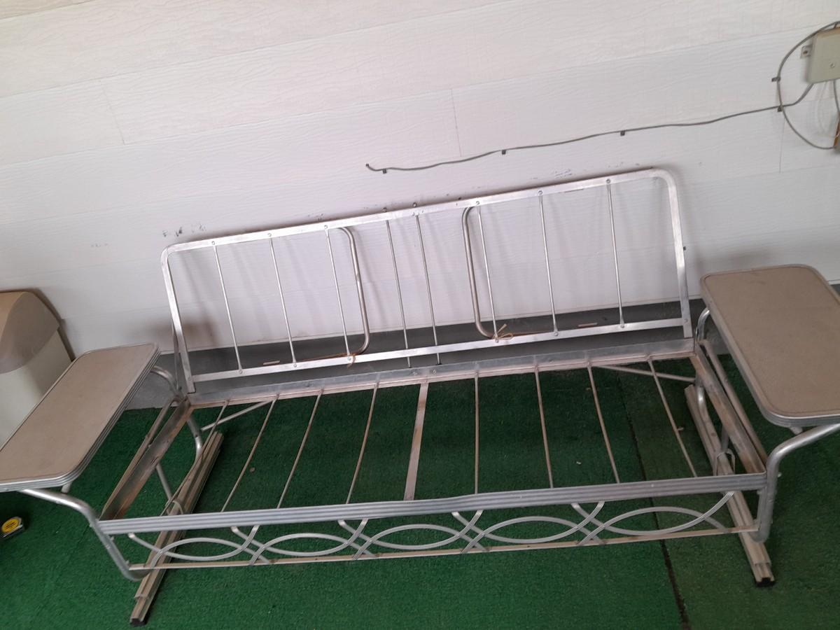 VINTAGE PATIO BENCH / FUTON LIKE LAYS INTO BED WITH TWO ATTACHED SIDETABLES 30" X 88" X 30" AND OUTDOOR BLANKET COVER