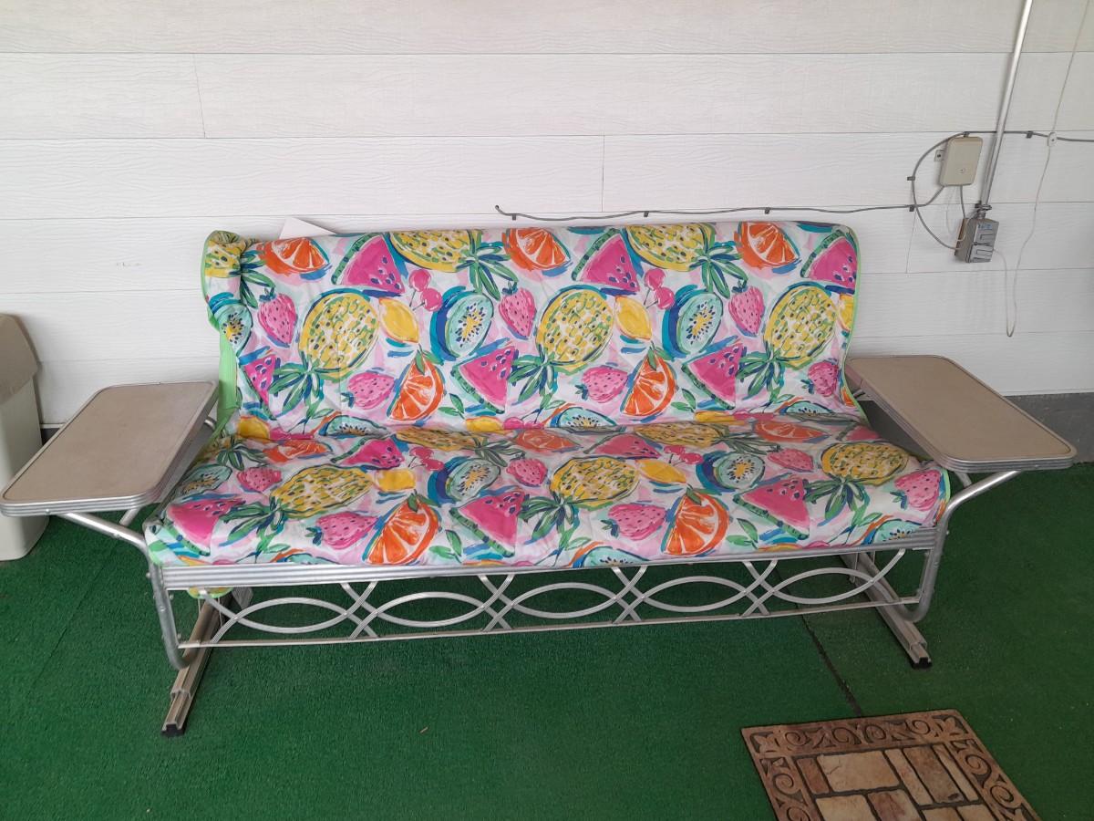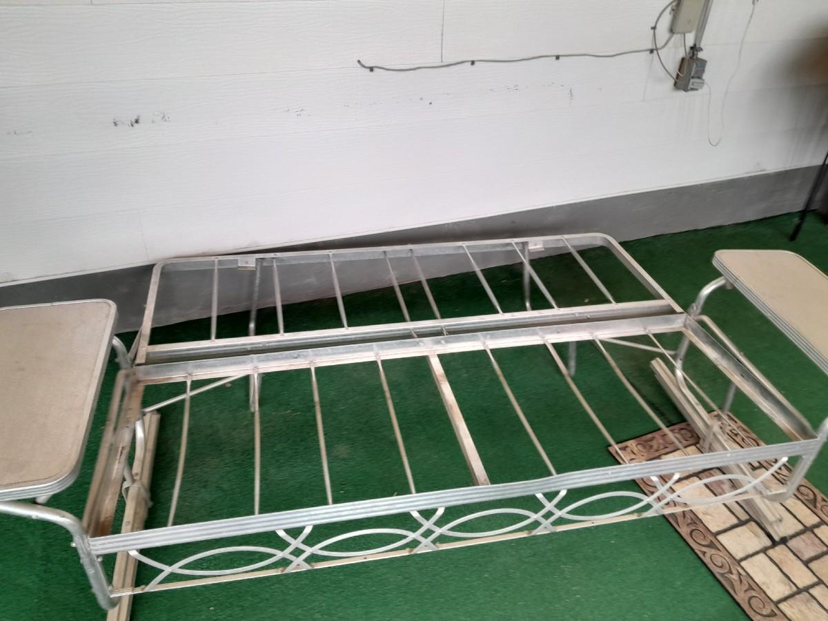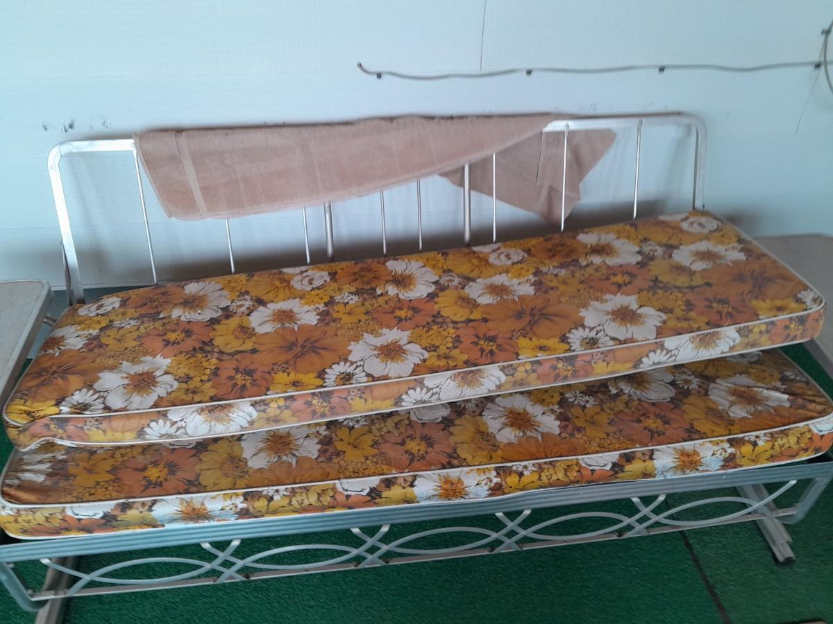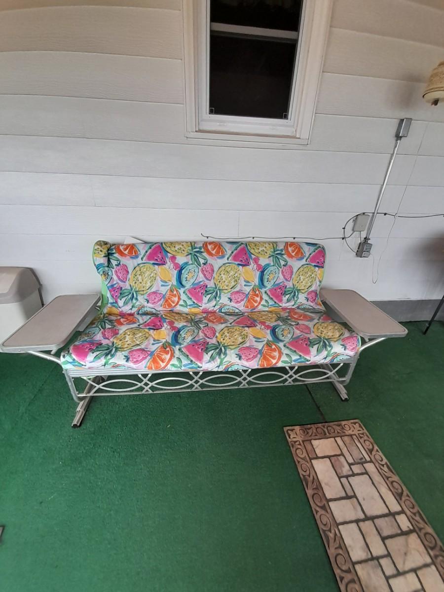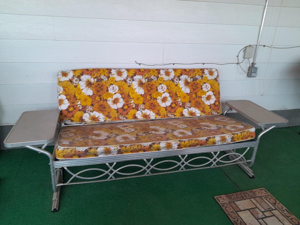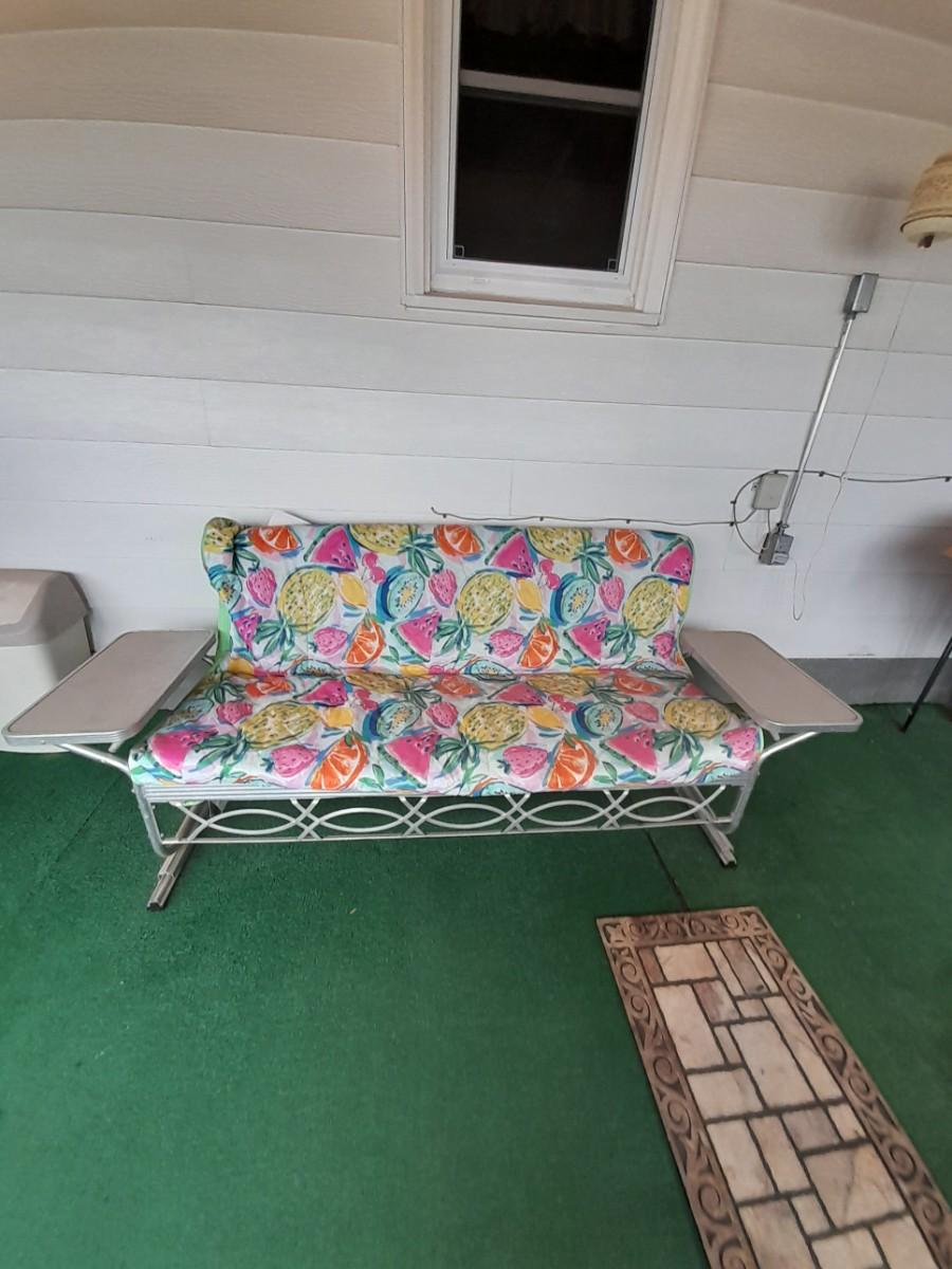 VINTAGE PATIO BENCH / FUTON LIKE LAYS INTO BED WITH TWO ATTACHED SIDETABLES 30" X 88" X 30" AND OUTDOOR BLANKET COVER