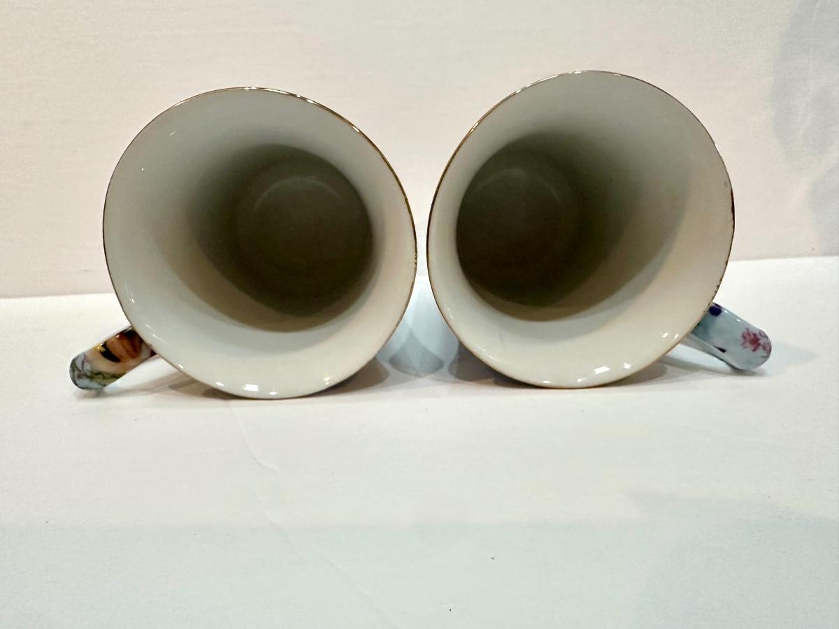 Two dessert plates and two porcelain pedestal footed tea cups. In excellent condition!