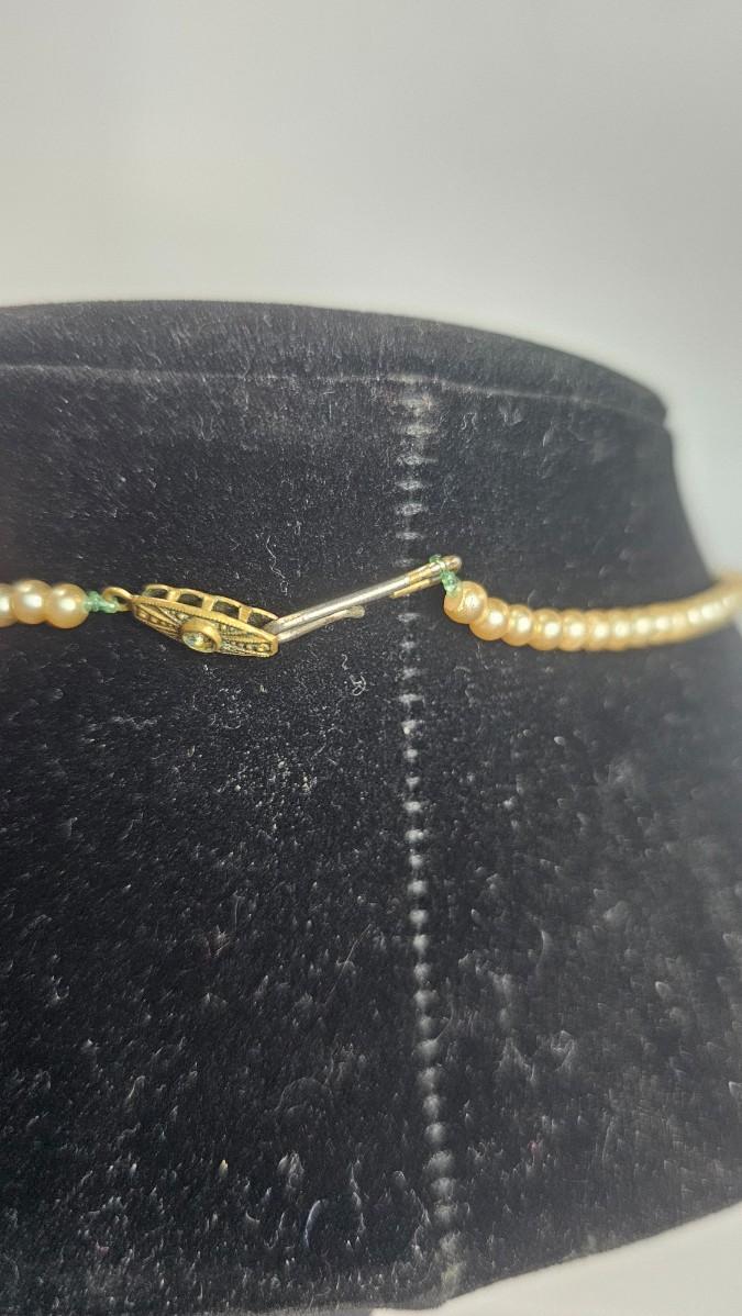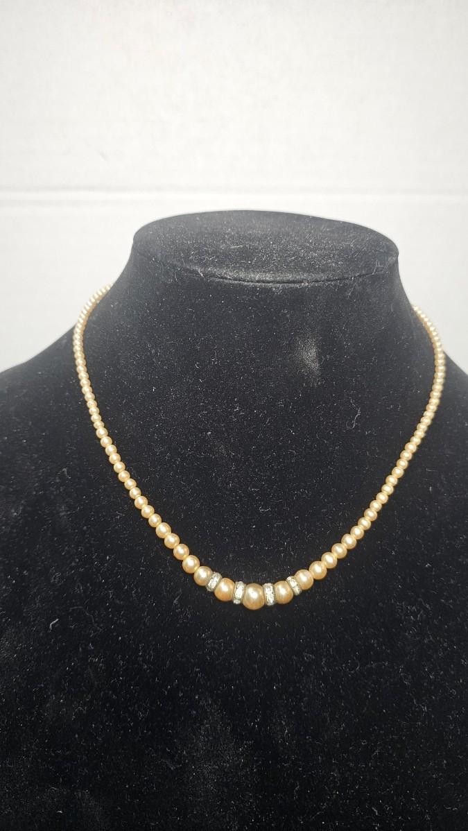 This elegant vintage pearl necklace features warm peach-toned faux pearls arranged in a classic graduated strand, highlighted at the center by sparkling rhinestone spacer accents. The soft luster of the pearls is complemented by the subtle brilliance of the spacers, creating a refined and timeless presentation suitable for both vintage collectors and everyday elegance.
